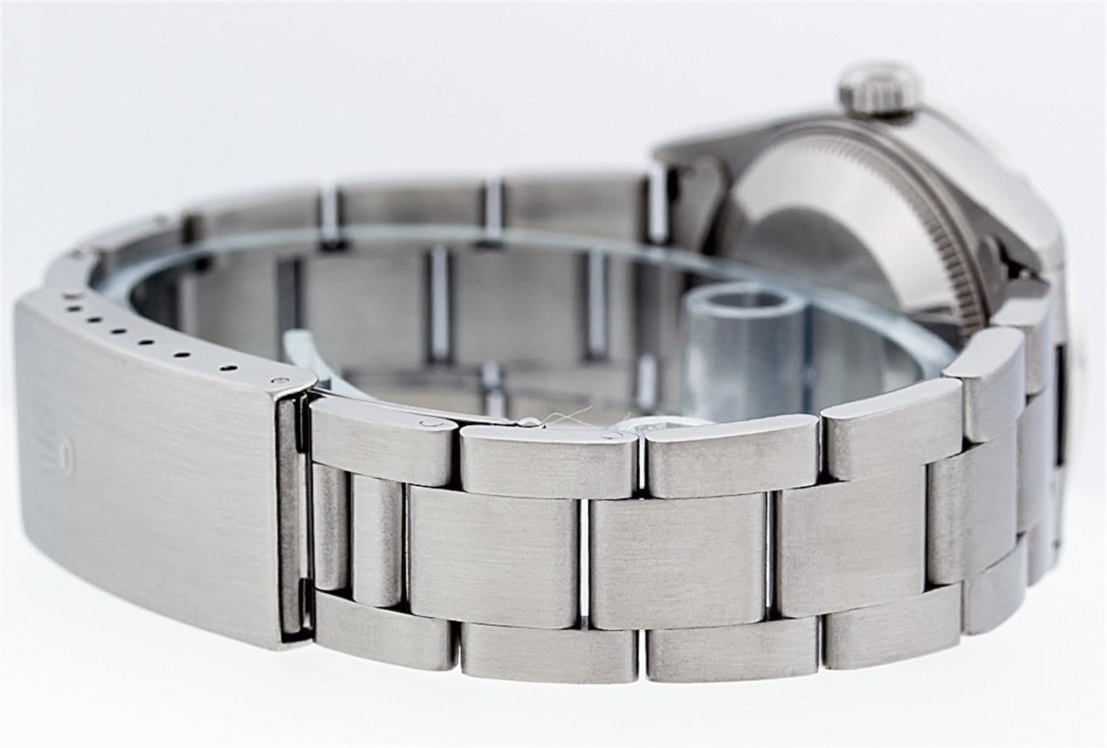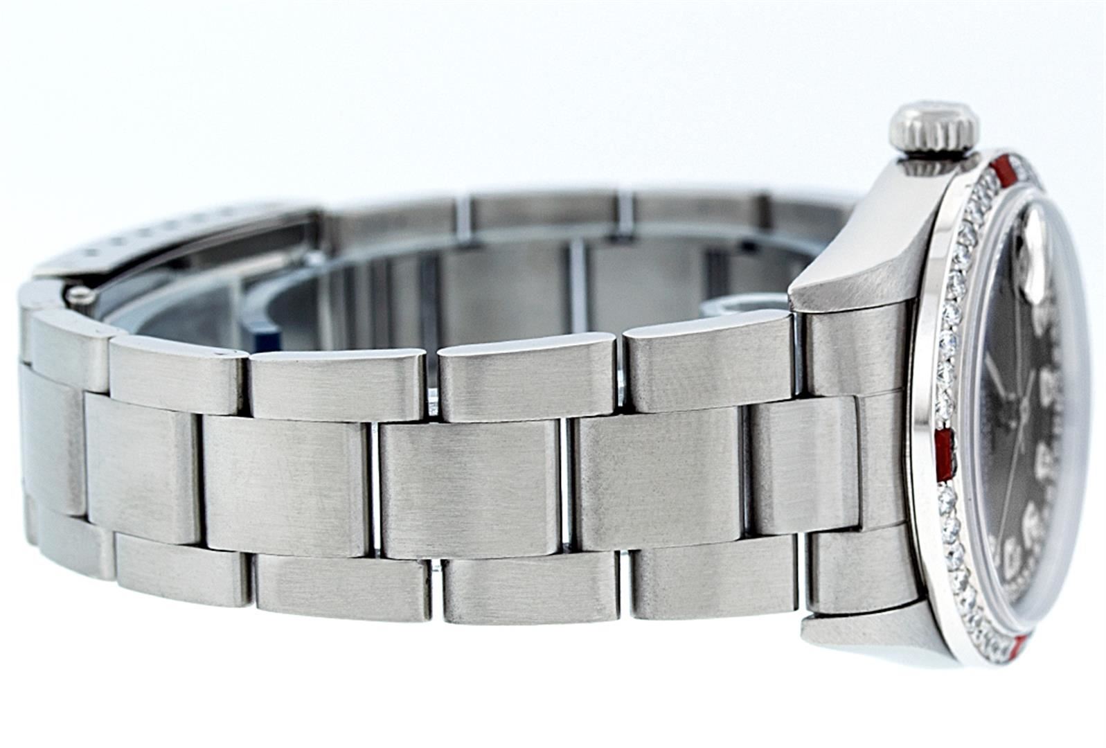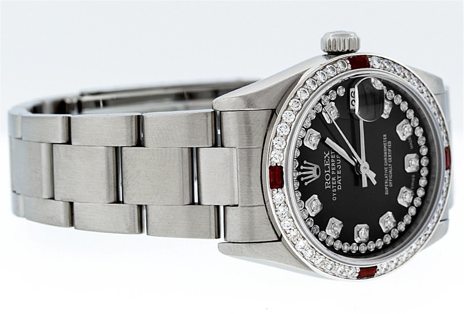One Midsize Stainless Steel Rolex Datejust Polished, Serviced & Electronically Tested, Stainless Steel Case Case:31mm, Stainless Steel Crown, Custom Bezel: 18K White Gold Ruby Beadset Bezel, Diamond Count: 40 Diamonds + 4 Ruby, Total Weight: 1 Carat, Color: G To H, Clarity: VS2-SI1. Custom Crystal: Synthetic Sapphire Cyclops Lens. Movement: Automatic Winding Movement Caliber 2235. Custom Dial: Black String Diamond Dial VVS. Color: G to H, Clarity: VVS, Date Window: 3 O'Clock Position Date Display, Quickset, Model: Midsize Datejust. Condition: G-6 Extra Fine The Watch Is In Very Good Condition Free Of All Scratches And Dents. Bracelet: Stainless Steel Oyster Band. Bright Polish. 6.0 Inch Length, Adjustable. Standard Clasp, With Rolex Logo.