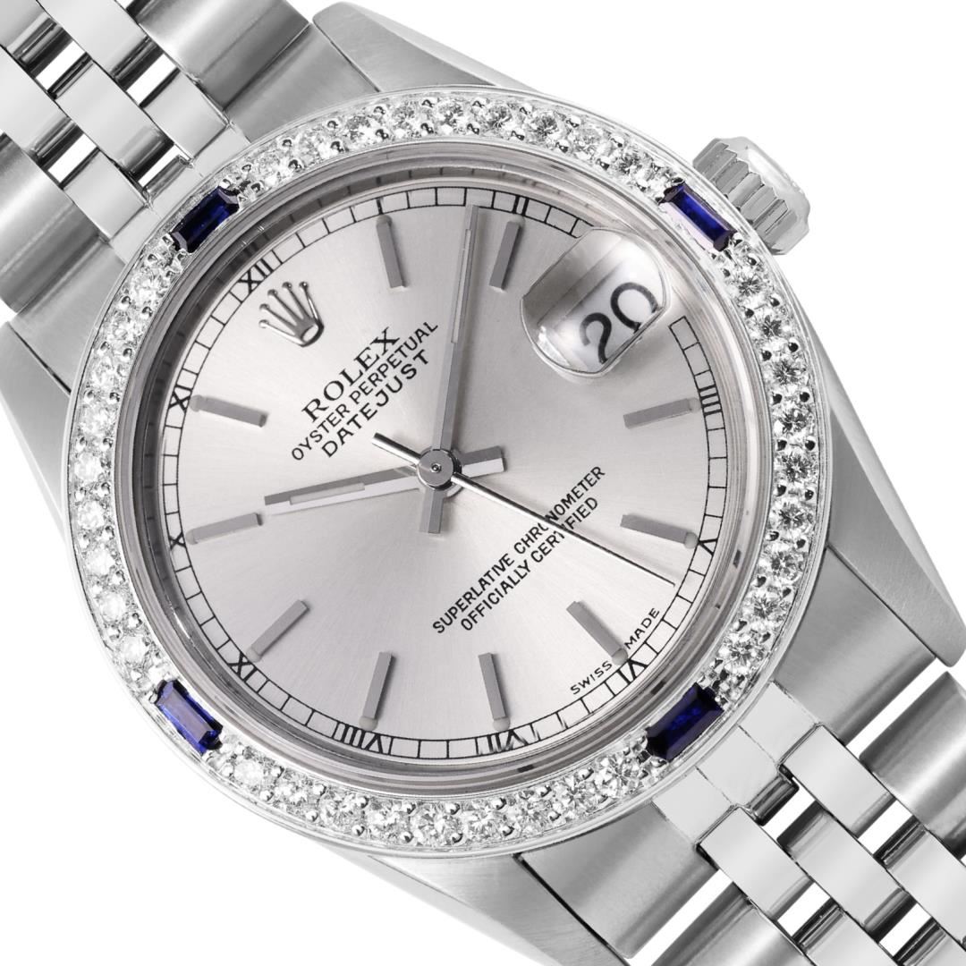 One Rolex Midsize 31MM Quickset Pre Owned Stainless Steel Datejust Wristwatch Polished Bright with Satin Finish, Serviced & Electronically Tested, Stainless Steel Case: 31mm, Stainless Steel Crown, Custom Bezel: New 18K White Gold Sapphire Beadset Diamond Bezel, Diamond + Gem Count: 36 Diamonds + 4 Sapphires, Clarity: SI-VS, Color: G to H. Crystal: Sapphire With Magnified Date Window. Hands: Luminescent Hands. Rolex Movement: Automatic Winding Movement 2235. Rolex Dial: Factory Silver With Index Hour Markers, Lumi Dots, and Roman Track. Date Window: 3 O'Clock Position Date Display, Model: 31MM Quickset Datejust. Condition: G-6 Extra Fine. Rolex Bracelet: Stainless Steel Jubilee Band. Bright Polish & Satin Finish. 6.0 Inch Length, Adjustable. Fold Clasp, With Rolex Logo. This Watch Has Been Serviced Time Tested And Is In Excellent Condition It Is Free Of All Scratches And Dents. This Watch Comes With A Rolex Box.