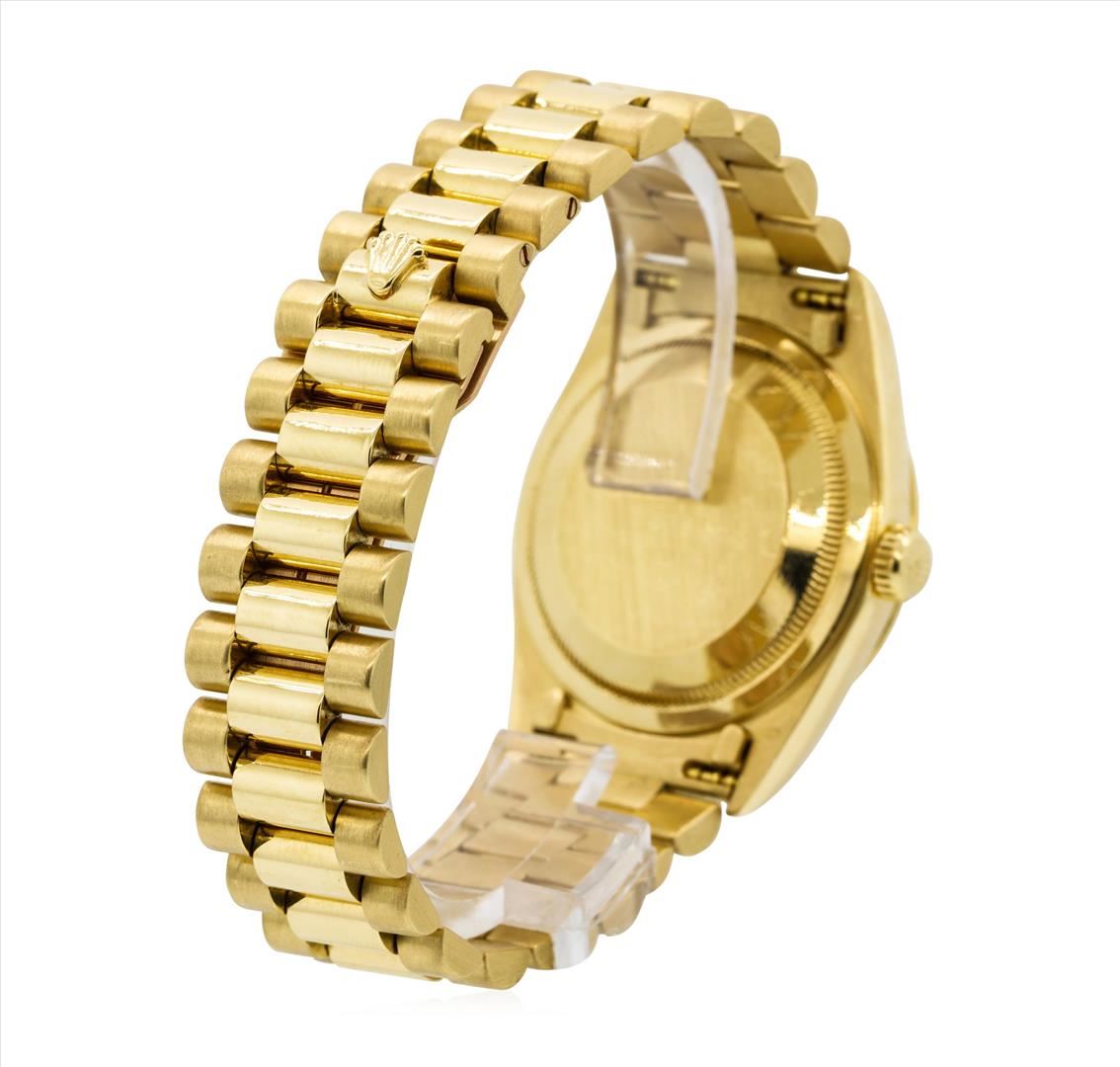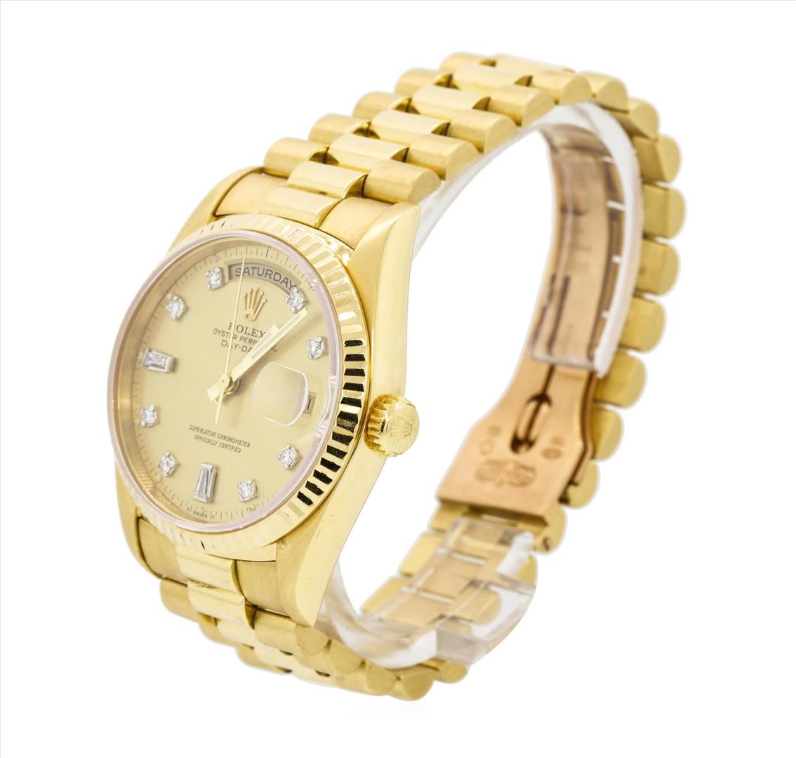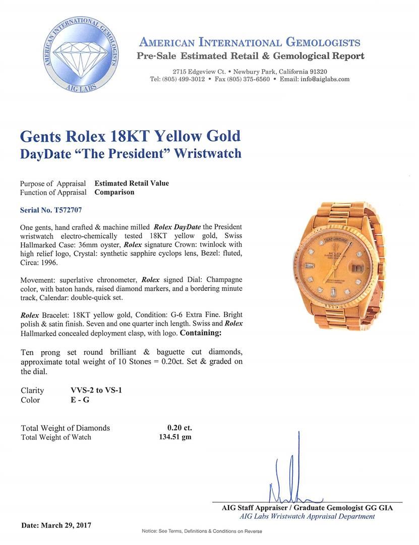 One gents, hand crafted & machine milled Rolex DayDate the President wristwatch electro-chemically tested 18KT yellow gold, Swiss Hallmarked Case: 36mm oyster, Rolex signature Crown: twinlock with high relief logo, Crystal: synthetic sapphire cyclops lens, Bezel: fluted, Circa: 1996.Movement: superlative chronometer, Rolex signed Dial: Champagne color, with baton hands, raised diamond markers, and a bordering minute track, Calendar: double-quick set.Rolex Bracelet: 18KT yellow gold, Condition: G-6 Extra Fine. Bright polish & satin finish. Seven and one quarter inch length. Swiss and Rolex Hallmarked concealed deployment clasp, with logo. Containing: Ten prong set round brilliant & baguette cut diamonds, approximate total weight of 10 Stones = 0.20ct. Set & graded on the dial. Clarity: VVS-2 to VS-1. Color: E - G. Total Weight of Diamonds 0.20ct. Total Weight of Watch 134.51gm. AIG Appraised.