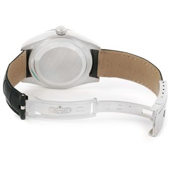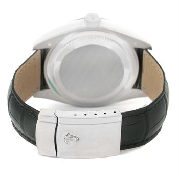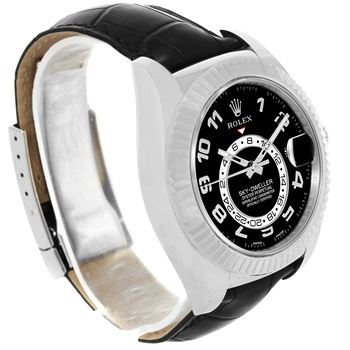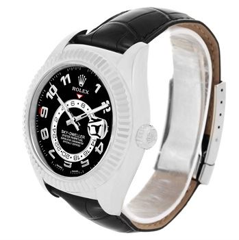 One Rolex Sky-Dweller 18K White Gold Black Dial Watch. The watch is in excellent condition and the details are as follows: Model: 326139 Movement: Officially certified chronometer self-winding movement. Dual time zones, annual calendar. Paramagnetic blue Parachrom hairspring. High-performance Paraflex shock absorbers, Caliber: 9001, Case: 18K white gold case 42.0 mm in diameter, Rolex logo on a screw-down twinlock crown. Bezel: 18K white gold fluted rotatable ring command bezel. Crystal: Scratch resistant sapphire crystal with cyclops magnifier. Dial: Black dial with raised rose gold Arabic numerals. Centre hour, minute and seconds hands. 24-hour display on off-centre disc. Second time zone. Instantaneous annual calendar at 3 o'clock and rapid-setting of the date. Month display via 12 apertures around the circumference of the dial. Bracelet: Black crocodile strap with the 18K white gold folding oyster clasp.