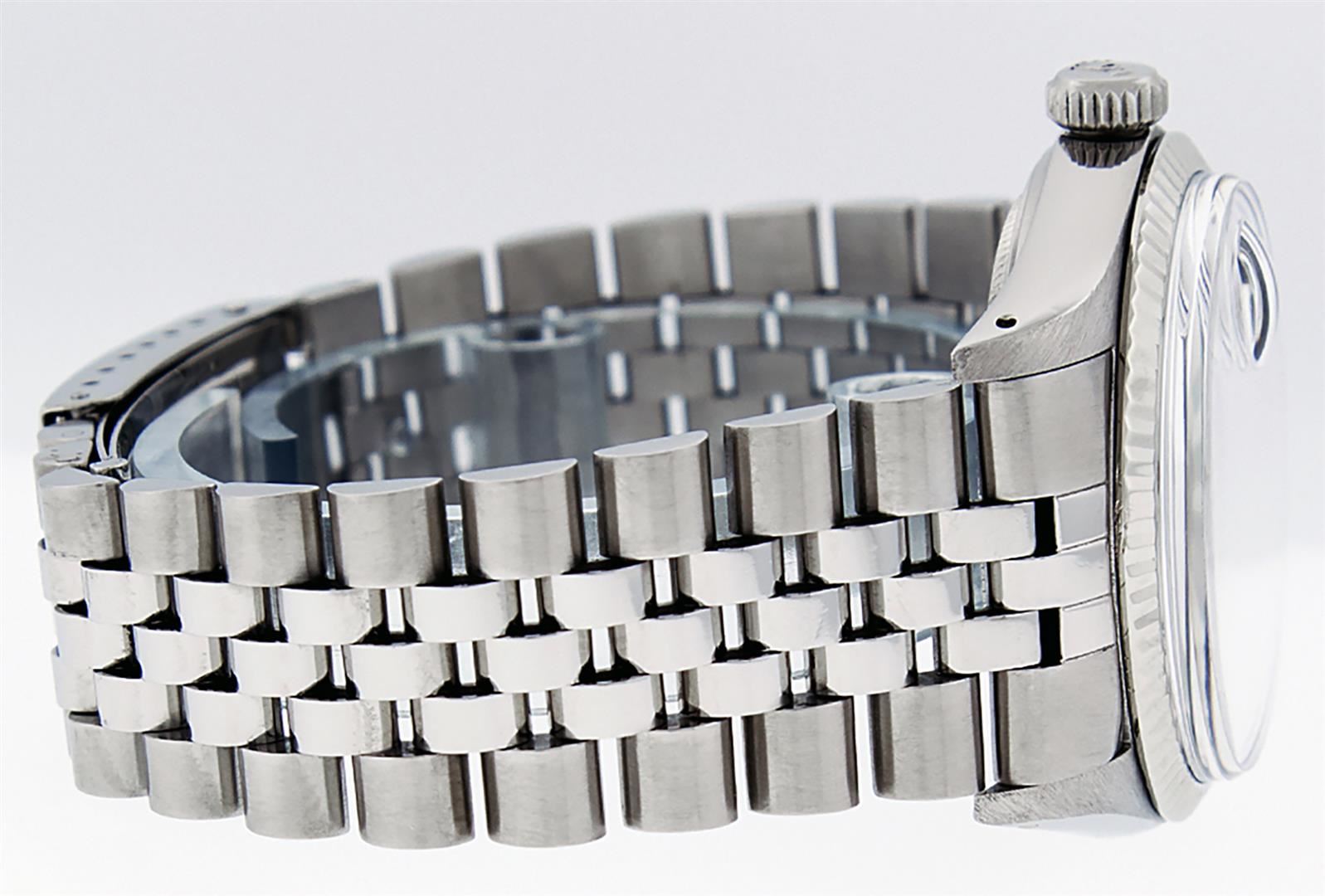 One Stainless Steel Rolex Datejust Polished Bright with Satin Finish, This Watch Has Been Serviced & Electronically Tested, Stainless Steel Case: 36mm, Stainless Steel Crown, Bezel: 14K White Gold Fluted Bezel. Custom Crystal: New Acrylic Cyclops Lens. Custom Hands: New Luminescent Hands. Movement: Automatic Winding Movement. Custom Dial: Slate Grey Diamond Dial With Diamond Hour Markers And Roman Track, Diamond Count: 10 Diamonds in Dial G To H In Color, SI-VS Clarity. Date Window: 3 O'clock Position Date Display, Quickset, Model: Datejust, Condition: G-6 Extra Fine. Bracelet: Stainless Steel Jubilee. Bright Polish & Satin Finish. 7.0 Inch Length, Adjustable. Standard Clasp, With Rolex Logo. This Watch Has Been Serviced Time Tested And Is In Excellent Condition It Is Free Of All Scratches And Dents.