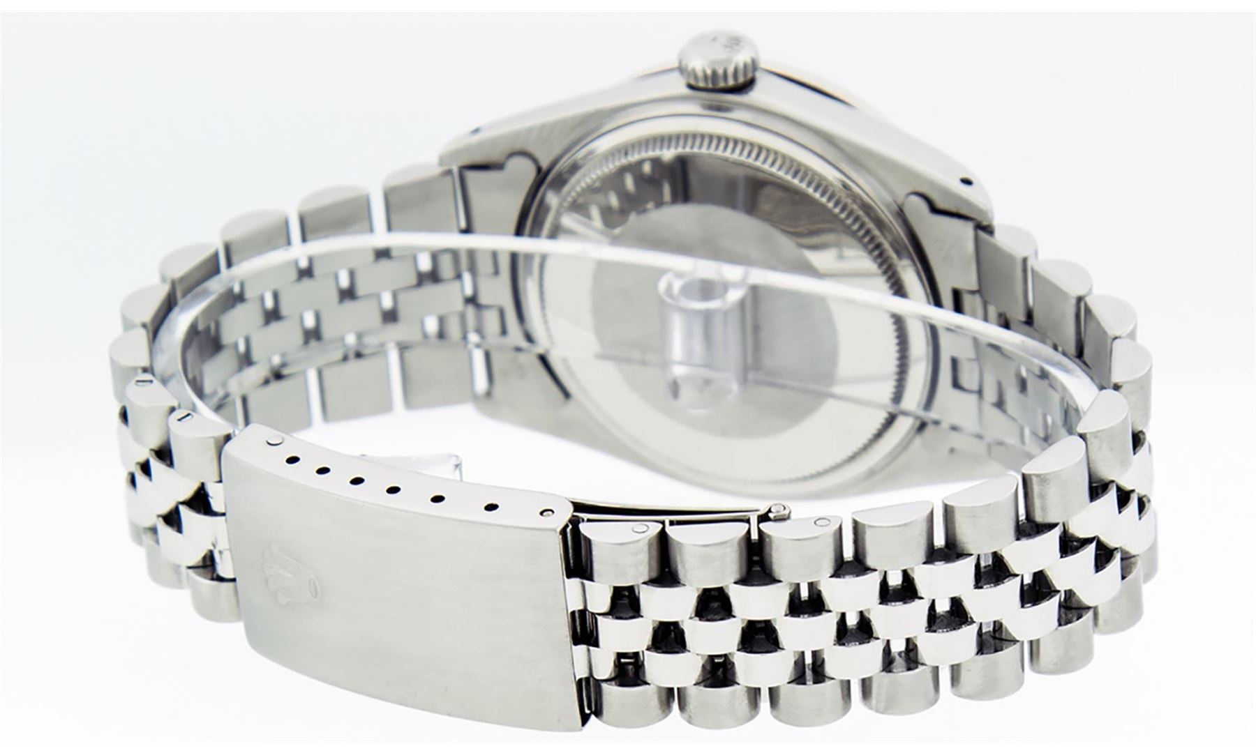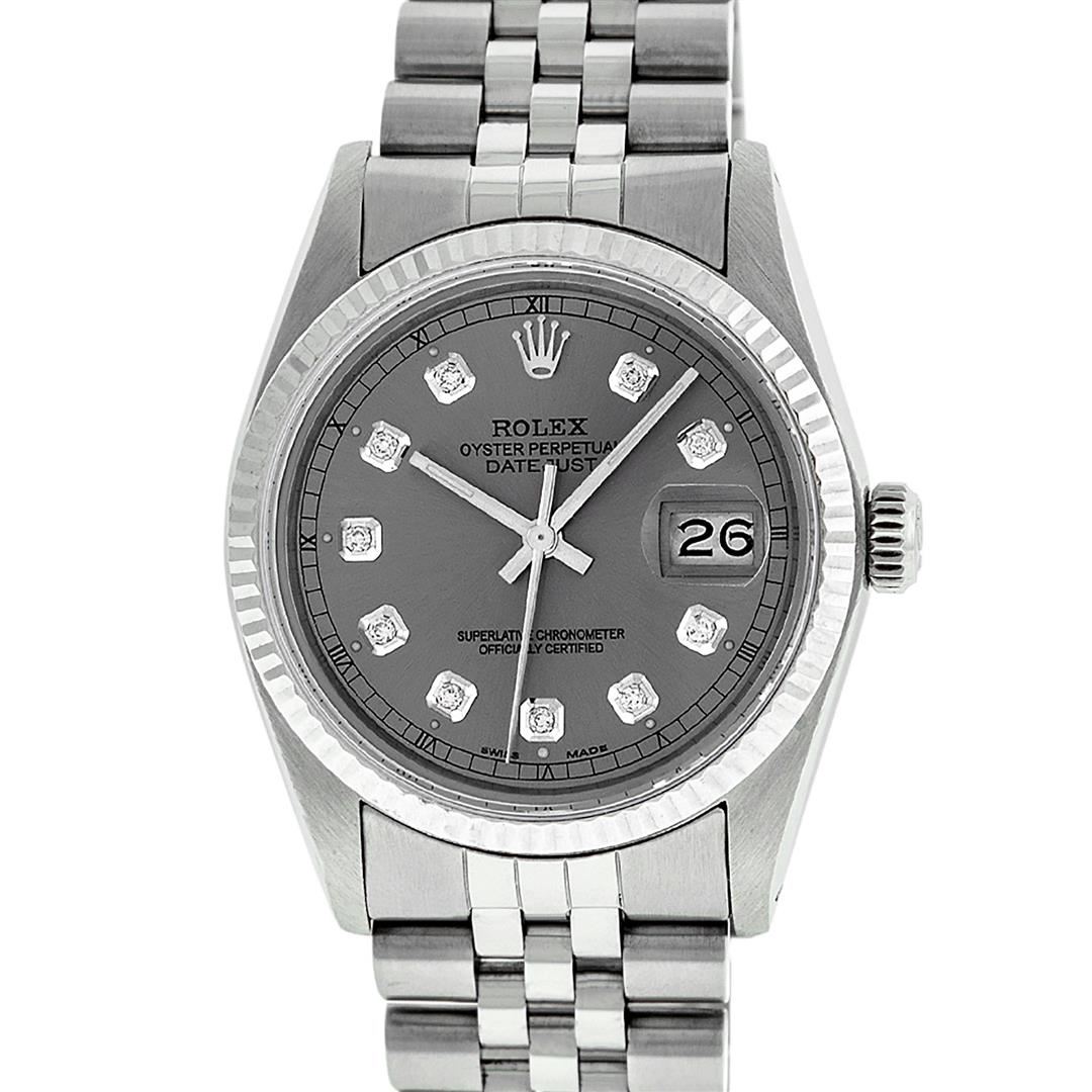 One Stainless Steel Rolex Datejust Polished Bright with Satin Finish, This Watch Has Been Serviced & Electronically Tested, Stainless Steel Case: 36mm, Stainless Steel Crown, Bezel: 14K White Gold Fluted Bezel. Custom Crystal: New Acrylic Cyclops Lens. Custom Hands: New Luminescent Hands. Movement: Automatic Winding Movement. Custom Dial: Slate Grey Diamond Dial With Diamond Hour Markers And Roman Track, Diamond Count: 10 Diamonds in Dial G To H In Color, SI-VS Clarity. Date Window: 3 O'clock Position Date Display, Quickset, Model: Datejust, Condition: G-6 Extra Fine. Bracelet: Stainless Steel Jubilee. Bright Polish & Satin Finish. 7.0 Inch Length, Adjustable. Standard Clasp, With Rolex Logo. This Watch Has Been Serviced Time Tested And Is In Excellent Condition It Is Free Of All Scratches And Dents.