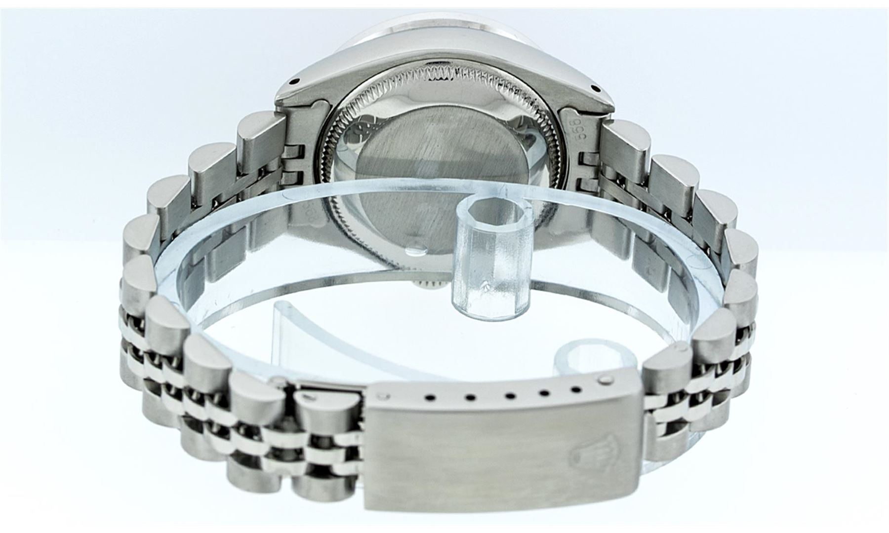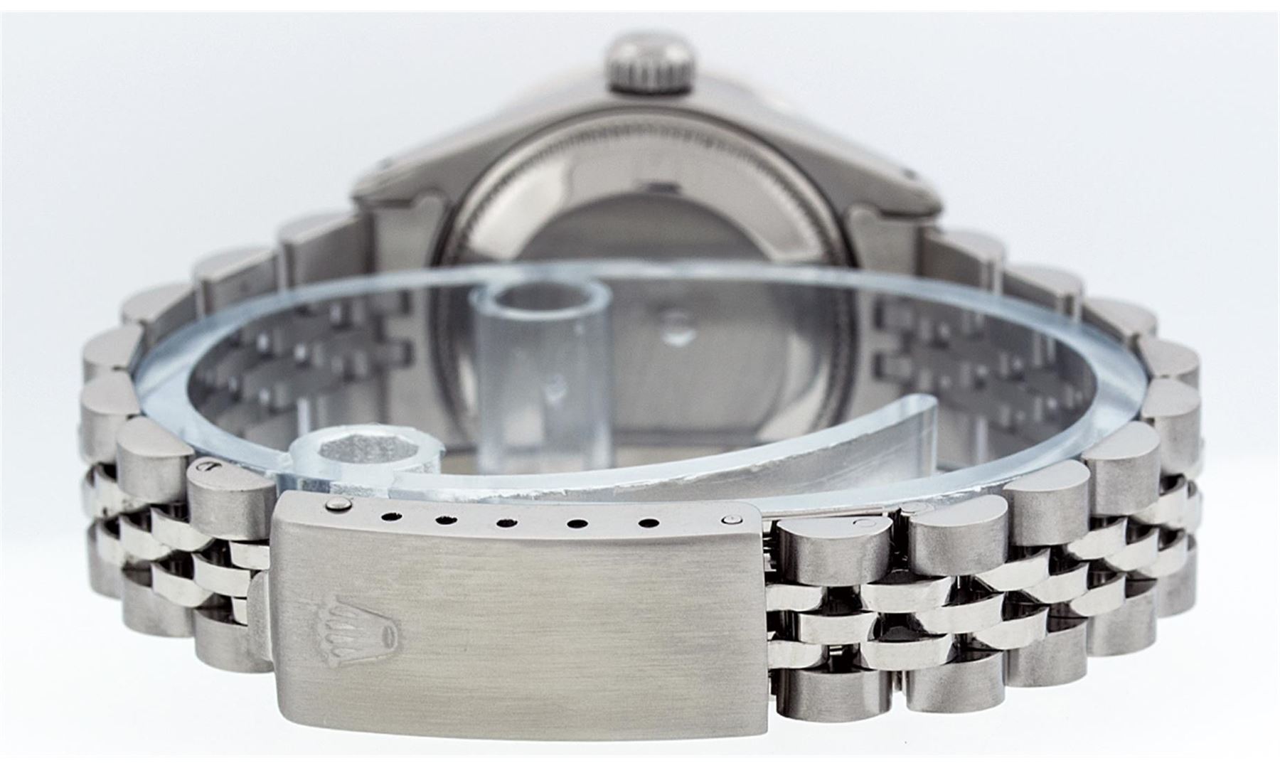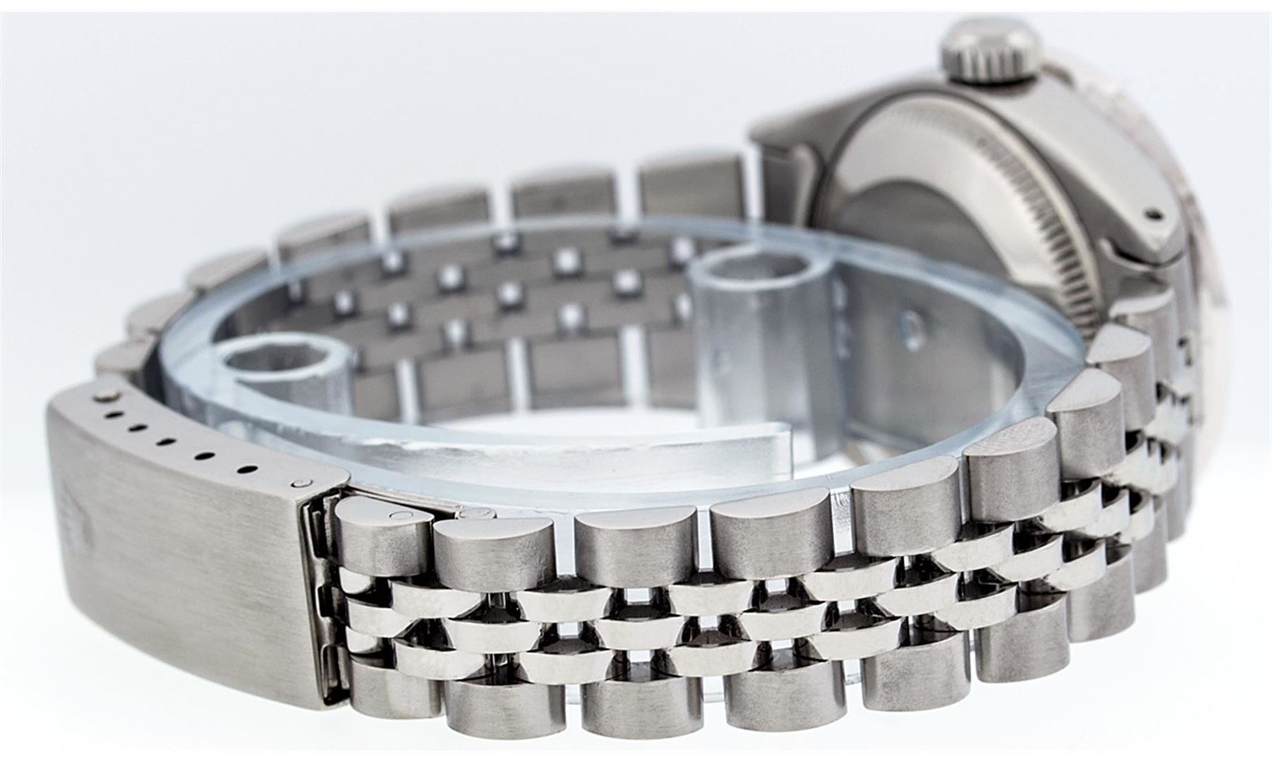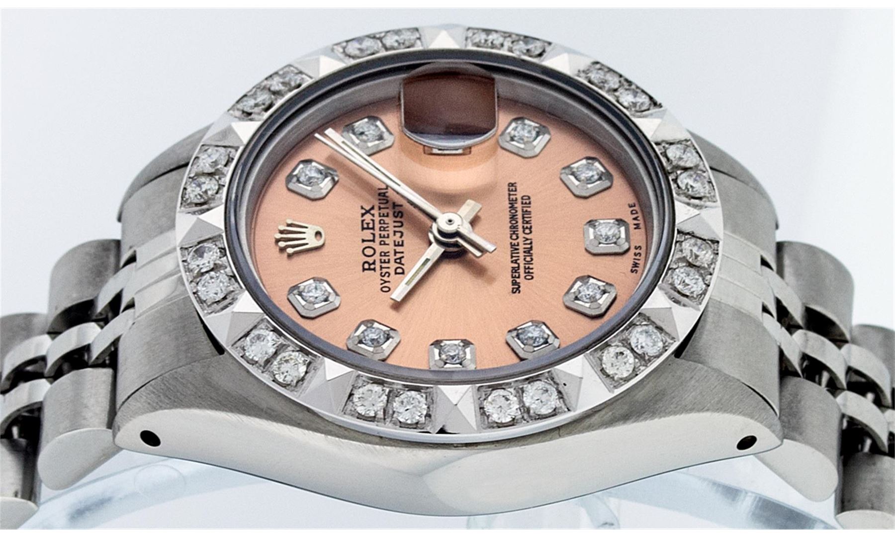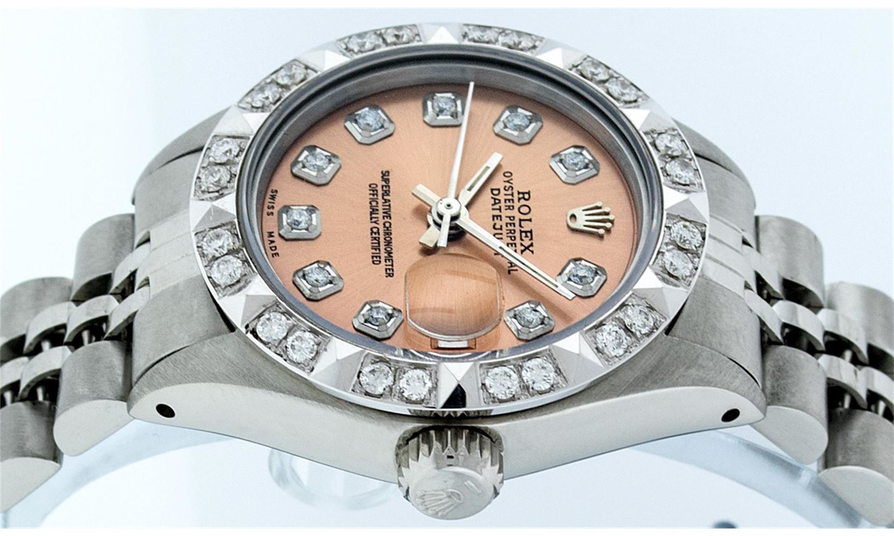 One Ladies Rolex Datejust Polished Bright with Satin Finish, Serviced & Electronically Tested, Stainless Steel Case:26mm, Stainless Steel Crown, Custom Bezel: 18K White Gold Pyramid Diamond Bezel, Diamond Count: 24 Diamonds In Dial. Total Weight .50 Carat, Clarity: SI-VS, Color: G to H. Custom Crystal: Synthetic Sapphire Cyclops Lens. Movement: Automatic Winding Movement Caliber 2030. Custom Dial: Salmon Diamond Dial. Diamond Count: 10 Diamonds In Dial. Clarity: SI-VS, Color:G to H. Date Window: 3 O'Clock Position Date Display, Model: Datejust. Condition: G-6 Extra Fine The Watch Is In Very Good Condition Free Of All Scratches And Dents. Bracelet: Stainless Steel Jubilee Band With Rolex Crown On Buckle. Bright Polish & Satin Finish. Band Length: 6.0 Inch Length, Adjustable. Standard Clasp, With Rolex Logo.