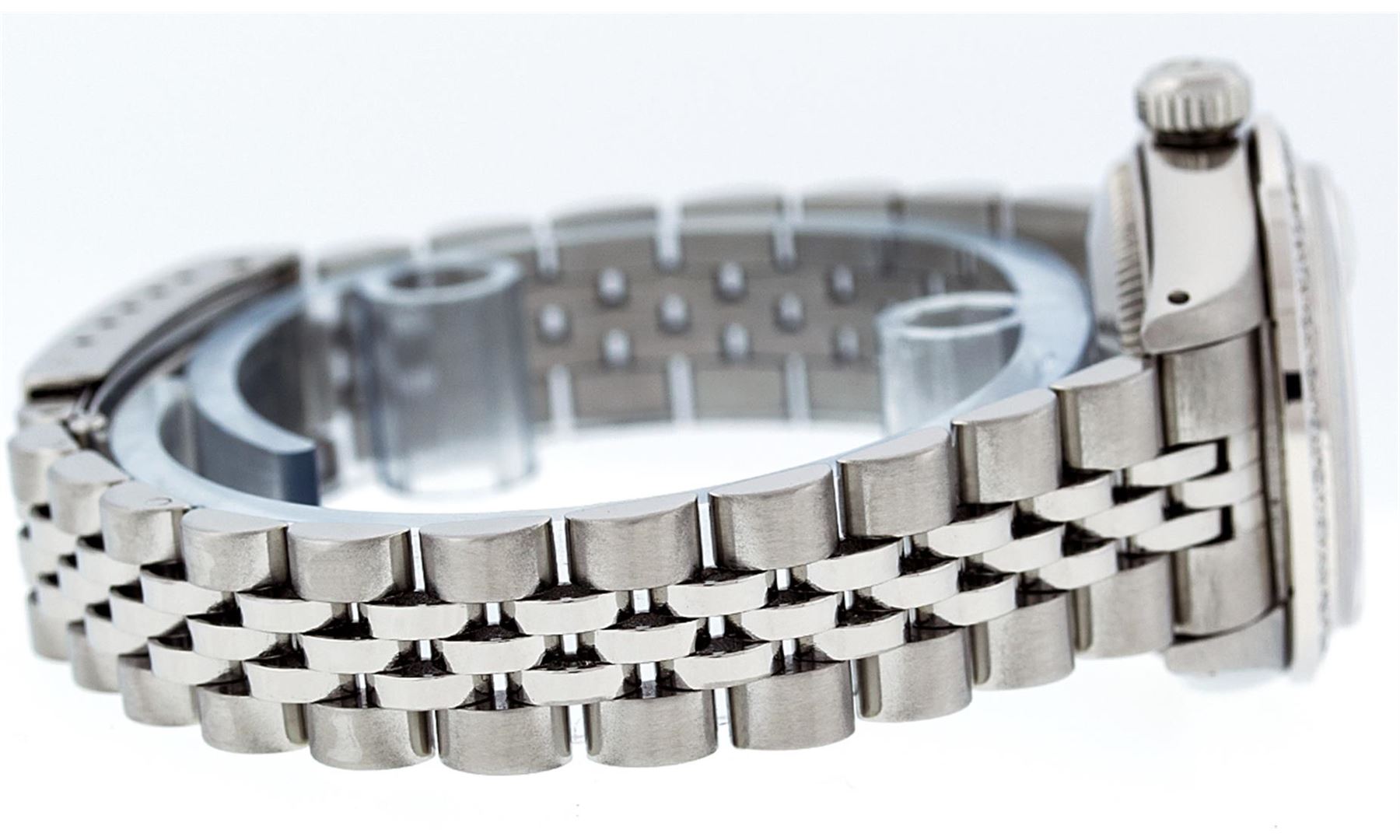 One Ladies Rolex Datejust Polished Bright with Satin Finish, Serviced & Electronically Tested, Stainless Steel Case:26mm, Stainless Steel Crown, Custom Bezel: 18K White Gold Beadset Diamond Bezel, Diamond Count: 32 Diamonds Total Weight .70 Carat, Clarity: SI-VS, Color: G to H. Custom Crystal: Synthetic Sapphire Cyclops Lens. Movement: Automatic Winding Movement Caliber 2030. Custom Dial: Silver Diamond Dial, Diamond Count: 10 Diamonds In Dial, Clarity: SI-VS, Color: G to H. Date Window: 3 O'Clock Position Date Display, Model: Datejust Condition: G-6 Extra Fine. Bracelet: Stainless Steel Jubilee Band. Bright Polish & Satin Finish. 6.0 Inch Length, Adjustable. Standard Clasp, With Rolex Logo.