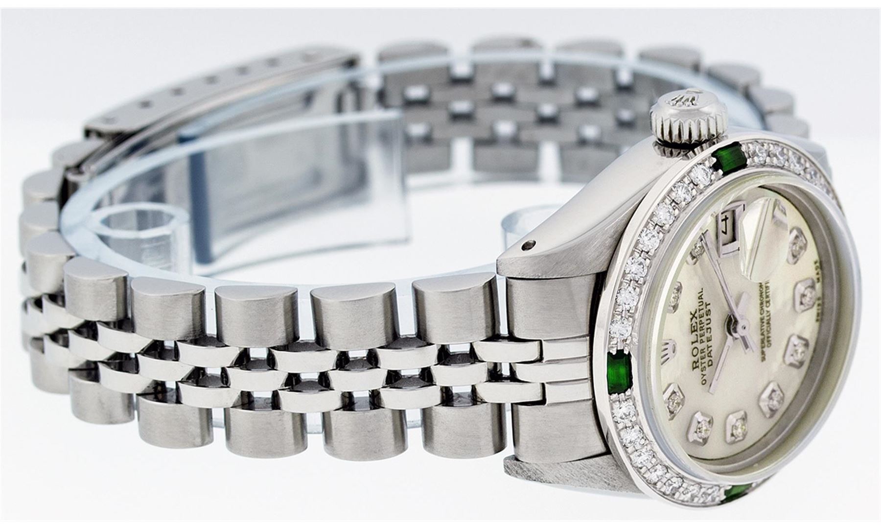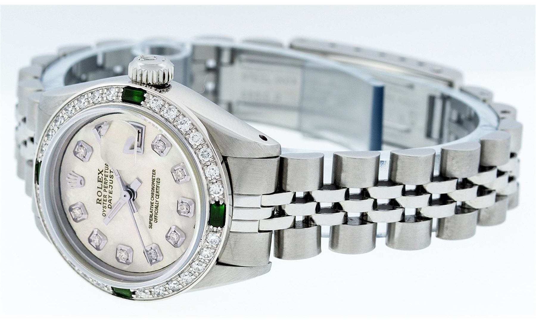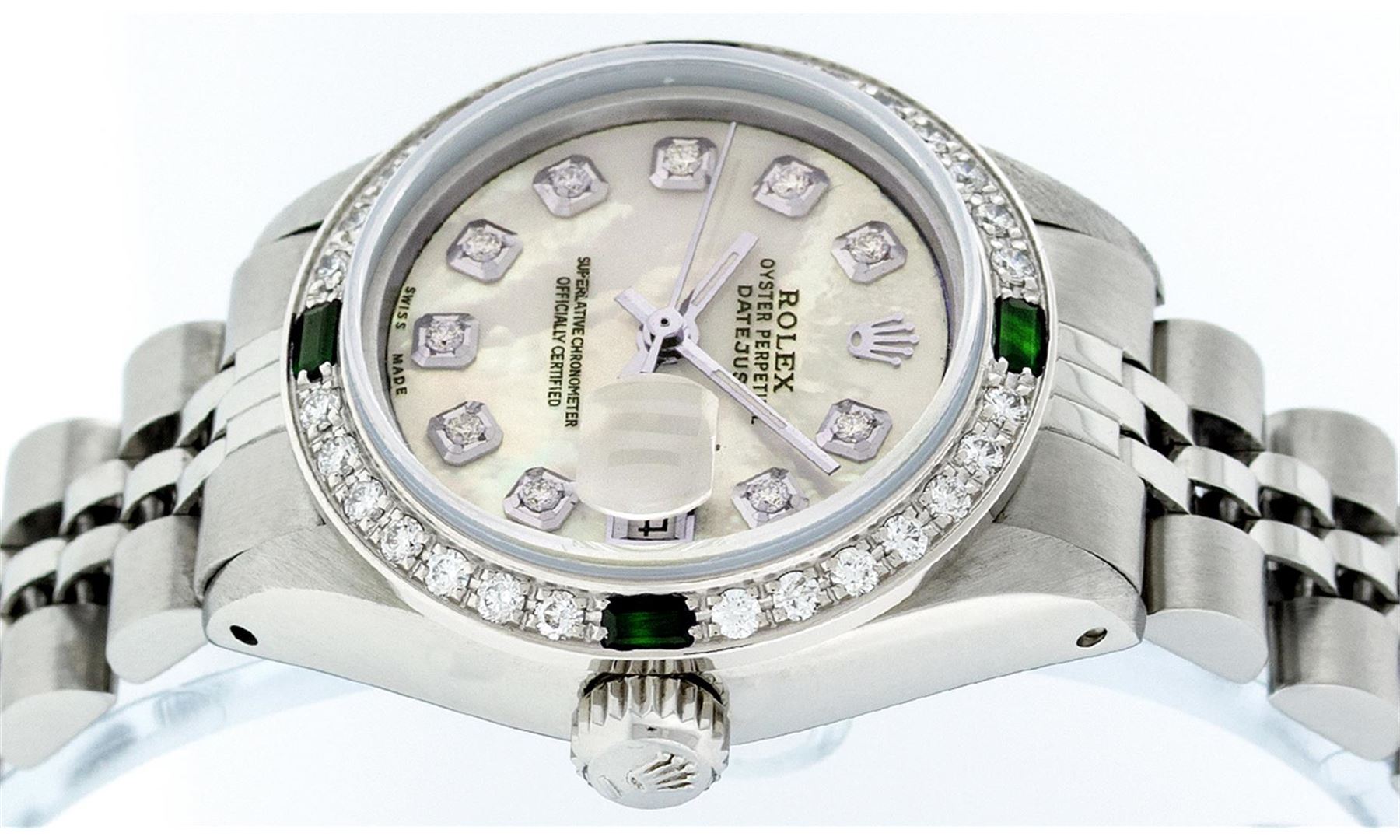 Ladies Rolex Datejust Polished Bright with Satin Finish, Serviced & Electronically Tested, Stainless Steel Case:26mm, Stainless Steel Crown, Custom Bezel: 18K White Gold Emerald Beadset Diamond Bezel, Diamond + Gem Count: 28 Diamonds + 4 Emerald. Total Weight .70 Carat, Clarity: SI-VS, Color: G to H. Custom Crystal: Synthetic Sapphire Cyclops Lens. Movement: Automatic Winding Movement Caliber 2030. Custom Dial: Refinished Yellow MOP With Diamond Hour Markers. Diamond Count: 10 Diamonds, Color: G To H, Clarity: SI-VS. Date Window: 3 O'Clock Position Date Display, Model: Datejust. Condition: G-6 Extra Fine. Bracelet: Stainless Steel Jubilee. Bright Polish & Satin Finish. 6.0 Inch Length, Adjustable. Standard Clasp, With Rolex Logo.