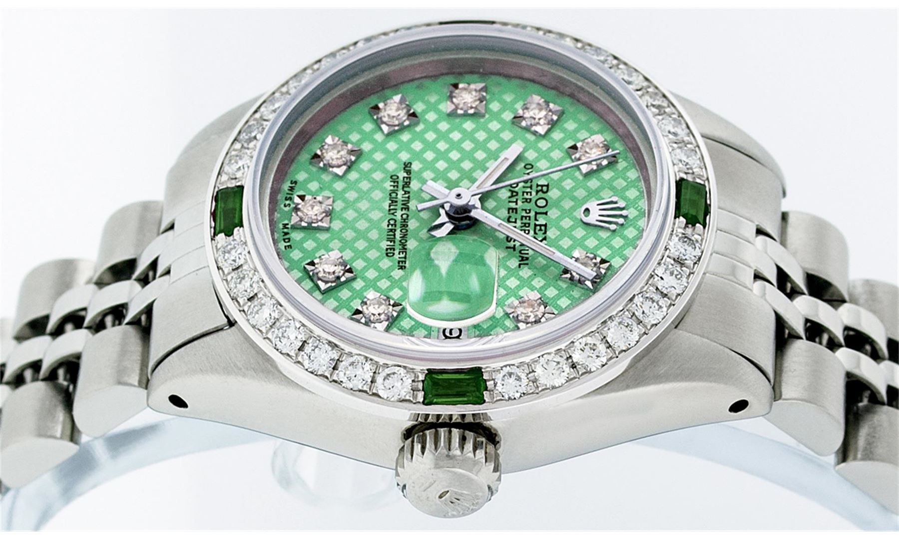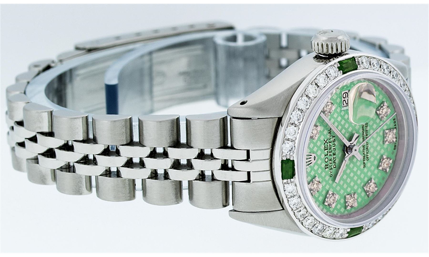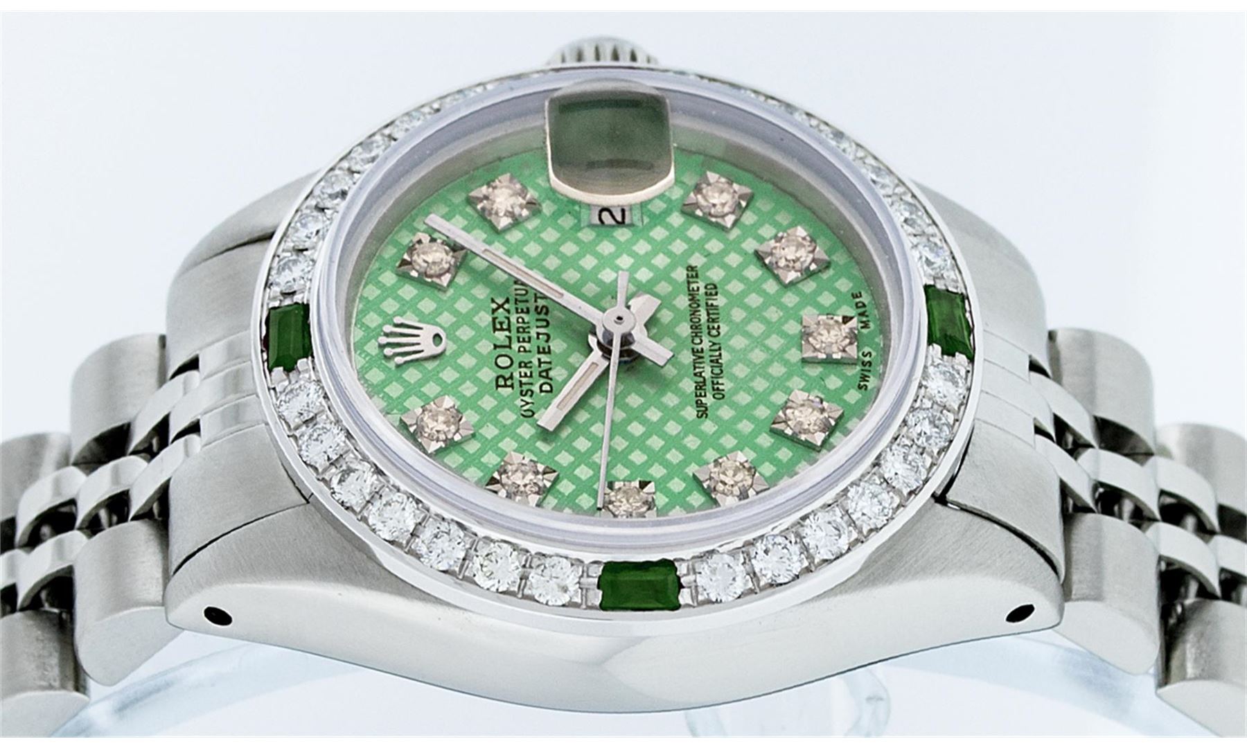 Ladies Rolex Datejust Polished Bright with Satin Finish, Serviced & Electronically Tested, Stainless Steel Case:26mm, Stainless Steel Crown, Custom Bezel: 18K White Gold Emerald Beadset Diamond Bezel, Diamond + Gem Count: 28 Diamonds + 4 Emeralds. Total Weight .70 Carat, Clarity: SI-VS, Color: G to H. Custom Crystal: Synthetic Sapphire Cyclops Lens. Movement: Automatic Winding Movement Caliber 2030. Custom Dial: Refinished Green With VS Single Cut Diamond Hour Markers. Diamond Count: 10 Diamonds, Color: G To H, Clarity: VS. Date Window: 3 O'Clock Position Date Display, Model: Datejust. Condition: G-6 Extra Fine. Bracelet: Stainless Steel Jubilee. Bright Polish & Satin Finish. 6.0 Inch Length, Adjustable. Standard Clasp, With Rolex Logo.