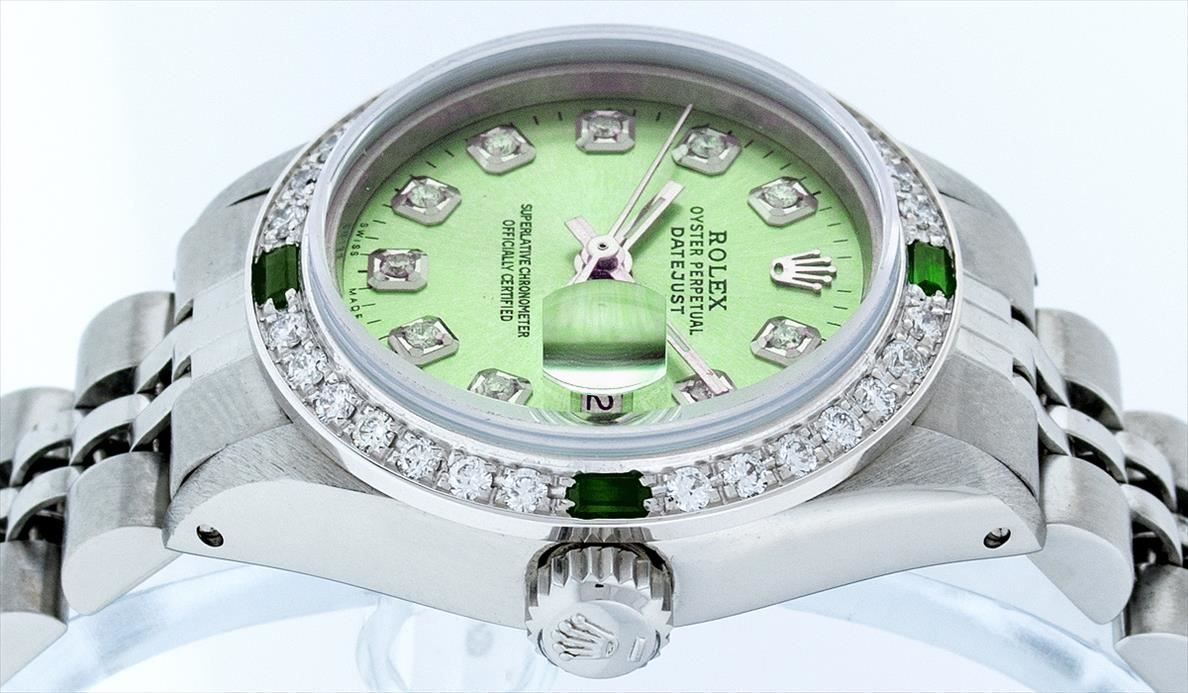Ladies Rolex Datejust Polished Bright with Satin Finish, Serviced & Electronically Tested, Stainless Steel Case:26mm, Stainless Steel Crown, Custom Bezel: 18K White Gold Emerald Beadset Diamond Bezel, Diamond + Gem Count: 28 Diamonds + 4 Emerald. Total Weight .70 Carat, Clarity: SI-VS, Color: G to H. Custom Crystal: Synthetic Sapphire Cyclops Lens. Movement: Automatic Winding Movement Caliber 2030. Custom Dial: Refinished Ice Green With Diamond Hour Markers. Diamond Count: 10 Diamonds, Color: G To H, Clarity: SI-VS. Date Window: 3 O'Clock Position Date Display, Model: Datejust. Condition: G-6 Extra Fine. Bracelet: Stainless Steel Jubilee. Bright Polish & Satin Finish. 6.0 Inch Length, Adjustable. Standard Clasp, With Rolex Logo.