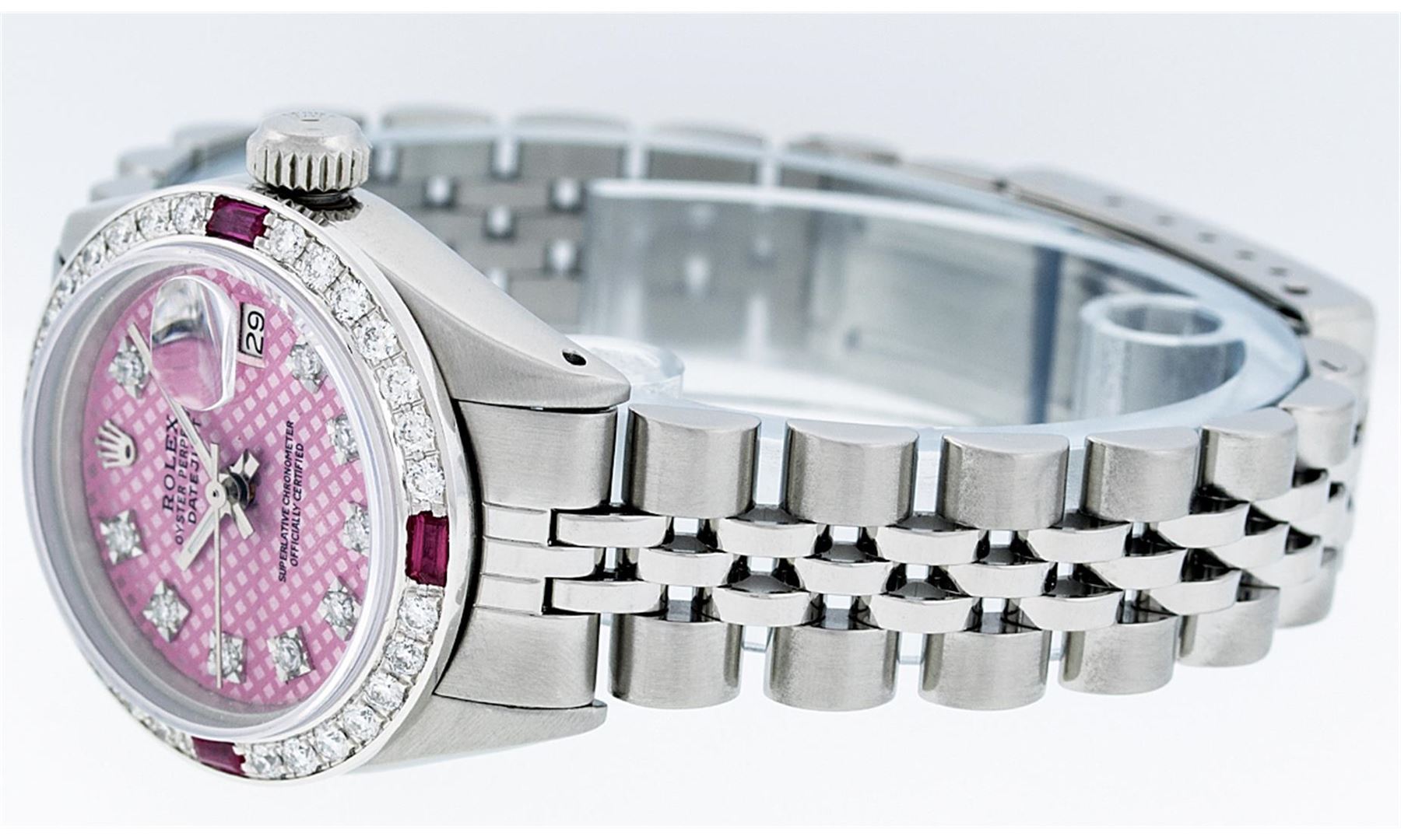 Ladies Rolex Datejust Polished Bright with Satin Finish, Serviced & Electronically Tested, Stainless Steel Case:26mm, Stainless Steel Crown, Custom Bezel: 18K White Gold Ruby Beadset Diamond Bezel, Diamond + Gem Count: 28 Diamonds + 4 Rubies. Total Weight .70 Carat, Clarity: SI-VS, Color: G to H. Custom Crystal: Synthetic Sapphire Cyclops Lens. Movement: Automatic Winding Movement Caliber 2030. Custom Dial: Refinished Pink With VS Single Cut Diamond Hour Markers. Diamond Count: 10 Diamonds, Color: G To H, Clarity: VVS. Date Window: 3 O'Clock Position Date Display, Model: Datejust. Condition: G-6 Extra Fine. Bracelet: Stainless Steel Jubilee. Bright Polish & Satin Finish. 6.0 Inch Length, Adjustable. Standard Clasp, With Rolex Logo.