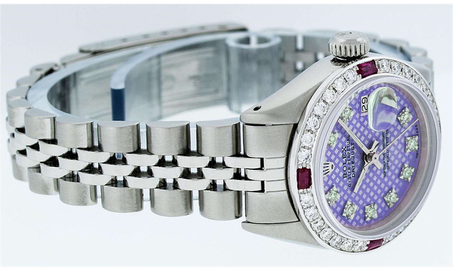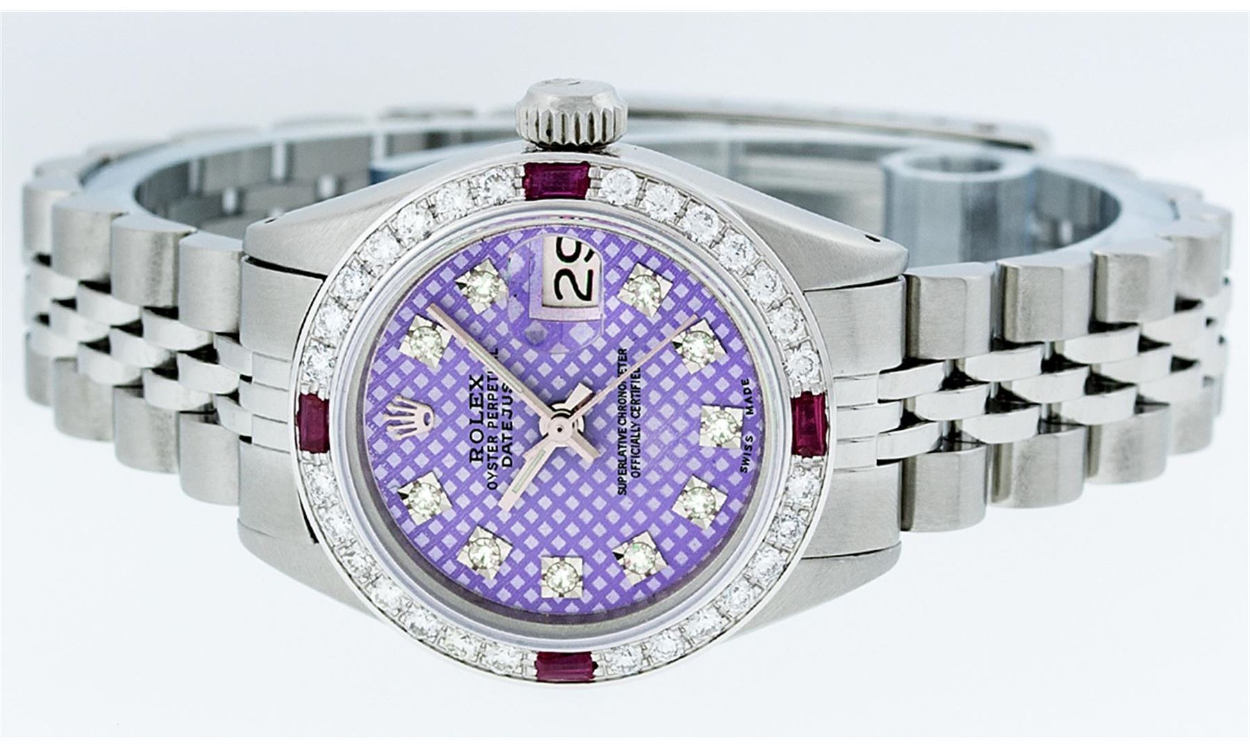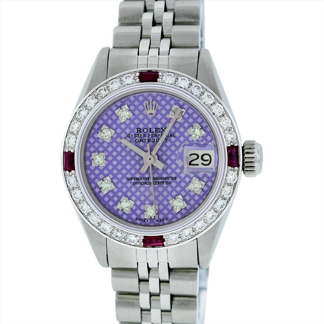 Ladies Rolex Datejust Polished Bright with Satin Finish, Serviced & Electronically Tested, Stainless Steel Case:26mm, Stainless Steel Crown, Custom Bezel: 18K White Gold Ruby Beadset Diamond Bezel, Diamond + Gem Count: 28 Diamonds + 4 Rubies. Total Weight .70 Carat, Clarity: SI-VS, Color: G to H. Custom Crystal: Synthetic Sapphire Cyclops Lens. Movement: Automatic Winding Movement Caliber 2030. Custom Dial: Refinished Purple With VS Diamond Hour Markers. Diamond Count: 10 Diamonds, Color: G To H, Clarity: VS. Date Window: 3 O'Clock Position Date Display, Model: Datejust. Condition: G-6 Extra Fine. Bracelet: Stainless Steel Jubilee. Bright Polish & Satin Finish. 6.0 Inch Length, Adjustable. Standard Clasp, With Rolex Logo.