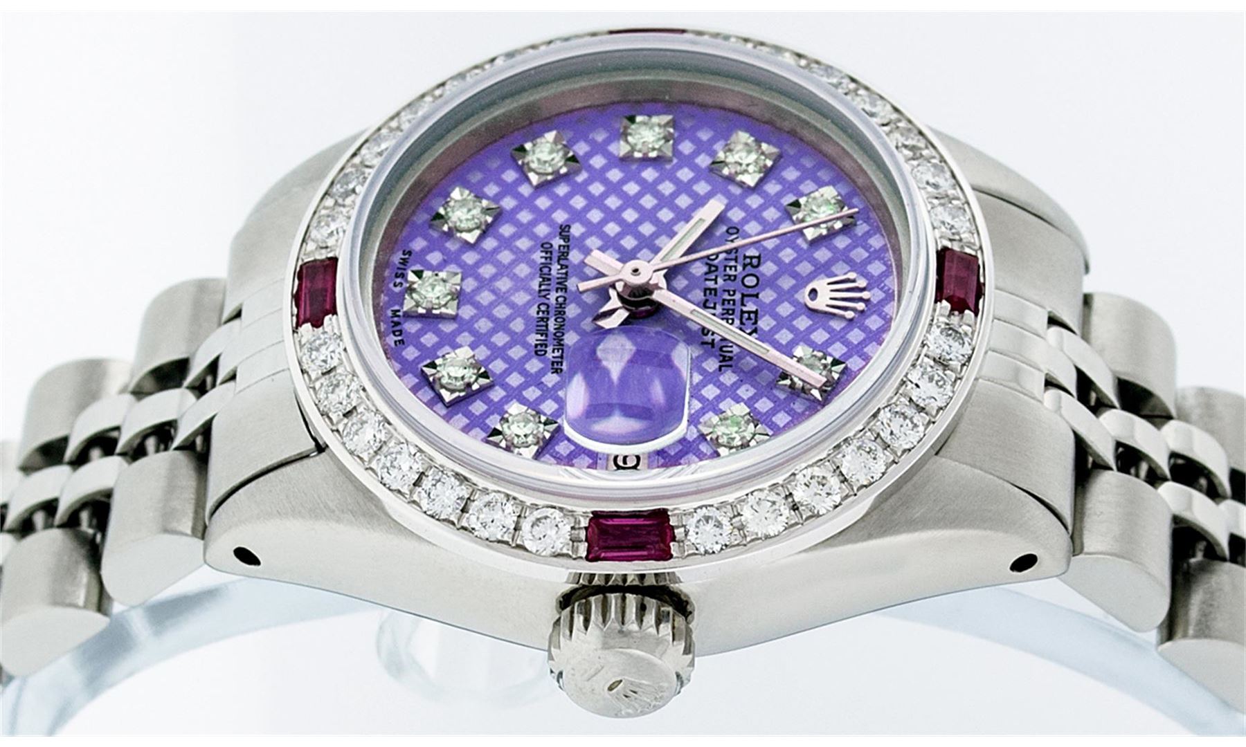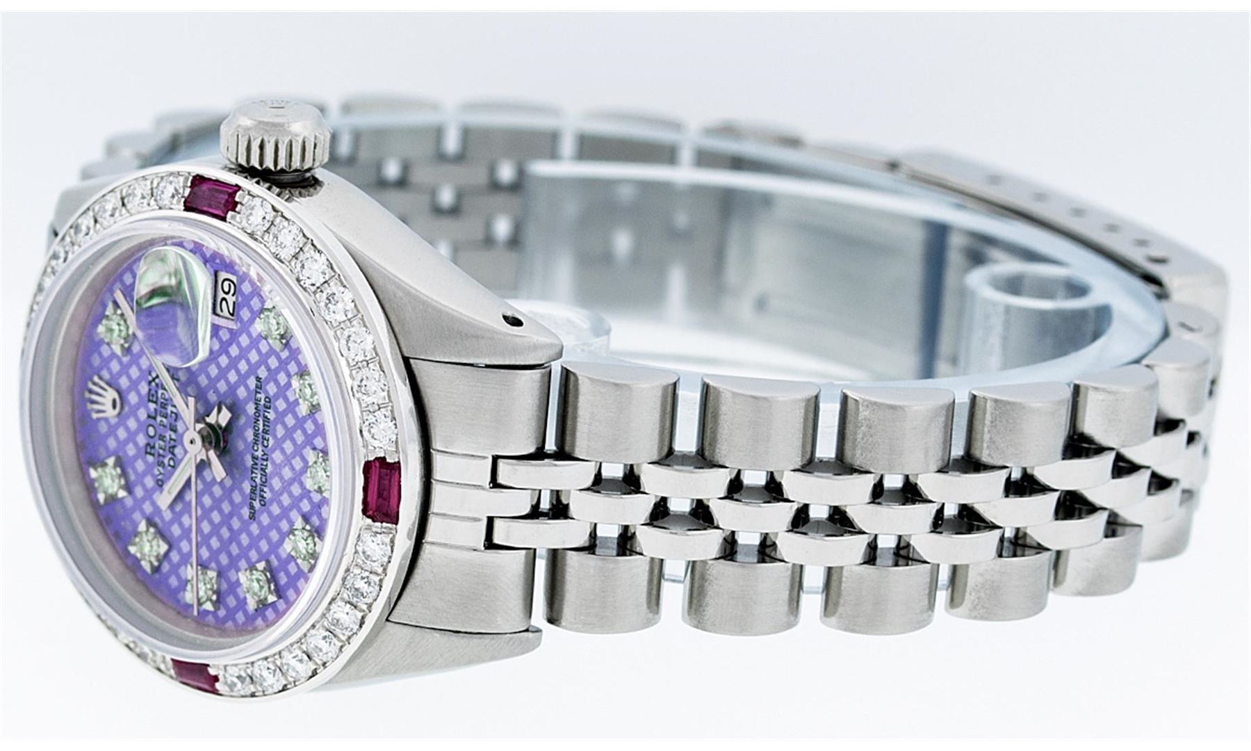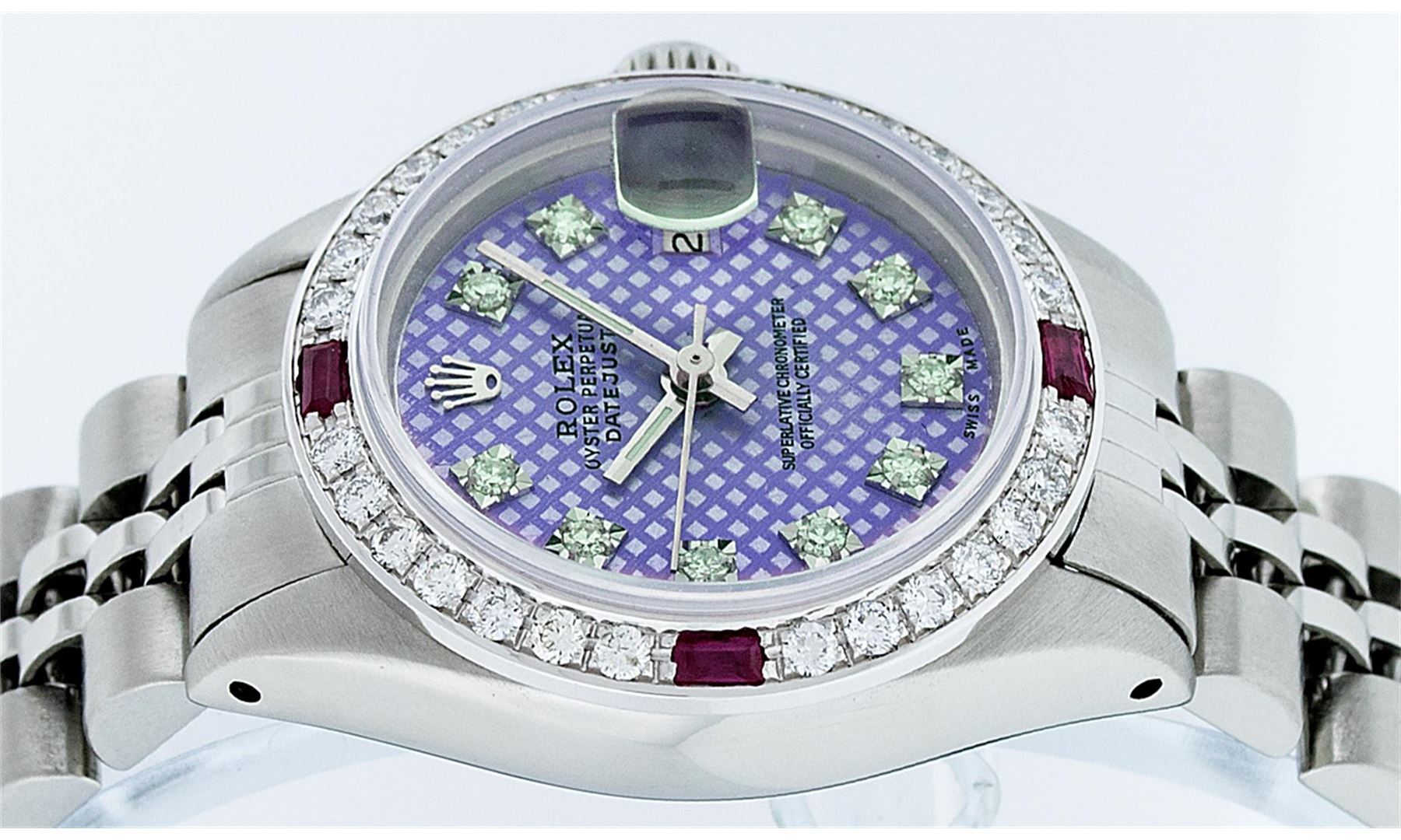 Ladies Rolex Datejust Polished Bright with Satin Finish, Serviced & Electronically Tested, Stainless Steel Case:26mm, Stainless Steel Crown, Custom Bezel: 18K White Gold Ruby Beadset Diamond Bezel, Diamond + Gem Count: 28 Diamonds + 4 Rubies. Total Weight .70 Carat, Clarity: SI-VS, Color: G to H. Custom Crystal: Synthetic Sapphire Cyclops Lens. Movement: Automatic Winding Movement Caliber 2030. Custom Dial: Refinished Purple With VS Diamond Hour Markers. Diamond Count: 10 Diamonds, Color: G To H, Clarity: VS. Date Window: 3 O'Clock Position Date Display, Model: Datejust. Condition: G-6 Extra Fine. Bracelet: Stainless Steel Jubilee. Bright Polish & Satin Finish. 6.0 Inch Length, Adjustable. Standard Clasp, With Rolex Logo.