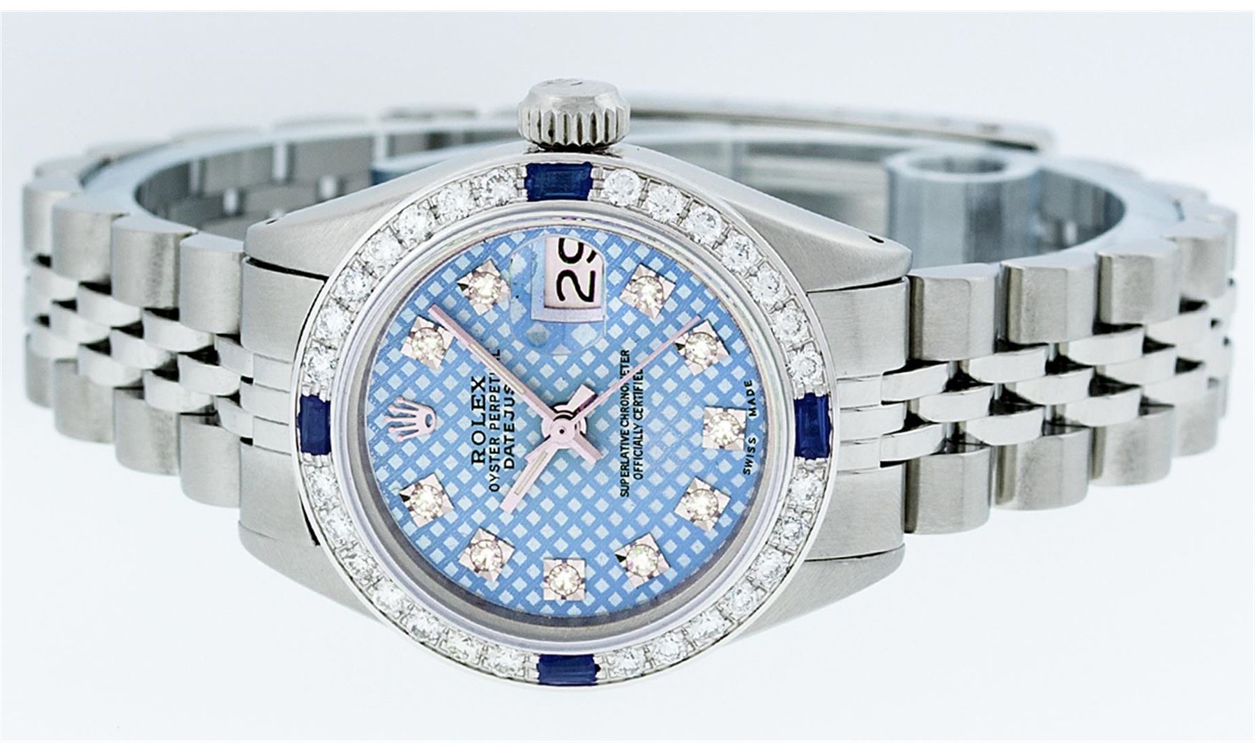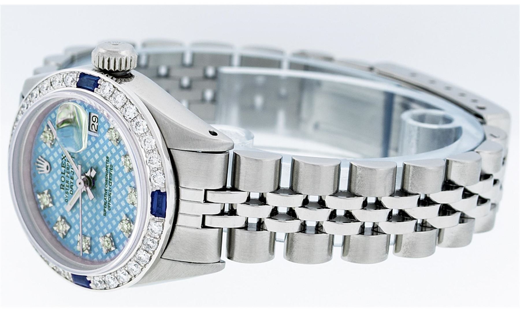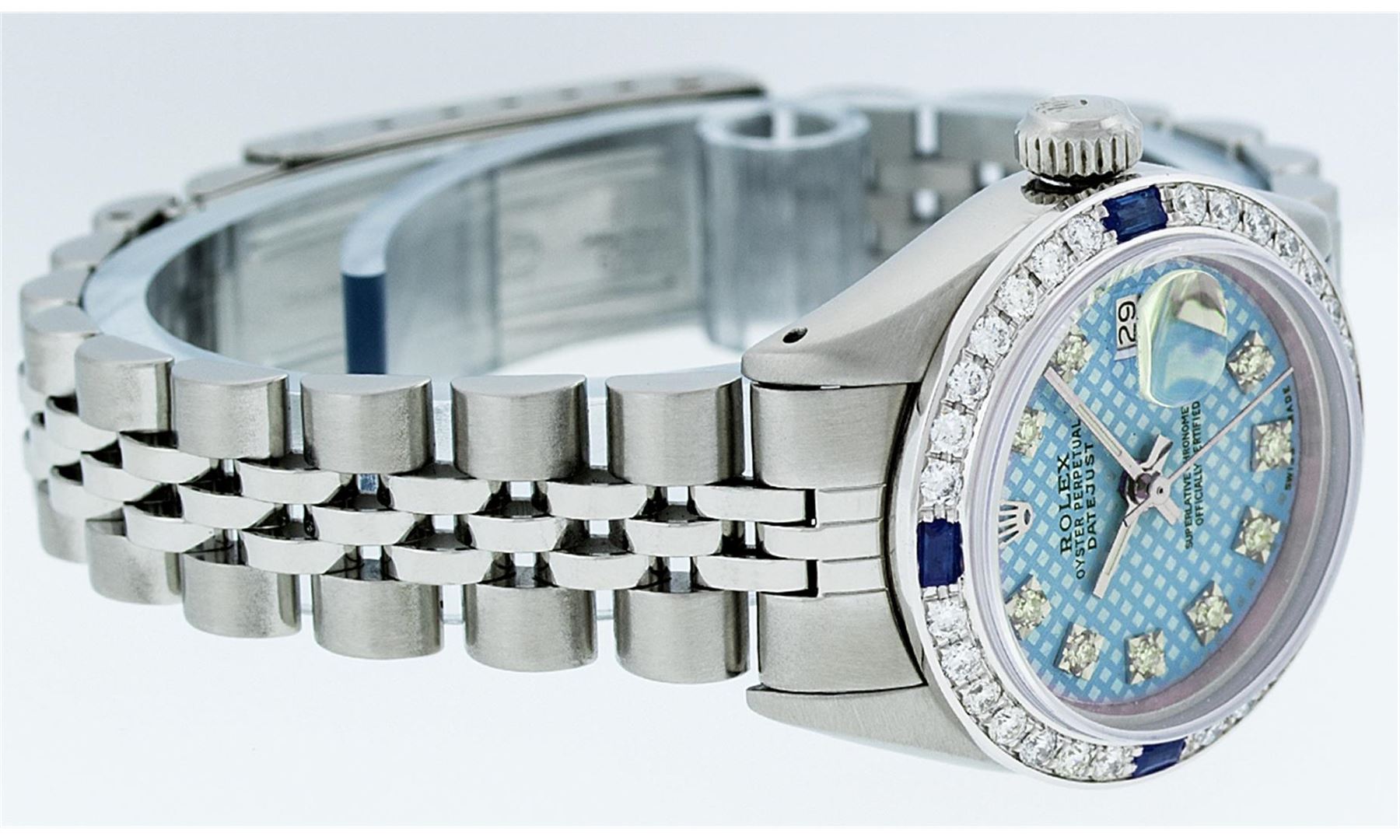 Ladies Rolex Datejust Polished Bright with Satin Finish, Serviced & Electronically Tested, Stainless Steel Case:26mm, Stainless Steel Crown, Custom Bezel: 18K White Gold Sapphire Beadset Diamond Bezel, Diamond + Gem Count: 28 Diamonds + 4 Sapphires. Total Weight .70 Carat, Clarity: SI-VS, Color: G to H. Custom Crystal: Synthetic Sapphire Cyclops Lens. Movement: Automatic Winding Movement Caliber 2030. Custom Dial: Refinished Blue With VS Diamond Hour Markers. Diamond Count: 10 Diamonds, Color: G To H, Clarity: VS. Date Window: 3 O'Clock Position Date Display, Model: Datejust. Condition: G-6 Extra Fine. Bracelet: Stainless Steel Jubilee. Bright Polish & Satin Finish. 6.0 Inch Length, Adjustable. Standard Clasp, With Rolex Logo.