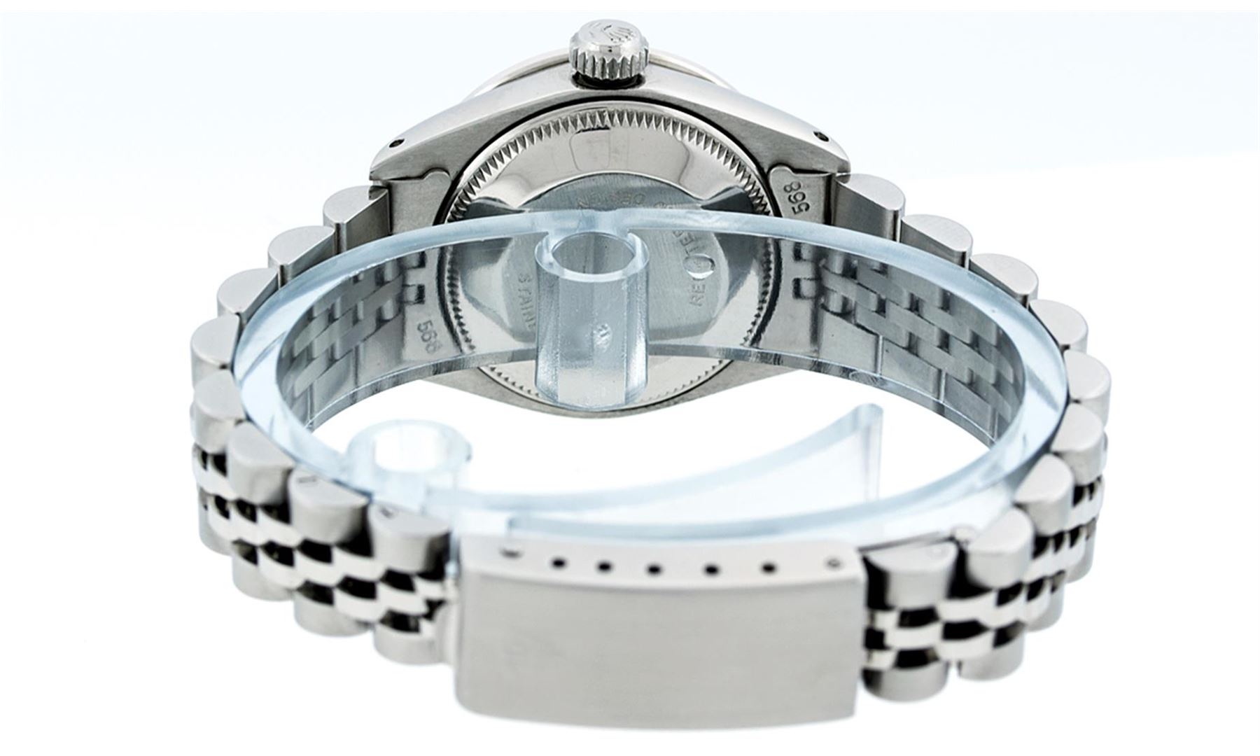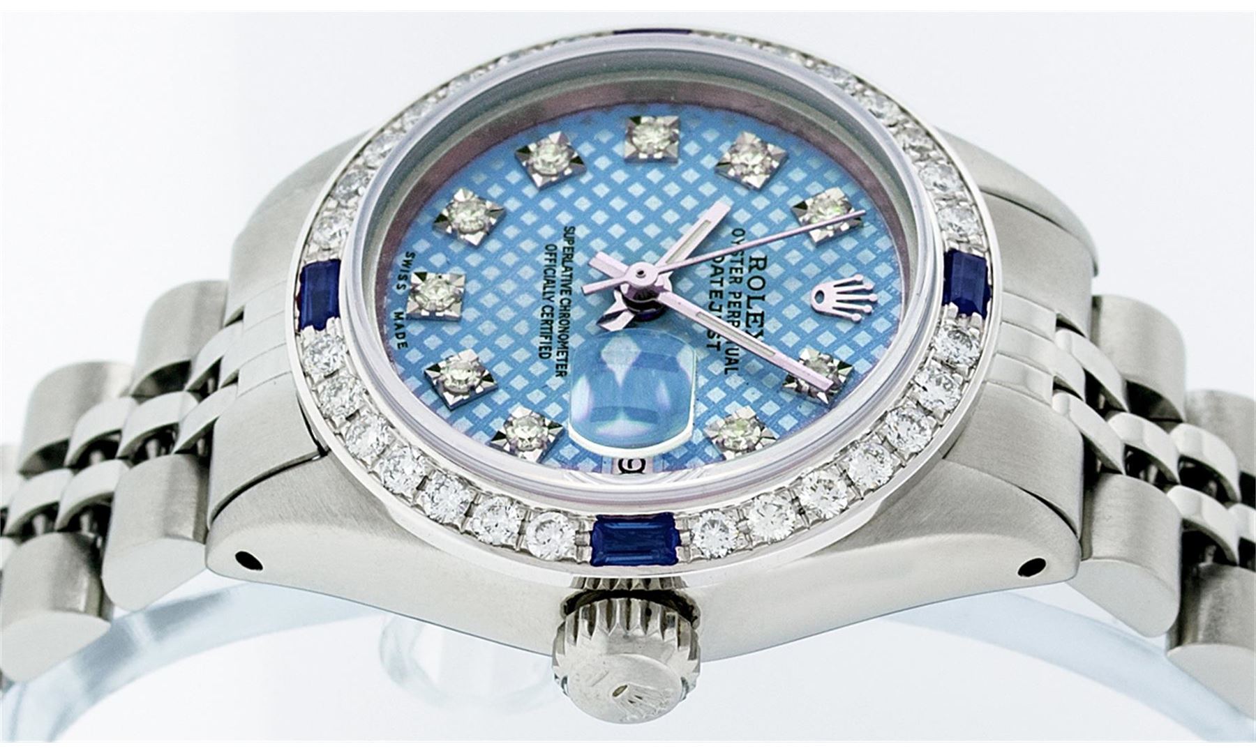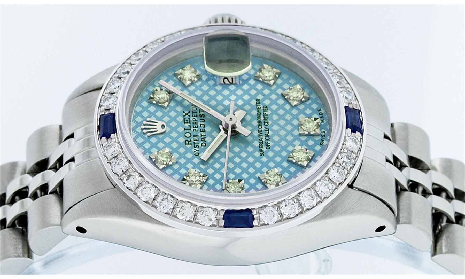 Ladies Rolex Datejust Polished Bright with Satin Finish, Serviced & Electronically Tested, Stainless Steel Case:26mm, Stainless Steel Crown, Custom Bezel: 18K White Gold Sapphire Beadset Diamond Bezel, Diamond + Gem Count: 28 Diamonds + 4 Sapphires. Total Weight .70 Carat, Clarity: SI-VS, Color: G to H. Custom Crystal: Synthetic Sapphire Cyclops Lens. Movement: Automatic Winding Movement Caliber 2030. Custom Dial: Refinished Blue With VS Diamond Hour Markers. Diamond Count: 10 Diamonds, Color: G To H, Clarity: VS. Date Window: 3 O'Clock Position Date Display, Model: Datejust. Condition: G-6 Extra Fine. Bracelet: Stainless Steel Jubilee. Bright Polish & Satin Finish. 6.0 Inch Length, Adjustable. Standard Clasp, With Rolex Logo.