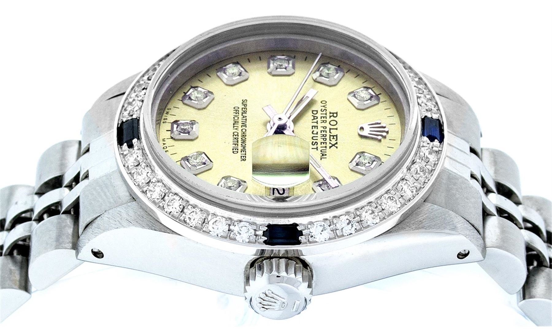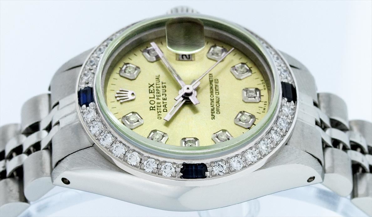 Ladies Rolex Datejust Polished Bright with Satin Finish, Serviced & Electronically Tested, Stainless Steel Case:26mm, Stainless Steel Crown, Custom Bezel: 18K White Gold Sapphire Beadset Diamond Bezel, Diamond + Gem Count: 28 Diamonds + 4 Sapphire. Total Weight .70 Carat, Clarity: SI-VS, Color: G to H. Custom Crystal: Synthetic Sapphire Cyclops Lens. Movement: Automatic Winding Movement Caliber 2030. Custom Dial: Refinished Yellow With Diamond Hour Markers. Diamond Count: 10 Diamonds, Color: G To H, Clarity: SI-VS. Date Window: 3 O'Clock Position Date Display, Model: Datejust. Condition: G-6 Extra Fine. Bracelet: Stainless Steel Jubilee. Bright Polish & Satin Finish. 6.0 Inch Length, Adjustable. Standard Clasp, With Rolex Logo.