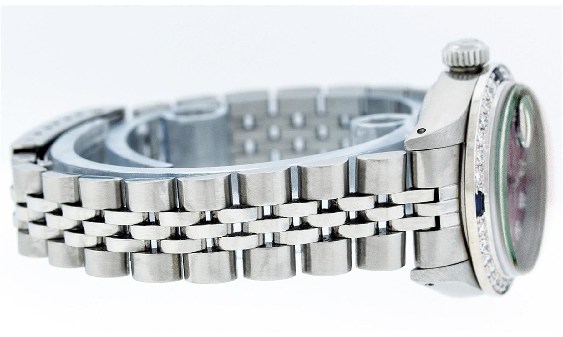 Ladies Rolex Datejust Polished Bright with Satin Finish, Serviced & Electronically Tested, Stainless Steel Case:26mm, Stainless Steel Crown, Custom Bezel: 18K White Gold Sapphire Beadset Diamond Bezel, Diamond + Gem Count: 28 Diamonds + 4 Sapphire. Total Weight .70 Carat, Clarity: SI-VS, Color: G to H. Custom Crystal: Synthetic Sapphire Cyclops Lens. Movement: Automatic Winding Movement Caliber 2030. Custom Dial: Refinished Pink With Diamond Hour Markers. Diamond Count: 10 Diamonds, Color: G To H, Clarity: SI-VS. Date Window: 3 O'Clock Position Date Display, Model: Datejust. Condition: G-6 Extra Fine. Bracelet: Stainless Steel Jubilee. Bright Polish & Satin Finish. 6.0 Inch Length, Adjustable. Standard Clasp, With Rolex Logo.