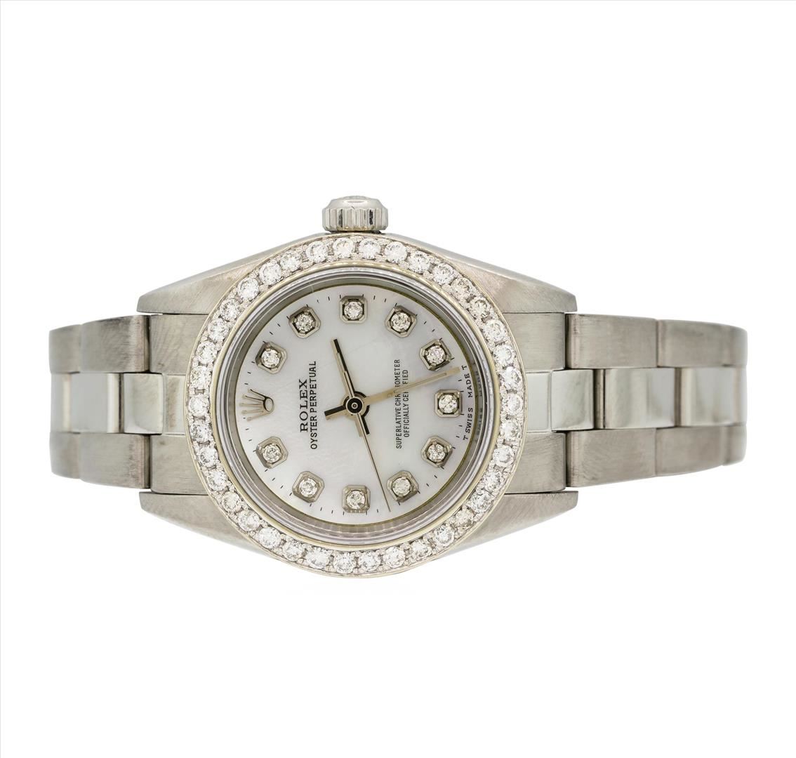 One ladies, Rolex Oyster Perpetual model Stainless Steel wristwatch electro-chemically tested. Case: 25mm oyster, Rolex Signature Crown: twin lock with high relief logo, Custom Bezel: diamond set, Custom Crystal: synthetic sapphire lens. Movement: automatic, Custom Dial: mother of pearl, with baton hands and raised diamond markers, Circa: 1990, Condition: G-5 Fine, Rolex Bracelet: bright polish & brushed finish stainless steel tapering oyster links. Three removable links. Six and one half inch length, adjustable. Rolex Hallmarked clasp, with high relief logo. Containing: Thirty-Eight prong set round brilliant cut diamonds, measuring 1.70 - 1.70 x 1.02mm(depth est.) approximate total weight of 38 Stones = 0.68ct. Graded in the setting. Clarity: SI-1 to I-1. Color: F - H Eleven prong set round brilliant cut diamonds, measuring 1.30 - 1.30 x 0.78mm(depth est.) approximate total weight of 11 Stones = 0.09ct. Graded in the setting. Clarity: SI-1 to I-1. Color: F - H. Total Weight of Diamonds 0.77ct. Total Weight of Watch 48.40gm. AIG Appraised at $6,770.00. AIG Appraised.