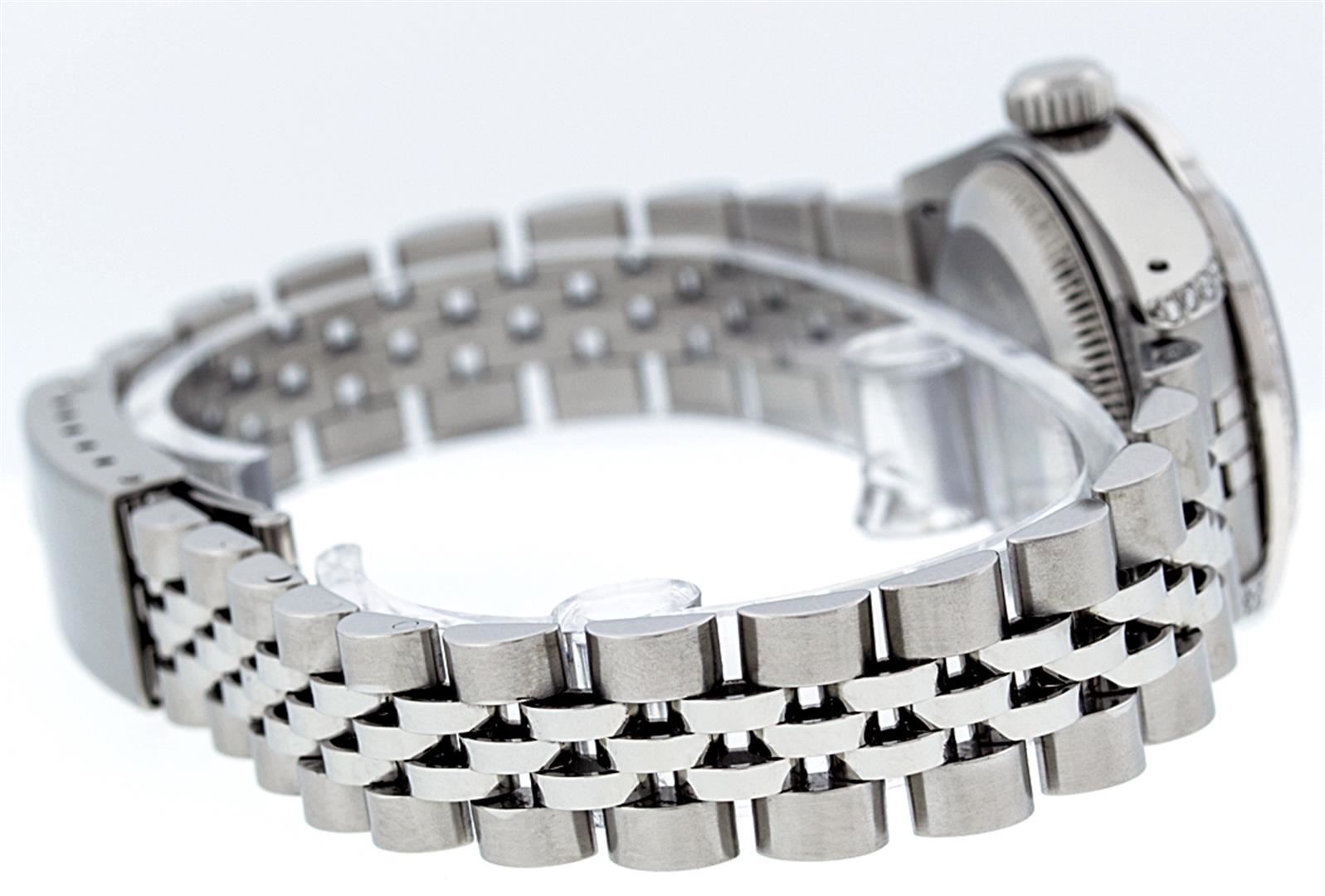 One Ladies Rolex Datejust Polished Bright with Satin Finish, Serviced & Electronically Tested, Stainless Steel Case:26mm, Stainless Steel Crown, Diamond Lugs: 16 Diamonds On Lugs, Clarity: SI-VS, Color: G to H. Custom Bezel: 18K White Gold Beadset Bezel, Diamond Count: 32 Diamonds, Total Weight 1.00 Carat, Clarity: SI-VS, Color: G to H. Custom Crystal: Synthetic Sapphire Cyclops Lens. Movement: Automatic Winding Movement Caliber 2030. Custom Dial: Refinished Purple String With Diamond Dial, 43 Diamonds in Dial G To H In Color, Clarity: VS. Date Window: 3 O'Clock Position Date Display, Model: Datejust Condition: G-6 Extra Fine. Bracelet: Stainless Steel Jubilee. Bright Polish & Satin Finish. 6.0 Inch Length, Adjustable. Standard Clasp, With Rolex Logo.
