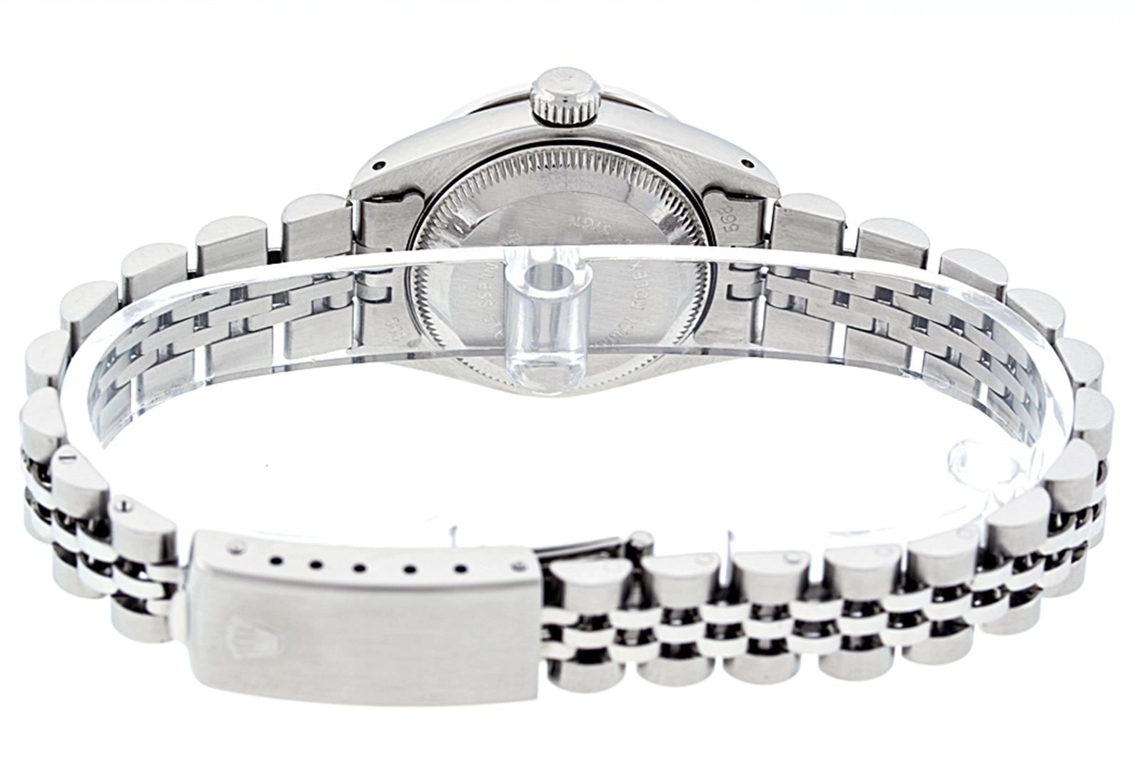 One Ladies Rolex Datejust Polished Bright with Satin Finish, Serviced & Electronically Tested, Stainless Steel Case:26mm, Stainless Steel Crown, Diamond Lugs: 16 Diamonds On Lugs, Clarity: SI-VS, Color: G to H. Custom Bezel: 18K White Gold Beadset Bezel, Diamond Count: 32 Diamonds, Total Weight 1.00 Carat, Clarity: SI-VS, Color: G to H. Custom Crystal: Synthetic Sapphire Cyclops Lens. Movement: Automatic Winding Movement Caliber 2030. Custom Dial: Refinished Green String With Diamond Dial, 43 Diamonds in Dial G To H In Color, Clarity: VVS. Date Window: 3 O'Clock Position Date Display, Model: Datejust Condition: G-6 Extra Fine. Bracelet: Stainless Steel Jubilee. Bright Polish & Satin Finish. 6.0 Inch Length, Adjustable. Standard Clasp, With Rolex Logo.