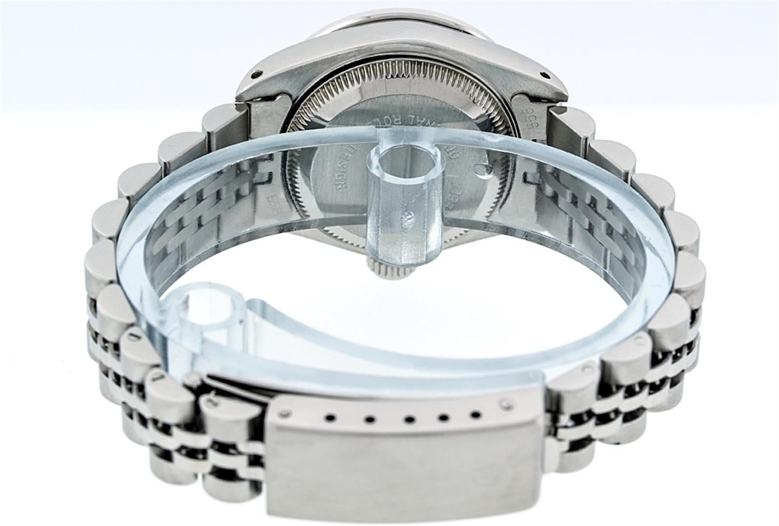 One Ladies Rolex Datejust Polished Bright with Satin Finish, Serviced & Electronically Tested, Stainless Steel Case:26mm, Stainless Steel Crown, Diamond Lugs: 16 Diamonds On Lugs, Clarity: SI-VS, Color: G to H. Custom Bezel: 18K White Gold Beadset Bezel, Diamond Count: 32 Diamonds, Total Weight 1.00 Carat, Clarity: SI-VS, Color: G to H. Custom Crystal: Synthetic Sapphire Cyclops Lens. Movement: Automatic Winding Movement Caliber 2030. Custom Dial: Refinished Salmon String With Diamond Dial, 43 Diamonds in Dial G To H In Color, Clarity: VS. Date Window: 3 O'Clock Position Date Display, Model: Datejust Condition: G-6 Extra Fine. Bracelet: Stainless Steel Jubilee. Bright Polish & Satin Finish. 6.0 Inch Length, Adjustable. Standard Clasp, With Rolex Logo.