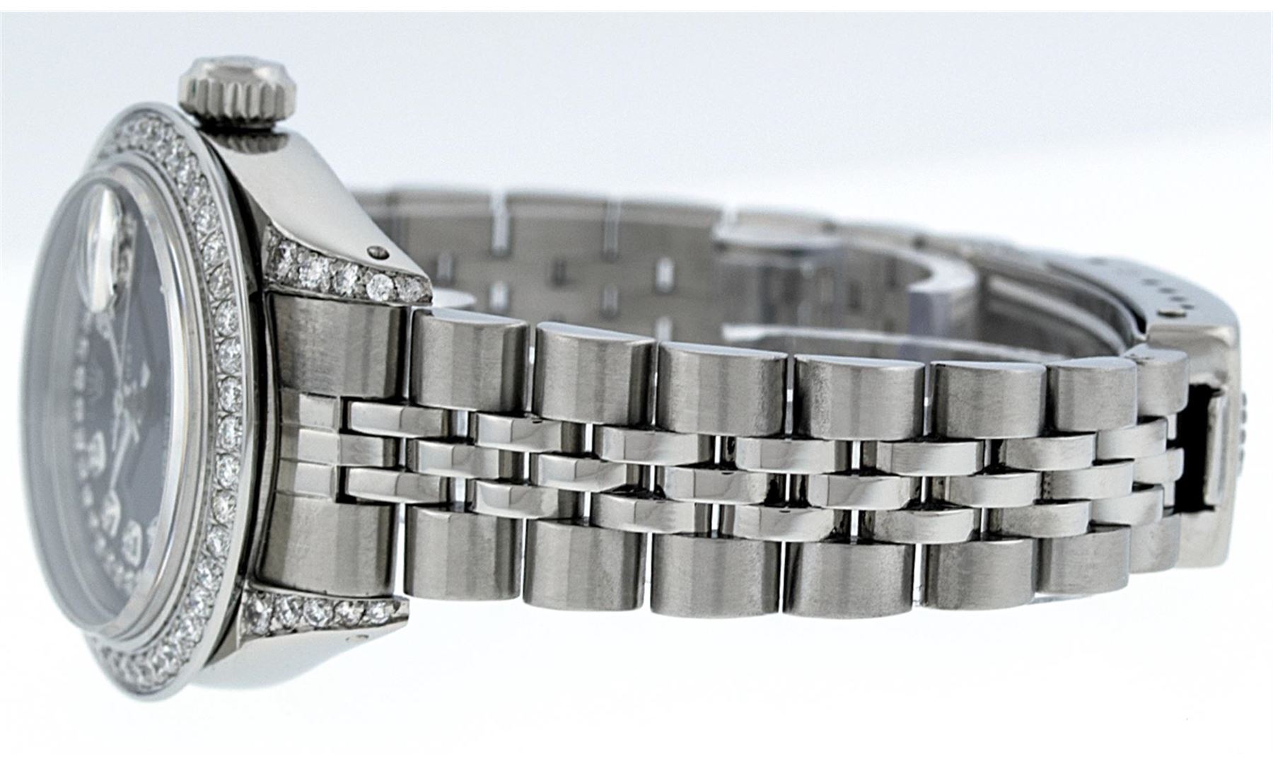 One Ladies Rolex Datejust Polished Bright with Satin Finish, Serviced & Electronically Tested, Stainless Steel Case:26mm, Stainless Steel Crown, Diamond Lugs: 16 Diamonds On Lugs, Clarity: SI-VS, Color: G to H. Custom Bezel: 18K White Gold Beadset Diamond Bezel, Diamond Count: 32 Diamonds Total Weight 1.00 Carat, Clarity: SI-VS, Color: G to H. Custom Crystal: Synthetic Sapphire Cyclops Lens. Movement: Automatic Winding Movement Caliber 2030. Custom Dial: Refinished Black With String Diamond Dial, 43 Diamonds in Dial G To H In Color, Clarity: SI-VS. Date Window: 3 O'Clock Position Date Display, Model: Datejust. Condition: G-6 Extra Fine. Bracelet: Stainless Steel Jubilee. Bright Polish & Satin Finish. 6.0 Inch Length, Adjustable. Standard Clasp, With Rolex Logo.