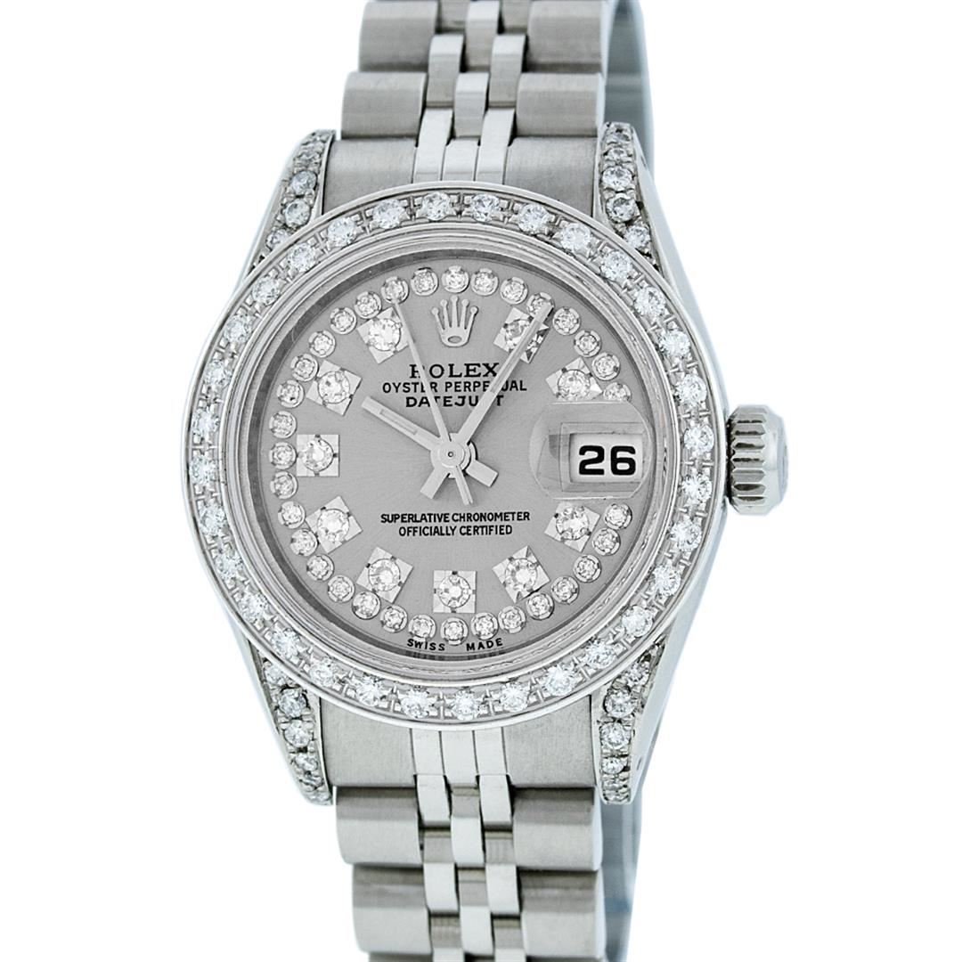 One Ladies Rolex Datejust Polished Bright with Satin Finish, Serviced & Electronically Tested, Stainless Steel Case:26mm, Stainless Steel Crown, Diamond Lugs: 16 Diamonds On Lugs, Clarity: SI-VS, Color: G to H. Custom Bezel: 18K White Gold Beadset Bezel, Diamond Count: 32 Diamonds, Total Weight 1.00 Carat, Clarity: SI-VS, Color: G to H. Custom Crystal: Synthetic Sapphire Cyclops Lens. Movement: Automatic Winding Movement Caliber 2030. Custom Dial: Refinished Slate Grey String With Diamond Dial, 43 Diamonds in Dial G To H In Color, Clarity: VS. Date Window: 3 O'Clock Position Date Display, Model: Datejust Condition: G-6 Extra Fine. Bracelet: Stainless Steel Jubilee. Bright Polish & Satin Finish. 6.0 Inch Length, Adjustable. Standard Clasp, With Rolex Logo.
