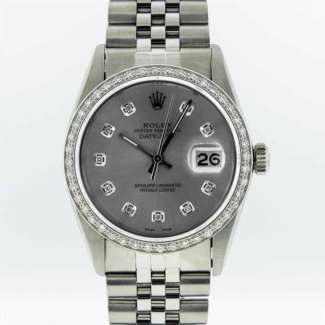 One Mens Rolex Datejust Polished, Serviced & Electronically Tested, Stainless Steel Case:36mm, Stainless Steel Crown, Custom Bezel: 18K White Beadset Diamond Bezel, Diamond Count: 44 Diamonds . Total Weight 1.00 Carat, Clarity: SI-VS, Color: G to H. Custom Crystal: Synthetic Sapphire Cyclops Lens. Movement: Automatic Winding Movement Caliber 3035. Custom Dial: Slate Grey With Diamond Hour Markers, 10 Diamond Dial. G To H In Color, Clarity: SI-VS. Date Window: 3 O'Clock Position Date Display, Quickset, Model: Datejust. Condition: G-6 Extra Fine. Bracelet: Stainless Steel Jubilee. Bright Polish & Satin Finish. 7.0 Inch Length, Adjustable. Standard Clasp, With Rolex Logo.