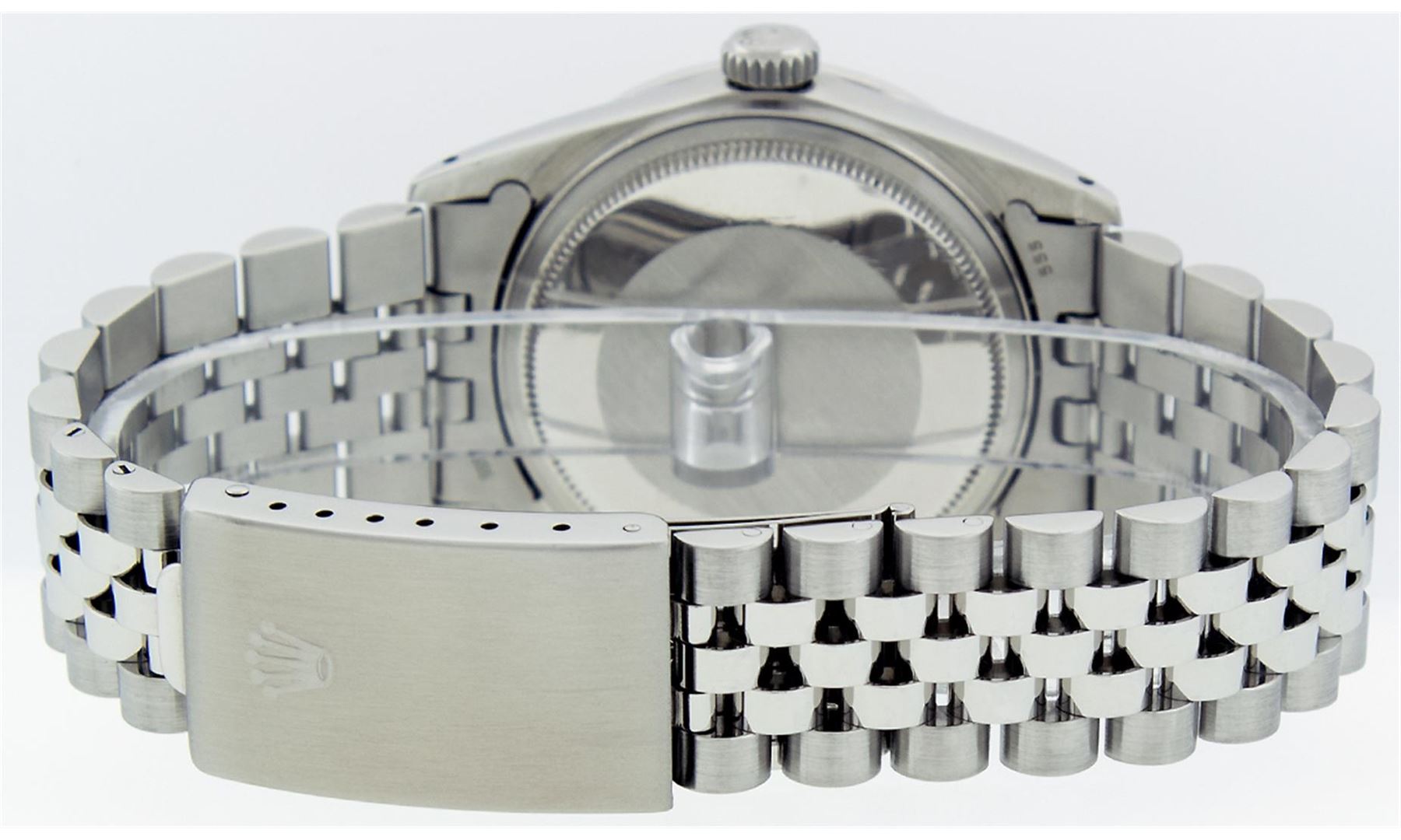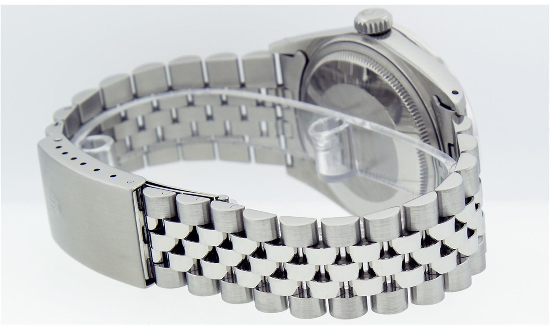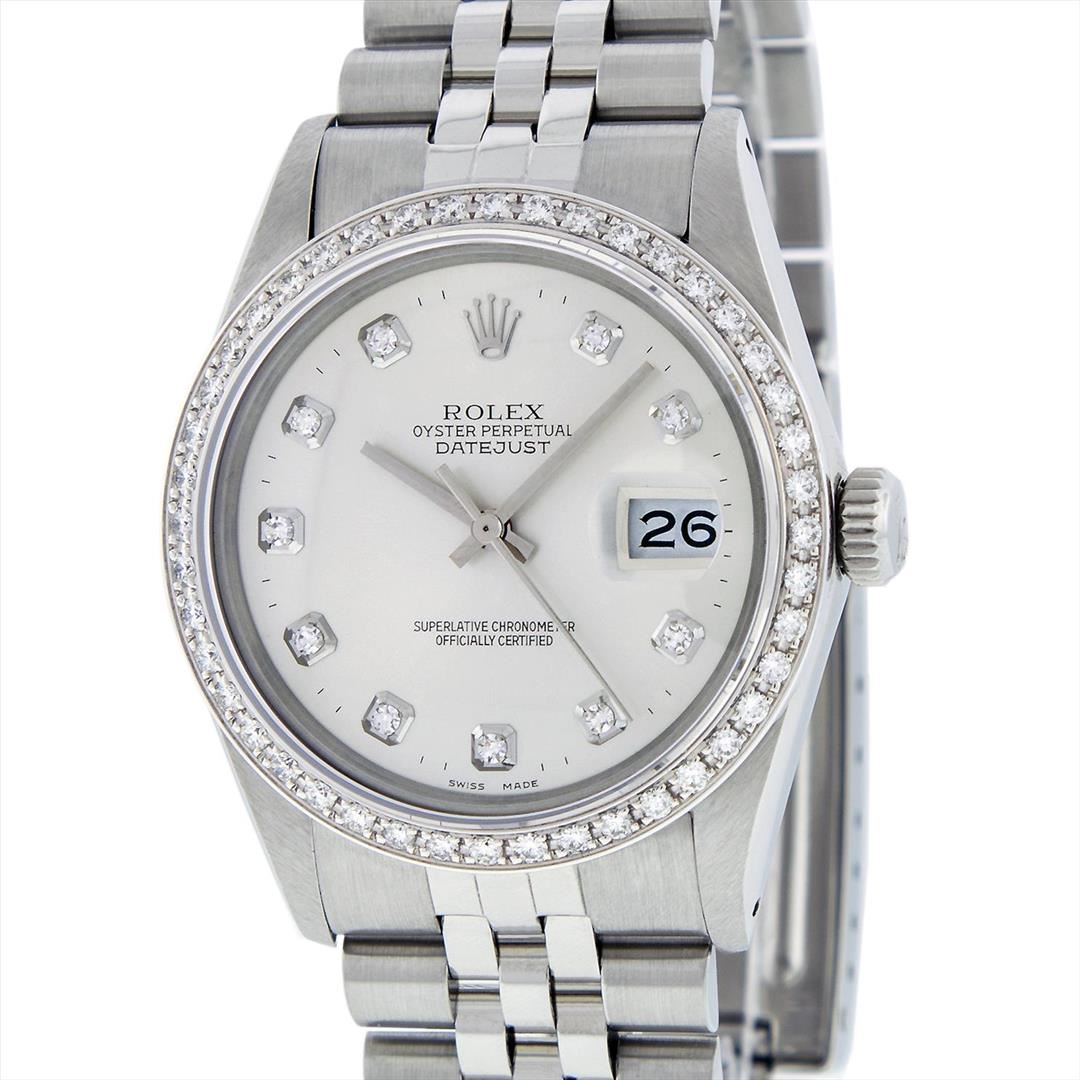 One Mens Stainless Steel Rolex Datejust Polished Bright with Satin Finish, Fully Serviced & Electronically Tested, Stainless Steel Case:36mm, Stainless Steel Crown, Custom Bezel: 18K White Gold Beadset Diamond Bezel, Diamond Count: 44 Diamonds Total Weight 1.00 Carat, Clarity: SI-VS, Color: G to H. Custom Crystal: Synthetic Sapphire Cyclops Lens. Movement: Automatic Winding Movement Caliber 3035. Custom Dial: Silver With Diamond Hour Markers And Line Track, 10 Diamonds in Dial G To H In Color, Clarity: SI-VS. Date Window: 3 O'Clock Position Date Display, Quickset, Model: Datejust, Condition: G-6 Extra Fine. Bracelet: Stainless Steel Jubilee. Bright Polish & Satin Finish. 7.0 Inch Length, Adjustable. Standard Clasp, With Rolex Logo.