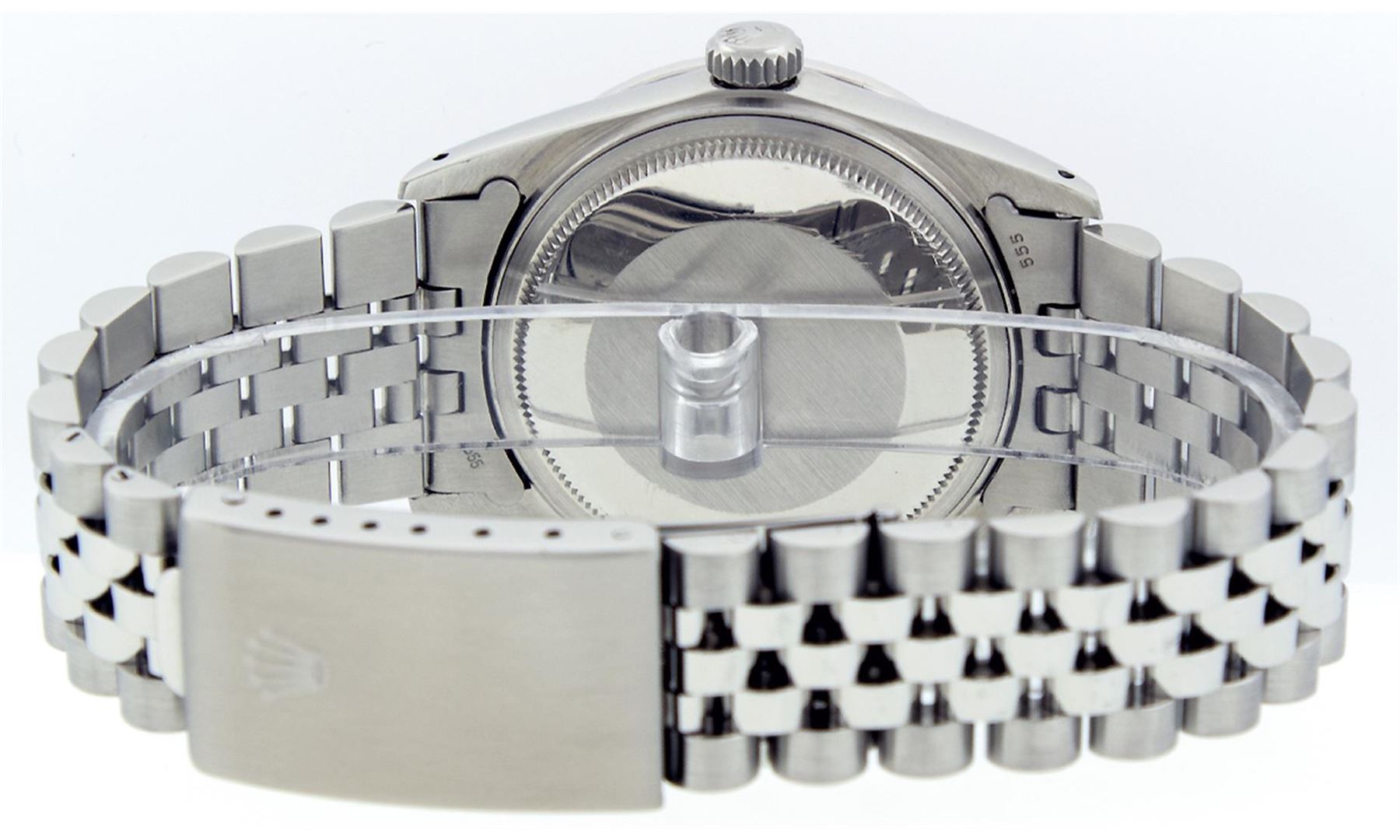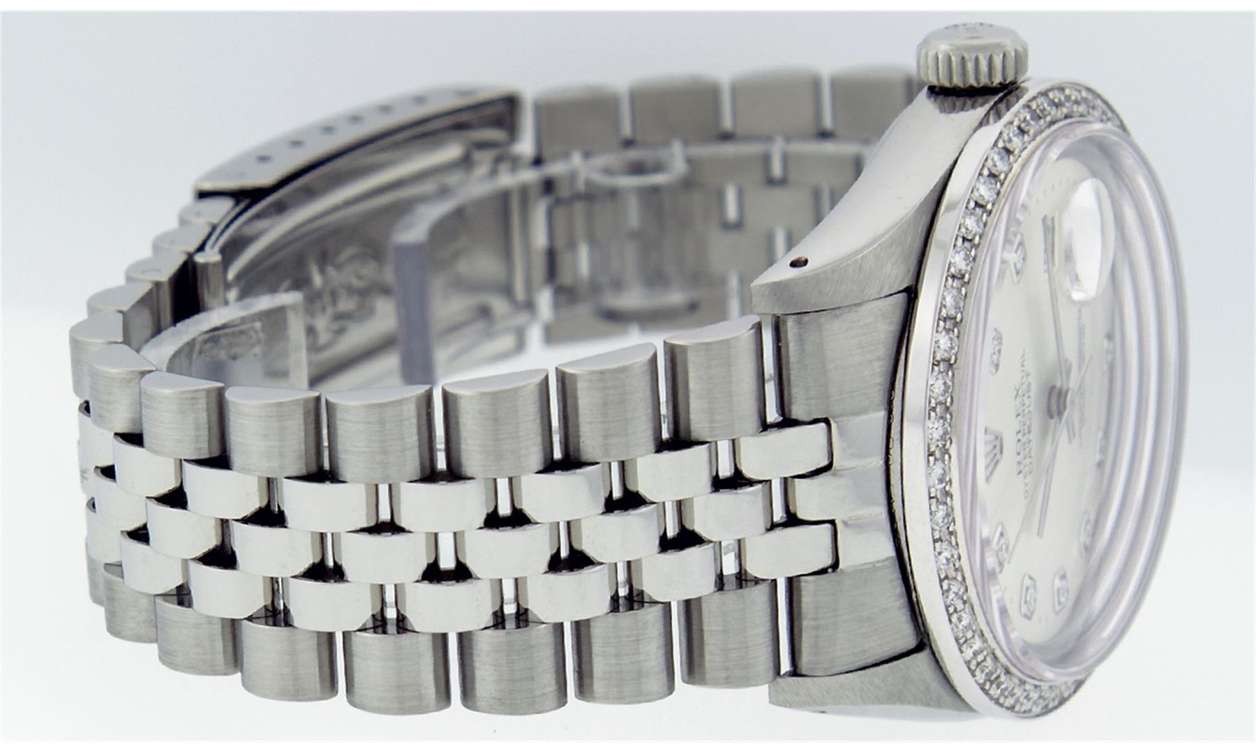 One Mens Stainless Steel Rolex Datejust Polished Bright with Satin Finish, Fully Serviced & Electronically Tested, Stainless Steel Case:36mm, Stainless Steel Crown, Custom Bezel: 18K White Gold Beadset Diamond Bezel, Diamond Count: 44 Diamonds Total Weight 1.00 Carat, Clarity: SI-VS, Color: G to H. Custom Crystal: Synthetic Sapphire Cyclops Lens. Movement: Automatic Winding Movement Caliber 3035. Custom Dial: Silver With Diamond Hour Markers And Line Track, 10 Diamonds in Dial G To H In Color, Clarity: SI-VS. Date Window: 3 O'Clock Position Date Display, Quickset, Model: Datejust, Condition: G-6 Extra Fine. Bracelet: Stainless Steel Jubilee. Bright Polish & Satin Finish. 7.0 Inch Length, Adjustable. Standard Clasp, With Rolex Logo.