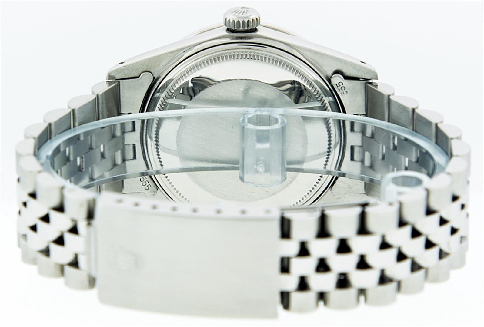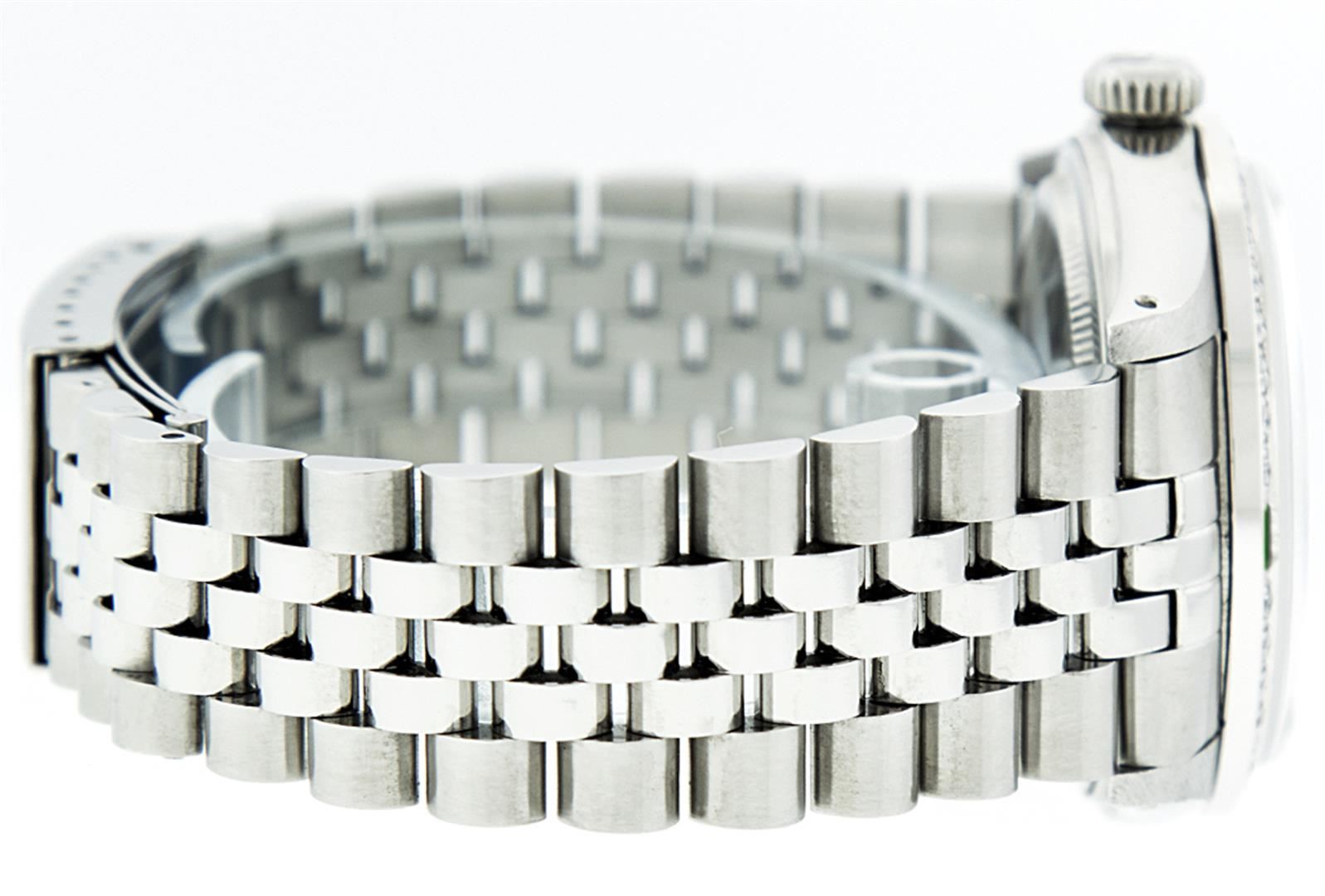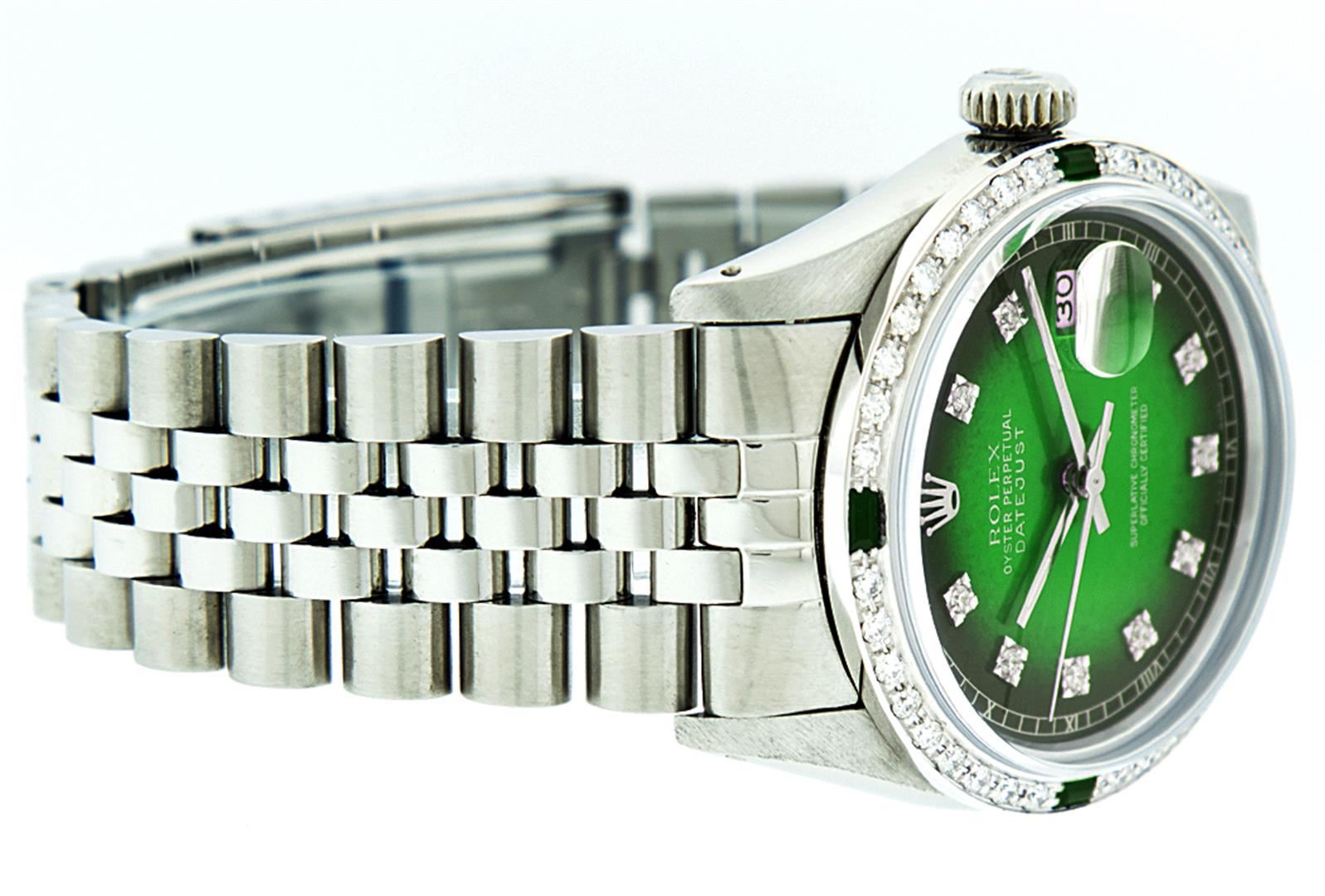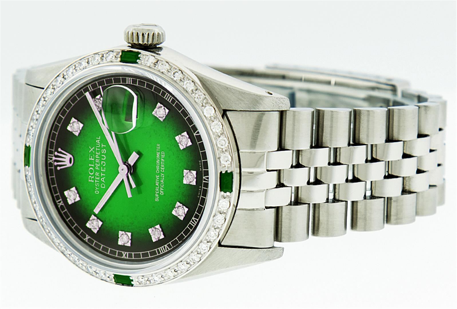 One Mens Rolex Datejust Polished, Serviced & Electronically Tested, Stainless Steel Case:36mm, Stainless Steel Crown, Custom Bezel: 18K White Gold Emerald Beadset Diamond Bezel, Diamond + Gem Count: 36 Diamonds + 4 Emeralds. Total Weight 1.00 Carat, Clarity: SI-VS, Color: G to H. Custom Crystal: Synthetic Sapphire Cyclops Lens. Movement: Automatic Winding Movement Caliber 3035. Custom Dial: Green Vignette With Diamond Hour Markers and Square Roman Track, 10 Diamond Dial Square Setting. G To H In Color, Clarity: SI-VS. Date Window: 3 O'Clock Position Date Display, Quickset, Model: Datejust. Condition: G-6 Extra Fine. Bracelet: Stainless Steel Jubilee. Bright Polish & Satin Finish. 7.0 Inch Length, Adjustable. Standard Clasp, With Rolex Logo.