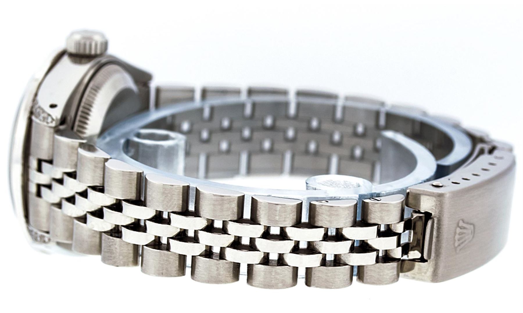 One Ladies Rolex Datejust Polished Bright with Satin Finish, Serviced & Electronically Tested, Stainless Steel Case:26mm, Stainless Steel Crown, Diamond Lugs: 16 Diamonds On Lugs, Clarity: SI-VS, Color: G to H. Custom Bezel: 18K White Gold Sapphire Bezel, Diamond Count: 28 Diamonds + 4 Sapphires, Total Weight 1.00 Carat, Clarity: SI-VS, Color: G to H. Custom Crystal: Synthetic Sapphire Cyclops Lens. Movement: Automatic Winding Movement Caliber 2030. Custom Dial: Refinished Blue MOP With String Diamond Dial, 43 Diamonds in Dial G To H In Color, Clarity: VS. Date Window: 3 O'Clock Position Date Display, Non Quickset, Model: Datejust. Condition: G-6 Extra Fine. Bracelet: Stainless Steel Jubilee. Bright Polish & Satin Finish. 6.0 Inch Length, Adjustable. Standard Clasp, With Rolex Logo.