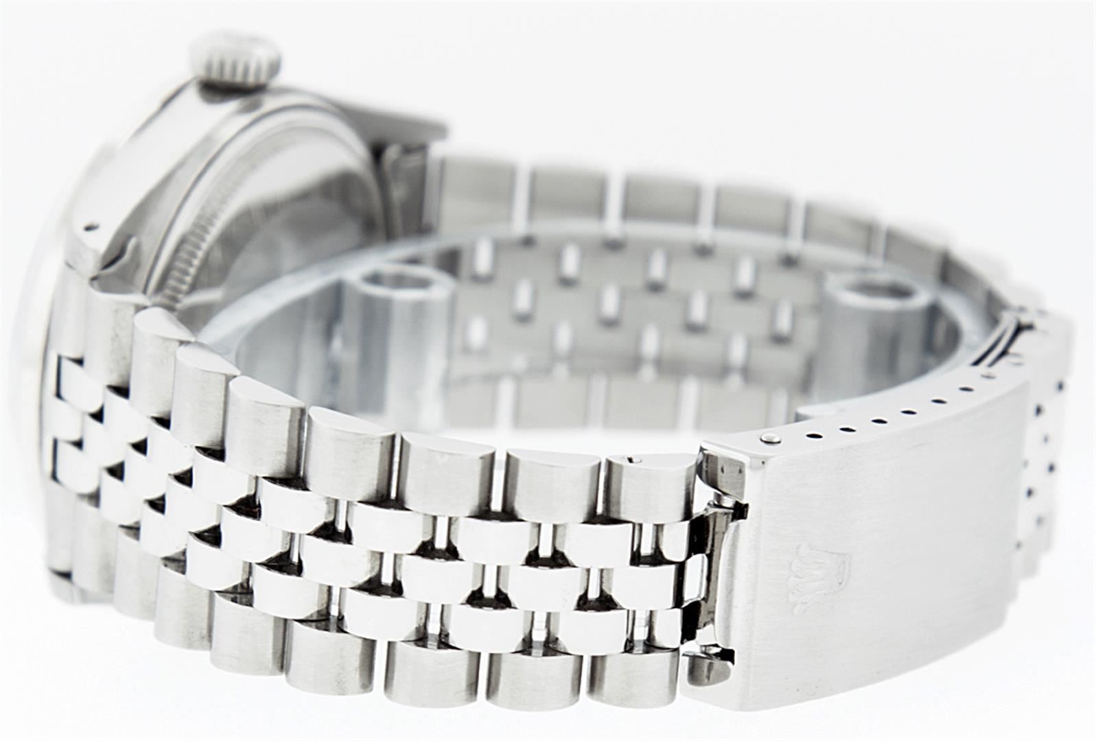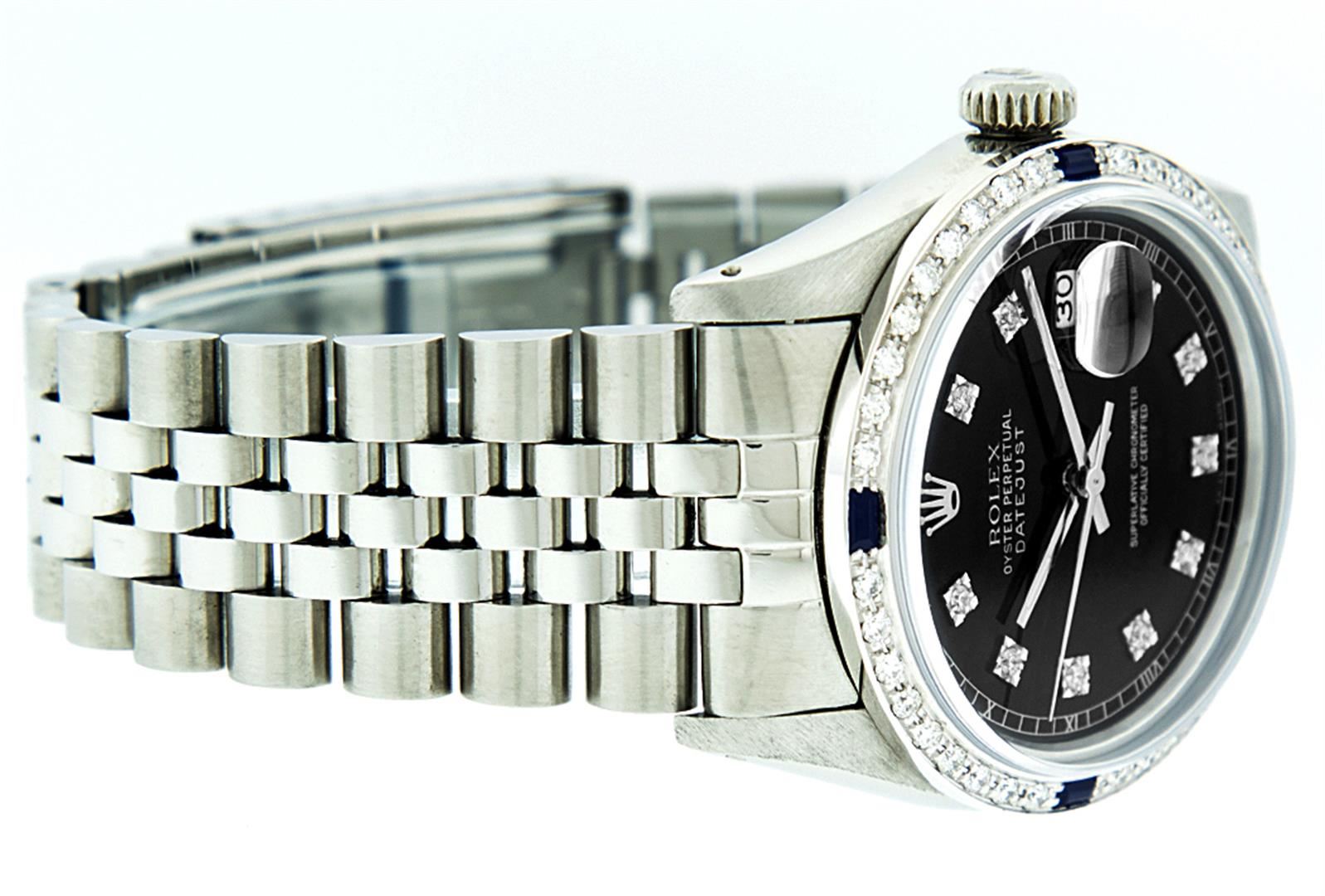 One Mens Rolex Datejust Polished, Serviced & Electronically Tested, Stainless Steel Case:36mm, Stainless Steel Crown, Custom Bezel: 18K White Gold Sapphire Beadset Diamond Bezel, Diamond + Gem Count: 36 Diamonds + 4 Sapphires. Total Weight 1.00 Carat, Clarity: SI-VS, Color: G to H. Custom Crystal: Synthetic Sapphire Cyclops Lens. Movement: Automatic Winding Movement Caliber 3035. Custom Dial: Black With Diamond Hour Markers Square Roman Track, 10 Diamond Dial Square Setting. G To H In Color, Clarity: SI-VS. Date Window: 3 O'Clock Position Date Display, Quickset, Model: Datejust. Condition: G-6 Extra Fine. Bracelet: Stainless Steel Jubilee. Bright Polish & Satin Finish. 7.0 Inch Length, Adjustable. Standard Clasp, With Rolex Logo.