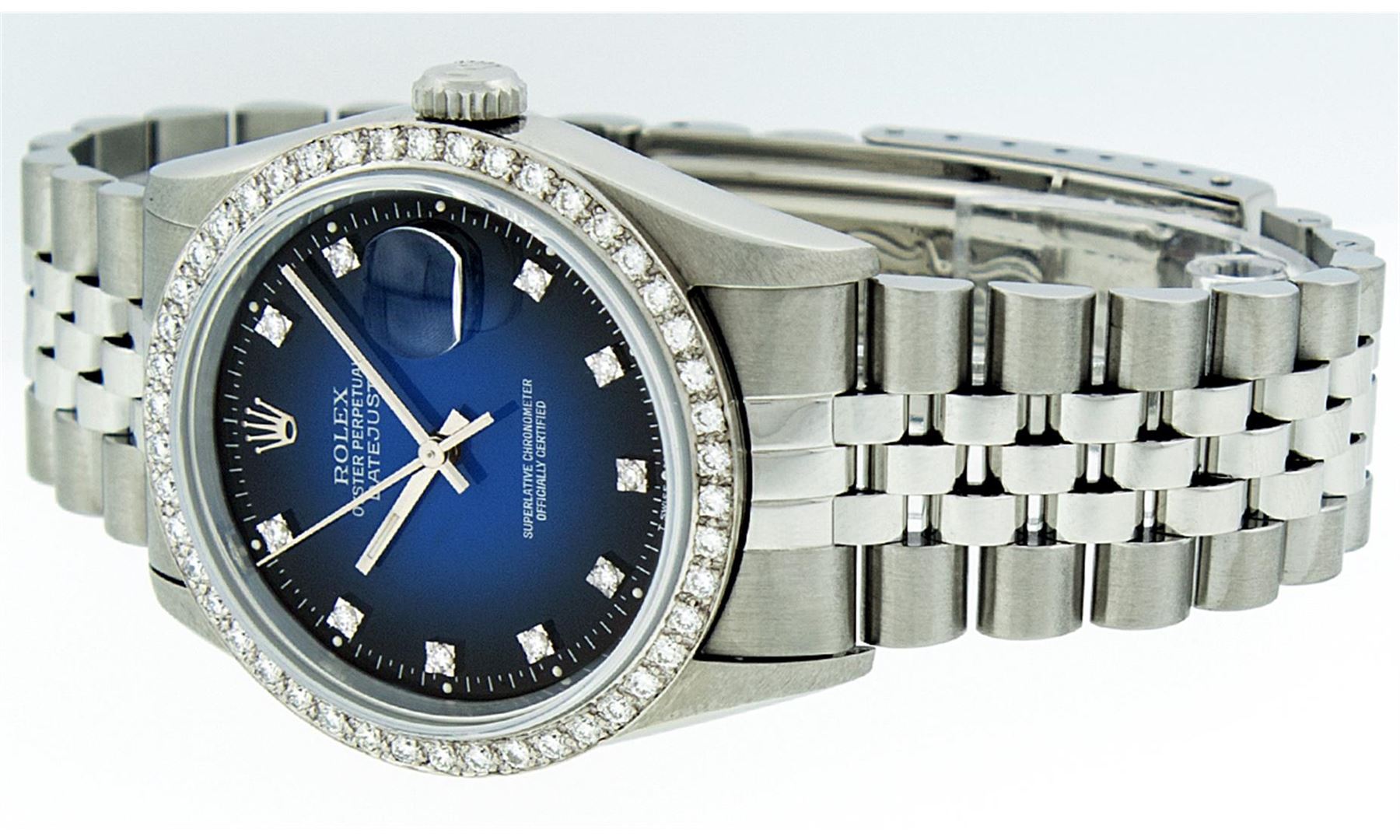 One Mens Stainless Steel Rolex Datejust Polished Bright with Satin Finish, Fully Serviced & Electronically Tested, Stainless Steel Case:36mm, Stainless Steel Crown, Custom Bezel: 18K White Gold Beadset Diamond Bezel, Diamond Count: 46 Diamonds Total Weight 1.40 Carat, Clarity: SI-VS, Color: G to H. Custom Crystal: Synthetic Sapphire Cyclops Lens. Movement: Automatic Winding Movement Caliber 3035. Custom Dial: Blue Vignette Diamond With Line Track & Lumi Dots, 10 Single Cut Diamonds in Dial G To H In Color, Clarity: VS. Date Window: 3 O'Clock Position Date Display, Quickset, Model: Datejust, Condition: G-6 Extra Fine. Bracelet: Stainless Steel Jubilee. Bright Polish & Satin Finish. 7.0 Inch Length, Adjustable. Standard Clasp, With Rolex Logo.