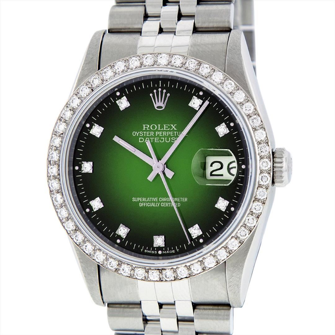 One Mens Stainless Steel Rolex Datejust Polished Bright with Satin Finish, Fully Serviced & Electronically Tested, Stainless Steel Case:36mm, Stainless Steel Crown, Custom Bezel: 18K White Gold Beadset Diamond Bezel, Diamond Count: 46 Diamonds Total Weight 1.40 Carat, Clarity: SI-VS, Color: G to H. Custom Crystal: Synthetic Sapphire Cyclops Lens. Movement: Automatic Winding Movement Caliber 3035. Custom Dial: Green Vignette Diamond With Line Track & Lumi Dots, 10 Single Cut Diamonds in Dial G To H In Color, Clarity: VS. Date Window: 3 O'Clock Position Date Display, Quickset, Model: Datejust, Condition: G-6 Extra Fine. Bracelet: Stainless Steel Jubilee. Bright Polish & Satin Finish. 7.0 Inch Length, Adjustable. Standard Clasp, With Rolex Logo.