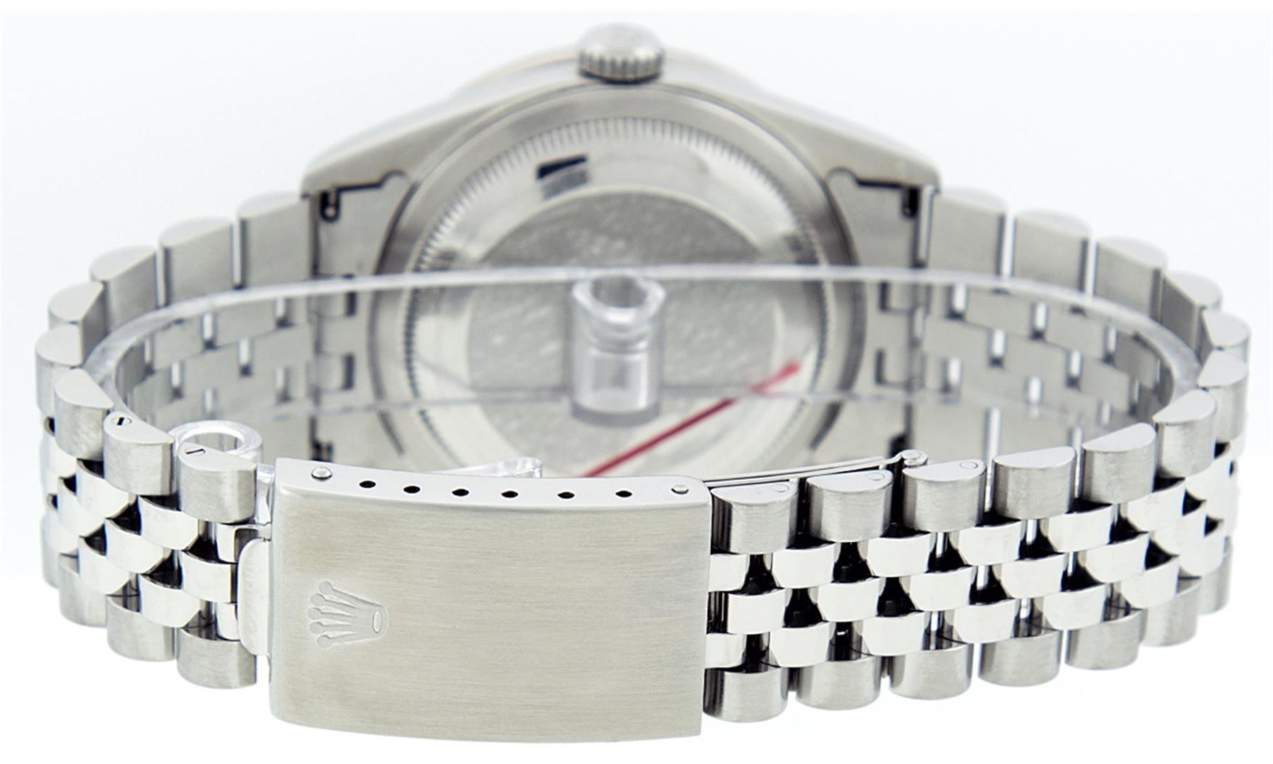 One Mens Stainless Steel Rolex Datejust Polished Bright with Satin Finish, Fully Serviced & Electronically Tested, Stainless Steel Case:36mm, Stainless Steel Crown, Custom Bezel: 18K White Gold Beadset Diamond Bezel, Diamond Count: 46 Diamonds Total Weight 1.40 Carat, Clarity: SI-VS, Color: G to H. Custom Crystal: Synthetic Sapphire Cyclops Lens. Movement: Automatic Winding Movement Caliber 3035. Custom Dial: Green Vignette Diamond With Line Track & Lumi Dots, 10 Single Cut Diamonds in Dial G To H In Color, Clarity: VS. Date Window: 3 O'Clock Position Date Display, Quickset, Model: Datejust, Condition: G-6 Extra Fine. Bracelet: Stainless Steel Jubilee. Bright Polish & Satin Finish. 7.0 Inch Length, Adjustable. Standard Clasp, With Rolex Logo.