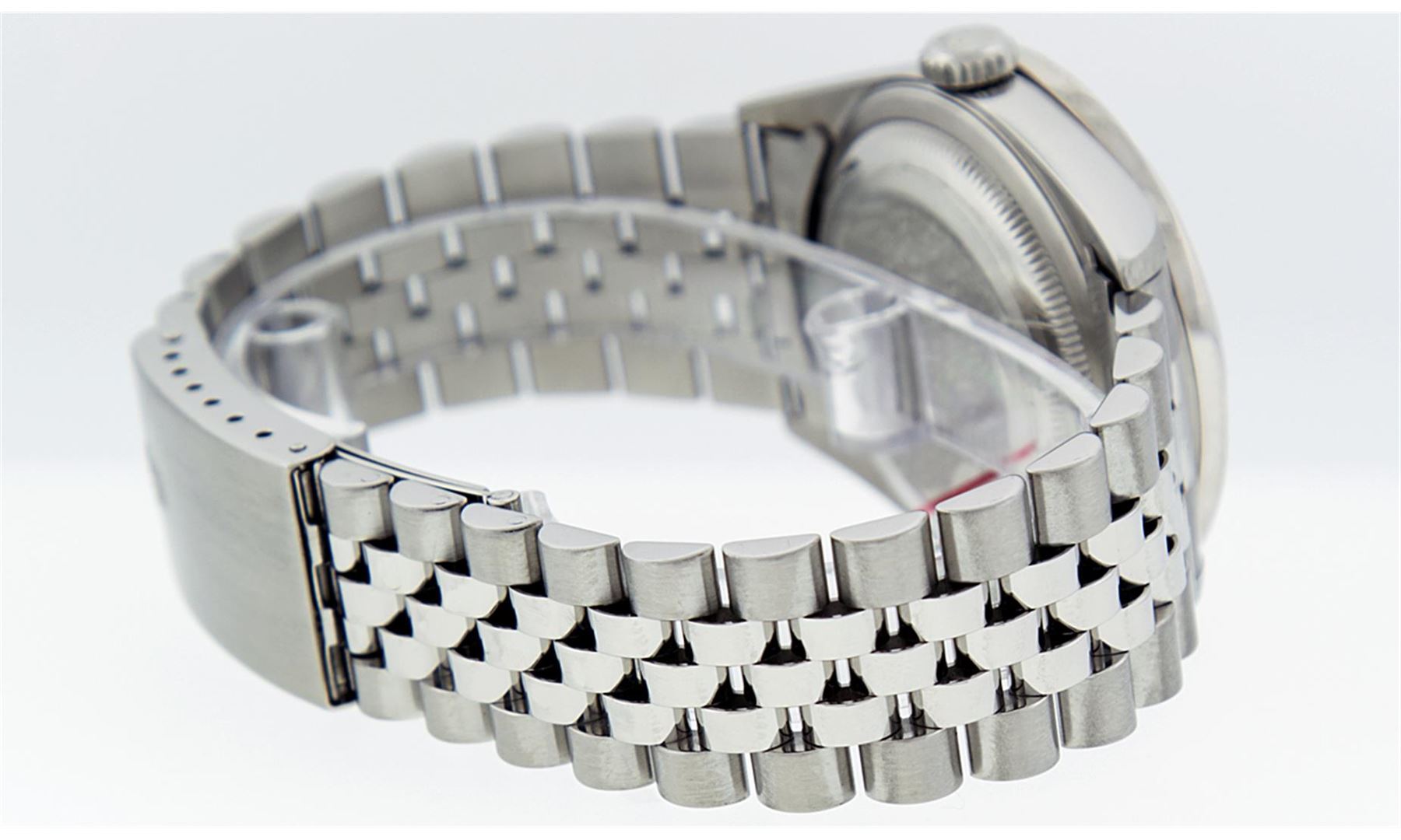 One Mens Stainless Steel Rolex Datejust Polished Bright with Satin Finish, Fully Serviced & Electronically Tested, Stainless Steel Case:36mm, Stainless Steel Crown, Custom Bezel: 18K White Gold Beadset Diamond Bezel, Diamond Count: 46 Diamonds Total Weight 1.40 Carat, Clarity: SI-VS, Color: G to H. Custom Crystal: Synthetic Sapphire Cyclops Lens. Movement: Automatic Winding Movement Caliber 3035. Custom Dial: Blue Vignette Diamond With Line Track & Lumi Dots, 10 Single Cut Diamonds in Dial G To H In Color, Clarity: VS. Date Window: 3 O'Clock Position Date Display, Quickset, Model: Datejust, Condition: G-6 Extra Fine. Bracelet: Stainless Steel Jubilee. Bright Polish & Satin Finish. 7.0 Inch Length, Adjustable. Standard Clasp, With Rolex Logo.