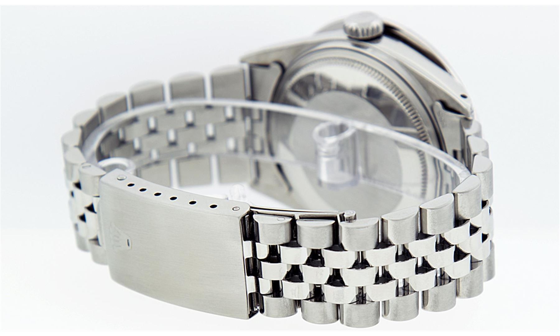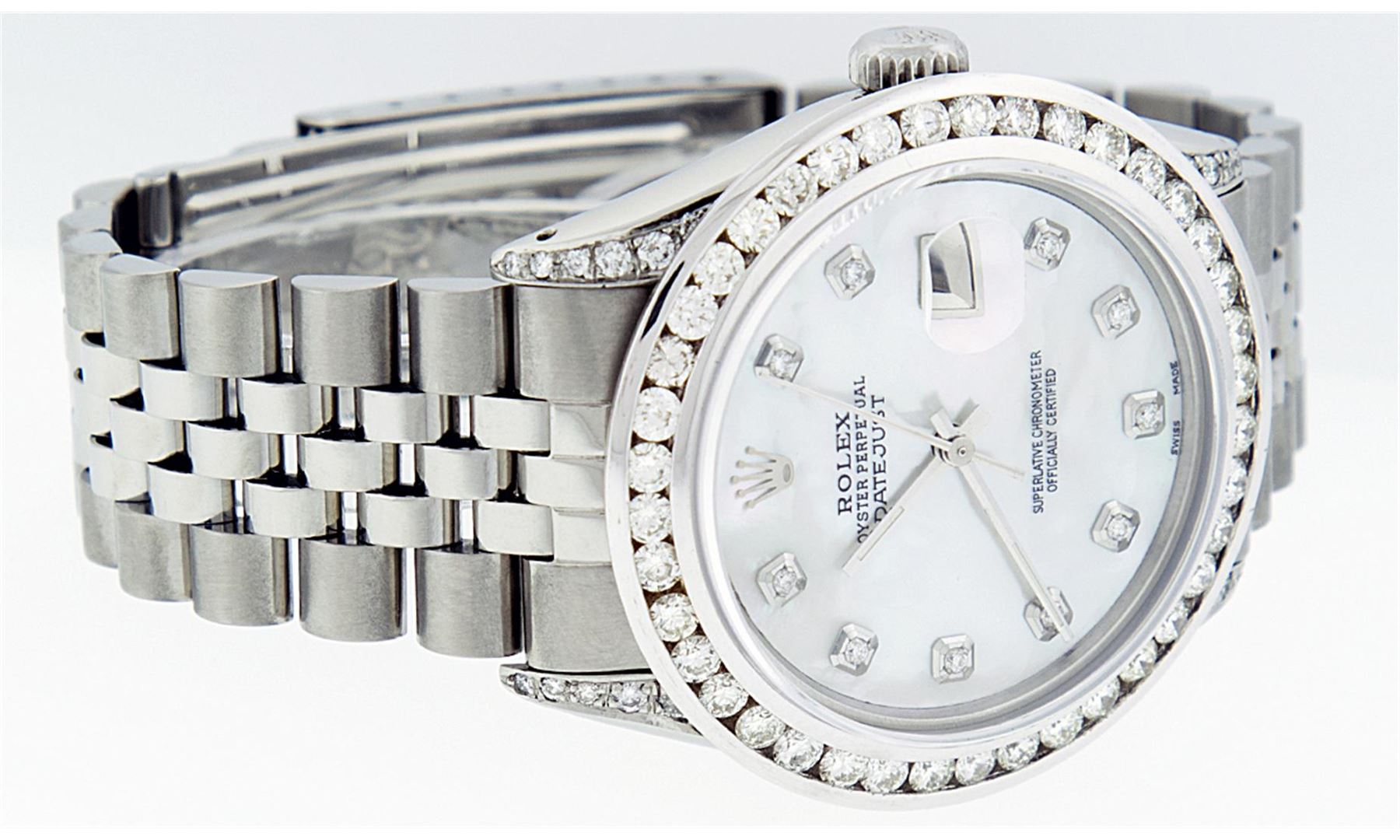 One Mens Rolex Datejust Polished Bright with Satin Finish, Serviced & Electronically Tested, Stainless Steel Case:36mm, Diamond Lugs: 24 Diamonds In Lugs, Color: G to H, Clarity: SI-VS. Stainless Steel Crown, Custom Bezel: 3 Carat 18K White Gold Channel Set Diamond Bezel, Diamond Count: 40 Diamonds, Total Weight 3.00 Carat, Clarity: SI-VS, Color: G to H. Custom Crystal: Synthetic Sapphire Cyclops Lens. Movement: Automatic Winding Movement Caliber 3035. Custom Dial: Mother Of Pearl Diamond, Diamond Count: 10 Diamonds In Dial, Diamond Color: G To H In Color, Clarity: SI-VS. Date Window: 3 O'Clock Position Date Display, Quickset, Model: Datejust Condition: G-6 Extra Fine. Bracelet: Stainless Steel Jubilee. Bright Polish & Satin Finish. 7.0 Inch Length, Adjustable. Standard Clasp, With Rolex Logo.