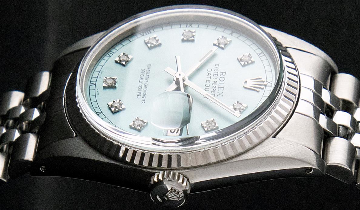 One Mens Rolex Datejust Polished Bright with Satin Finish, Serviced & Electronically Tested, Stainless Steel Case:36mm, Stainless Steel Crown, Original Bezel: 18K White Gold Fluted Bezel. Custom Crystal: Sapphire Cyclops Lens. Movement: Automatic Winding Movement Caliber 3135. Custom Dial: Ice Blue Dial With Diamond Hour Markers and Track Square Setting, 10 Diamond in Dial G To H In Color, Si-VS Clarity. Date Window: 3 O'Clock Position Date Display, Quickset, Model: Sapphire 16234 Datejust, Condition: G-6 Extra Fine. Bracelet: Stainless Steel Rolex Jubilee Band. Bright Polish & Satin Finish. 7.0 Inch Length, Adjustable. Standard Clasp, With Rolex Logo.