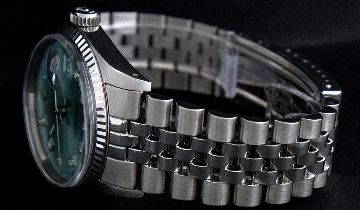 One Mens Rolex Datejust Polished Bright with Satin Finish, Serviced & Electronically Tested, Stainless Steel Case:36mm, Stainless Steel Crown, Original Bezel: 18K White Gold Fluted Bezel. Custom Crystal: Sapphire Cyclops Lens. Movement: Automatic Winding Movement Caliber 3135. Custom Dial: Ice Blue Dial With Diamond Hour Markers and Track Square Setting, 10 Diamond in Dial G To H In Color, Si-VS Clarity. Date Window: 3 O'Clock Position Date Display, Quickset, Model: Sapphire 16234 Datejust, Condition: G-6 Extra Fine. Bracelet: Stainless Steel Rolex Jubilee Band. Bright Polish & Satin Finish. 7.0 Inch Length, Adjustable. Standard Clasp, With Rolex Logo.