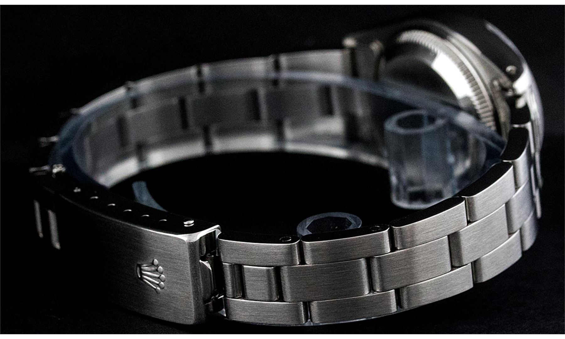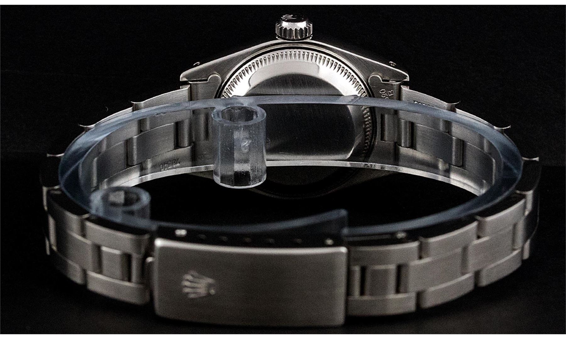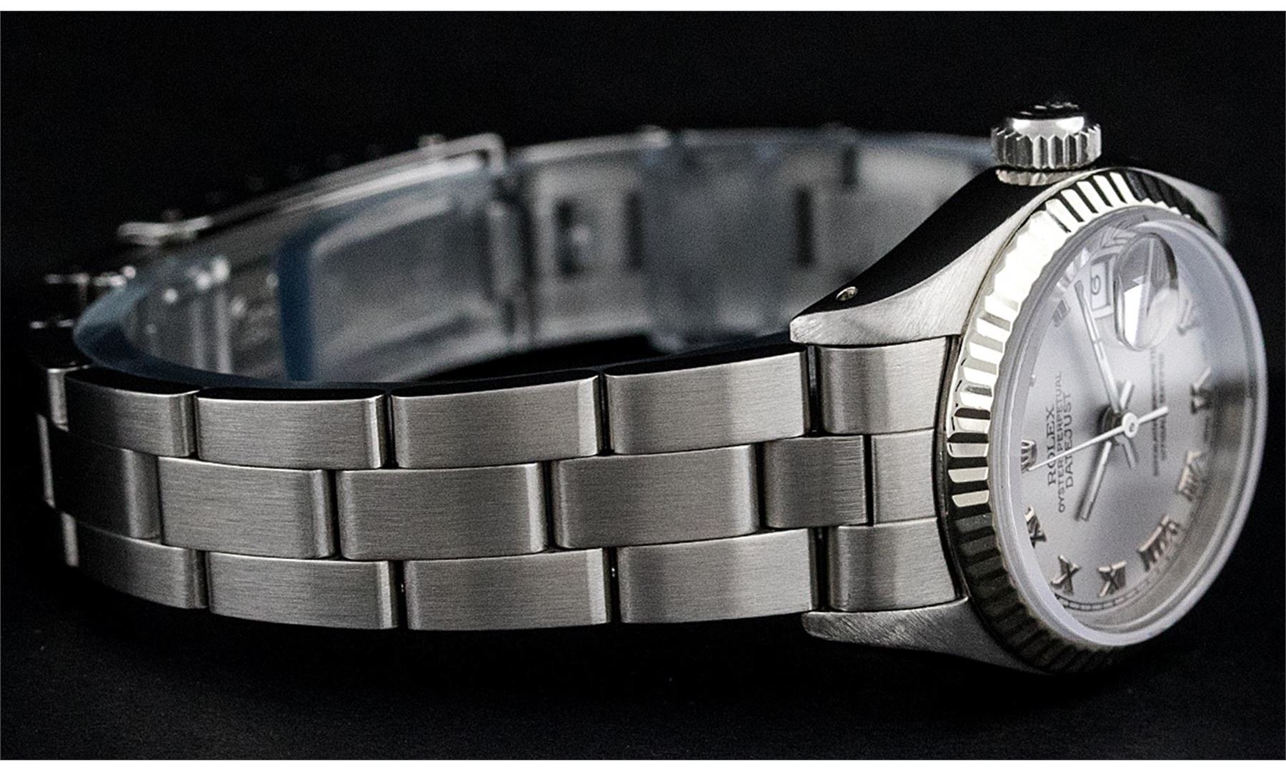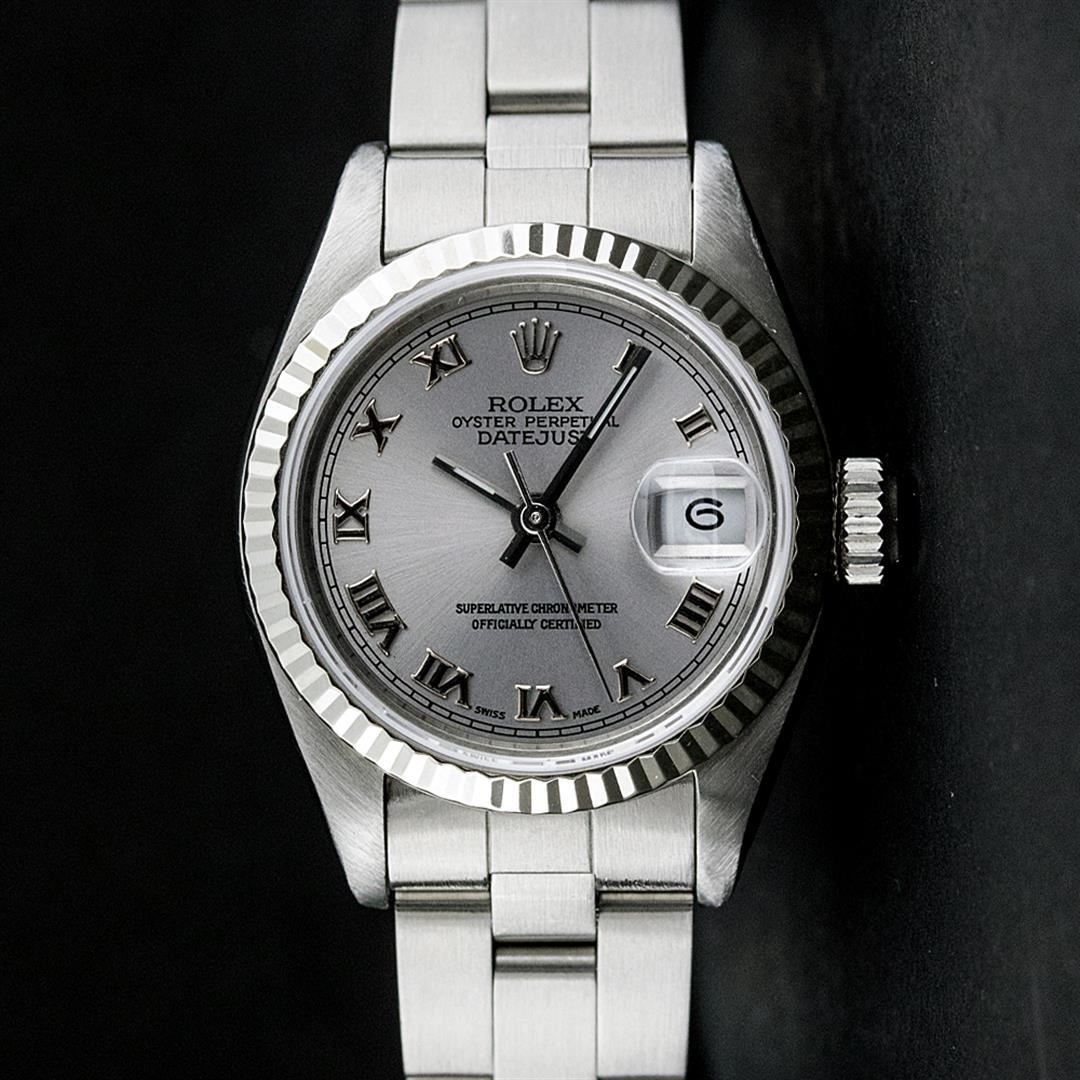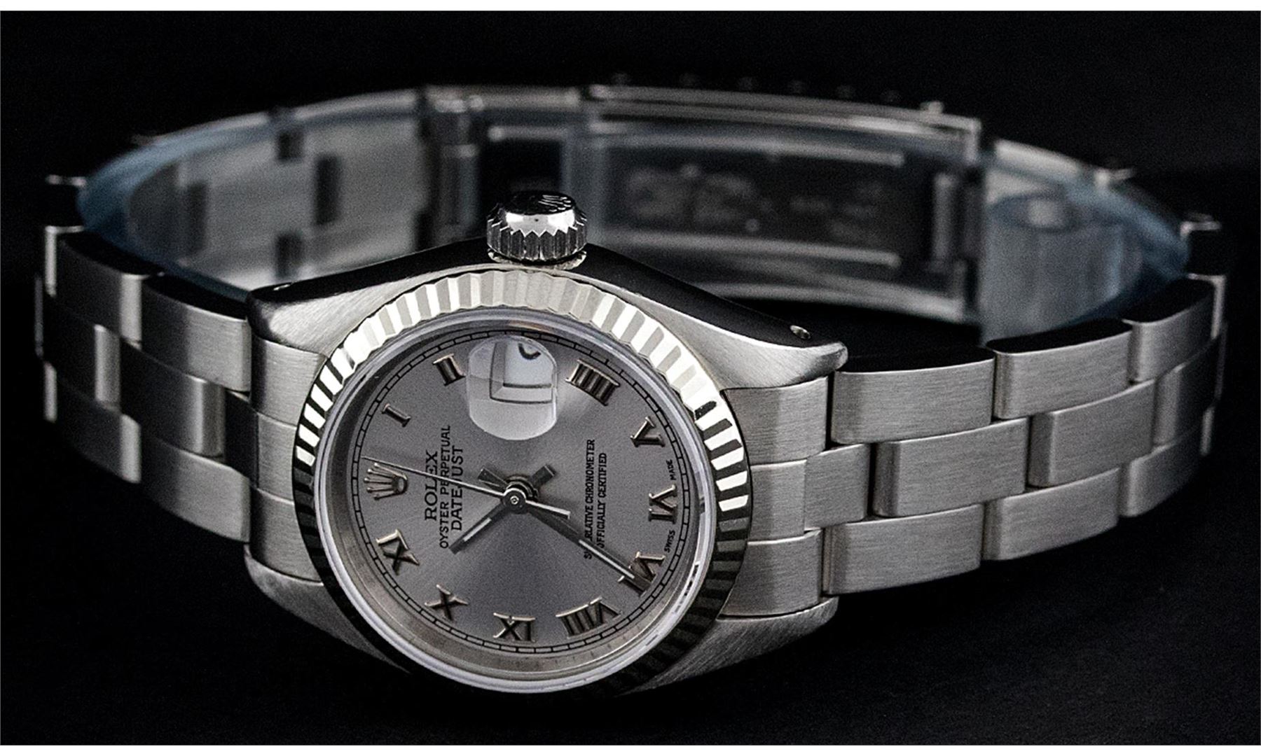 One Ladies Rolex Datejust Polished Bright with Satin Finish, Serviced & Electronically Tested, Stainless Steel Case:26mm, Stainless Steel Crown, Bezel:14K White Gold Fluted. Custom Crystal: Acrylic Cyclops Lens. Movement: Automatic Winding Movement Caliber 2030. Custom Dial: Slate Grey With Roman Hour Markers. Date Window: 3 O'Clock Position Date Display, Model: Datejust Condition: G-6 Extra Fine. Bracelet: Stainless Steel Oyster Band. Bright Polish & Satin Finish. 6.0 Inch Length, Adjustable. Standard Clasp, With Rolex Logo.