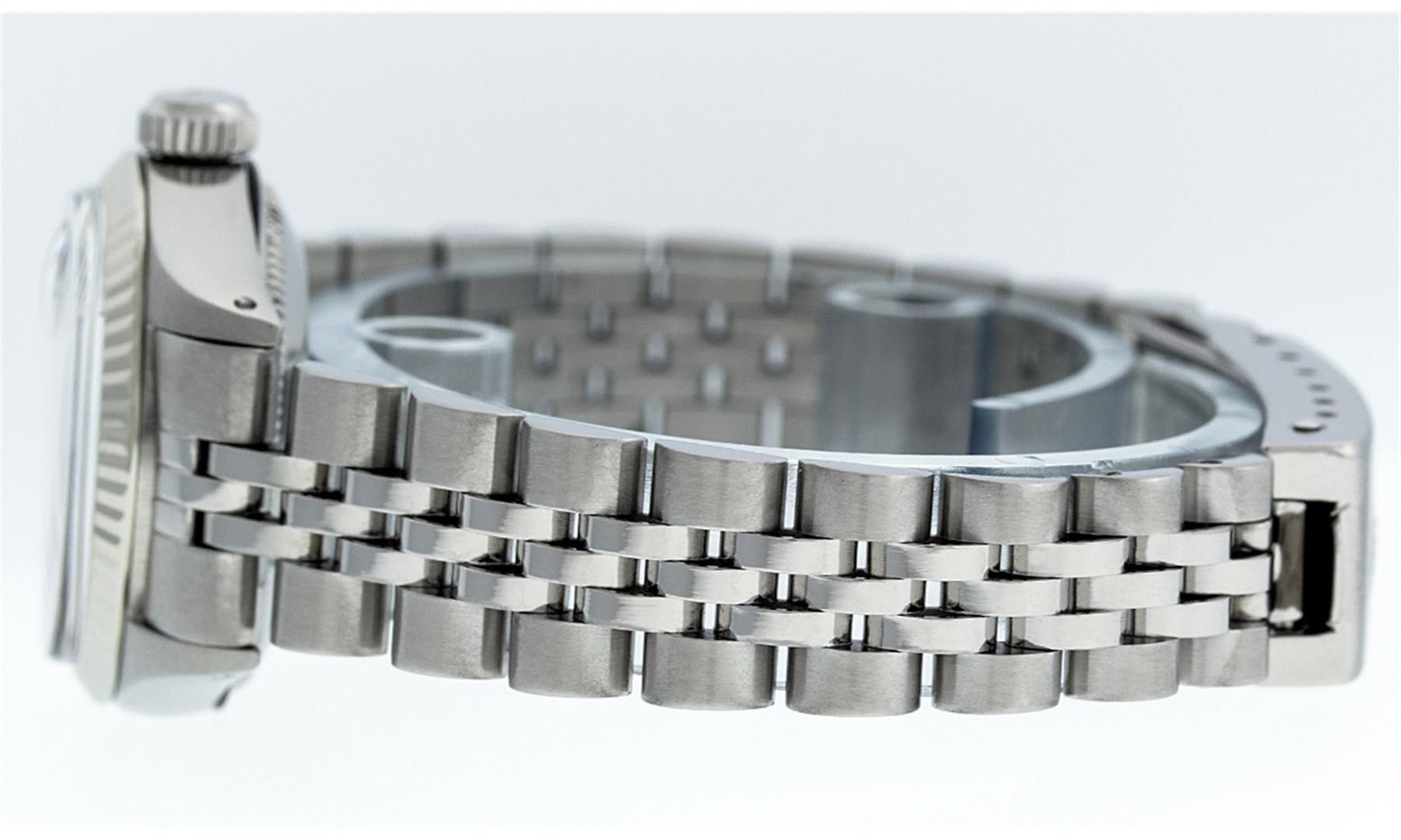 One Ladies Rolex Datejust Polished Bright with Satin Finish, Serviced & Electronically Tested, Stainless Steel Case:26mm, Stainless Steel Crown, Bezel: 14K White Gold Fluted. Custom Crystal: Acrylic Cyclops Lens. Movement: Automatic Winding Movement Caliber 2030. Custom Dial: Silver With Diamond Hour Markers, Diamond Count: 10 Diamonds, Clarity: SI-VS, Color: G to H. Date Window: 3 O'Clock Position Date Display, Model: Datejust. Condition: G-6 Extra Fine. Bracelet: Stainless Steel Jubilee Band. Bright Polish & Satin Finish. 6.0 Inch Length, Adjustable. Standard Clasp, With Rolex Logo.