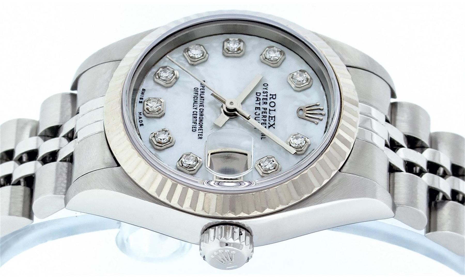 One Ladies Rolex Datejust Polished Bright with Satin Finish, Serviced & Electronically Tested, Stainless Steel Case:26mm, Stainless Steel Crown, Bezel: 18K White Gold Fluted Bezel. Custom Crystal: New Synthetic Sapphire Cyclops Lens. Movement: Automatic Winding Movement Caliber 2235. Custom Dial: Mother Of Pearl Diamond Dial, Diamond Count: 10 Diamonds In Dial, Color: G To H, Clarity: SI-VS. Date Window: 3 O'Clock Position Date Display, Model: No Hole Datejust 79174 Quickset. Condition: G-6 Extra Fine. Bracelet: Stainless Steel Jubilee Band. Bright Polish & Satin Finish. 6.0 Inch Length, Adjustable. Standard Clasp, With Rolex Logo.