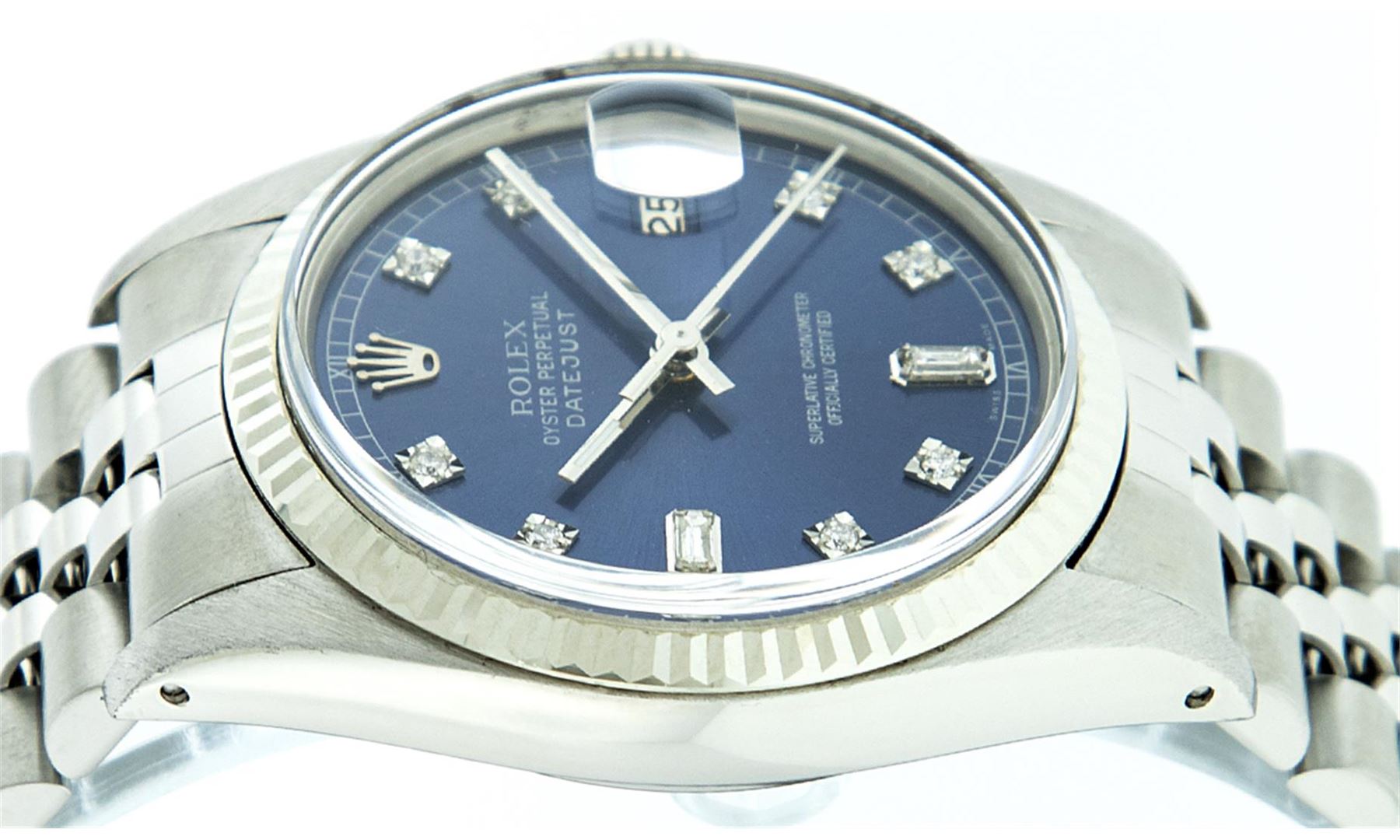 One Mens Rolex Datejust Polished, Serviced & Electronically Tested, Stainless Steel Case:36mm, Stainless Steel Crown, Bezel: 18K White Gold Fluted Bezel. Custom Crystal: Sapphire Cyclops Lens. Movement: Automatic Winding Movement Caliber 3135. Custom Dial: Blue With Diamond Hour Markers Square Setting, Diamond Count: 8 Diamonds + 2 Baguettes, Clarity: SI-VS, Color: G to H. Date Window: 3 O'Clock Position Date Display, Sapphire Quickset, Model: 16234 Sapphire Datejust. Condition: G-6 Extra Fine. Bracelet: Stainless Steel Jubilee. Bright Polish & Satin Finish. 7.0 Inch Length, Adjustable. Standard Clasp, With Rolex Logo.