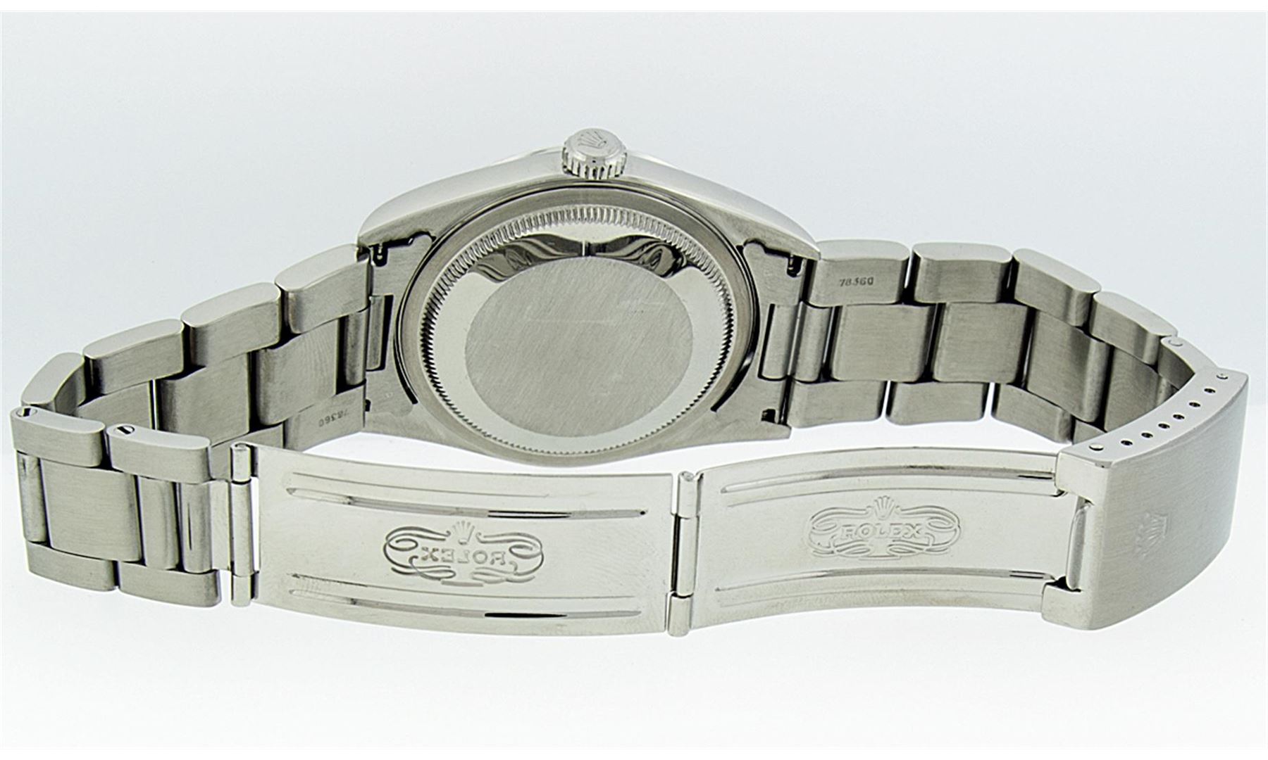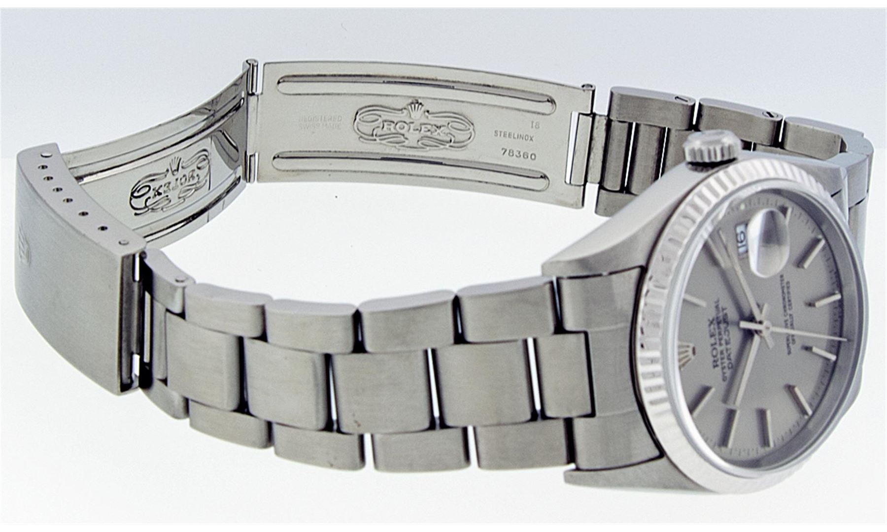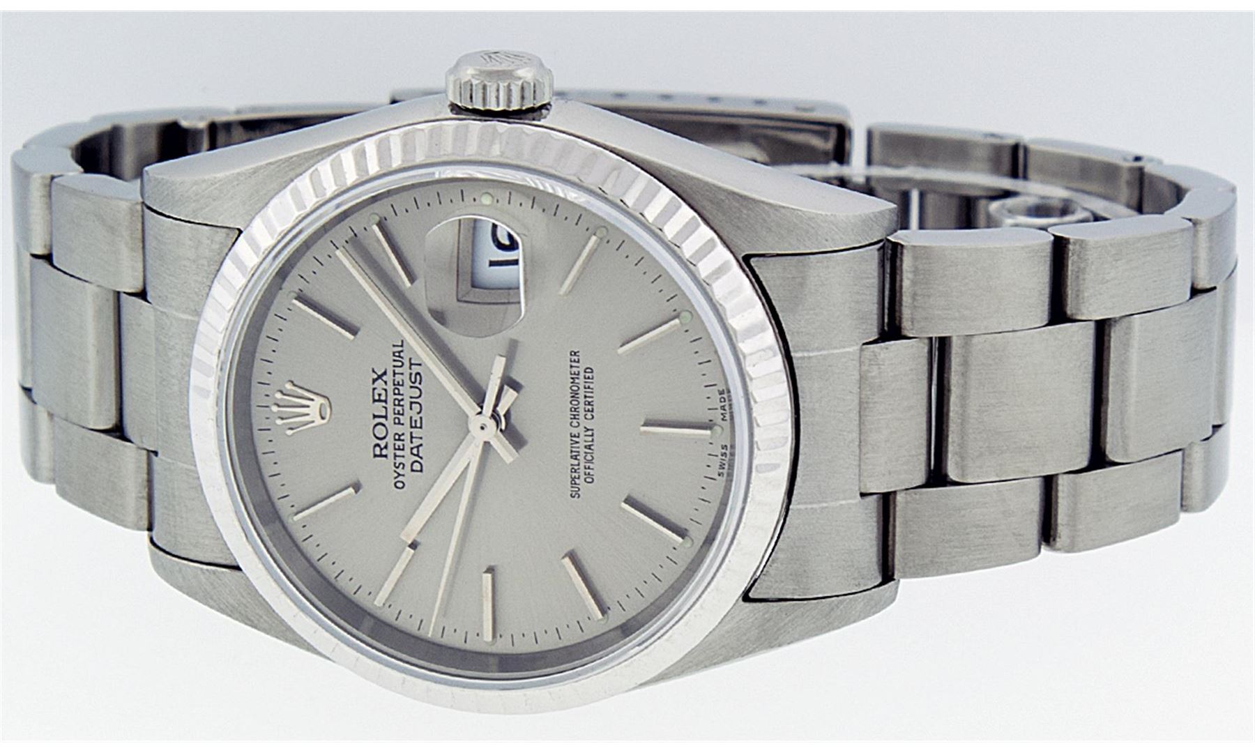 One Gents Rolex Stainless Steel Datejust Polished Bright with Satin Finish, Serviced & Electronically Tested, Stainless Steel Case: 36mm, Stainless Steel Crown, Bezel: 18K White Gold Fluted Bezel. Crystal: Synthetic Sapphire Cyclops Lens. Movement: Automatic Winding Movement Caliber 3135. Custom Dial: Slate Grey Index With Line Track And Lumi Dot. Date Window: 3 O'Clock Position Date Display, Quickset, Model: 16234 Quickset Sapphire Datejust. Condition: G-6 Extra Fine. Bracelet: Stainless Steel Oyster Band. Bright Polish & Satin Finish. 7.0 Inch Length, Adjustable. Standard Clasp, With Rolex Logo.