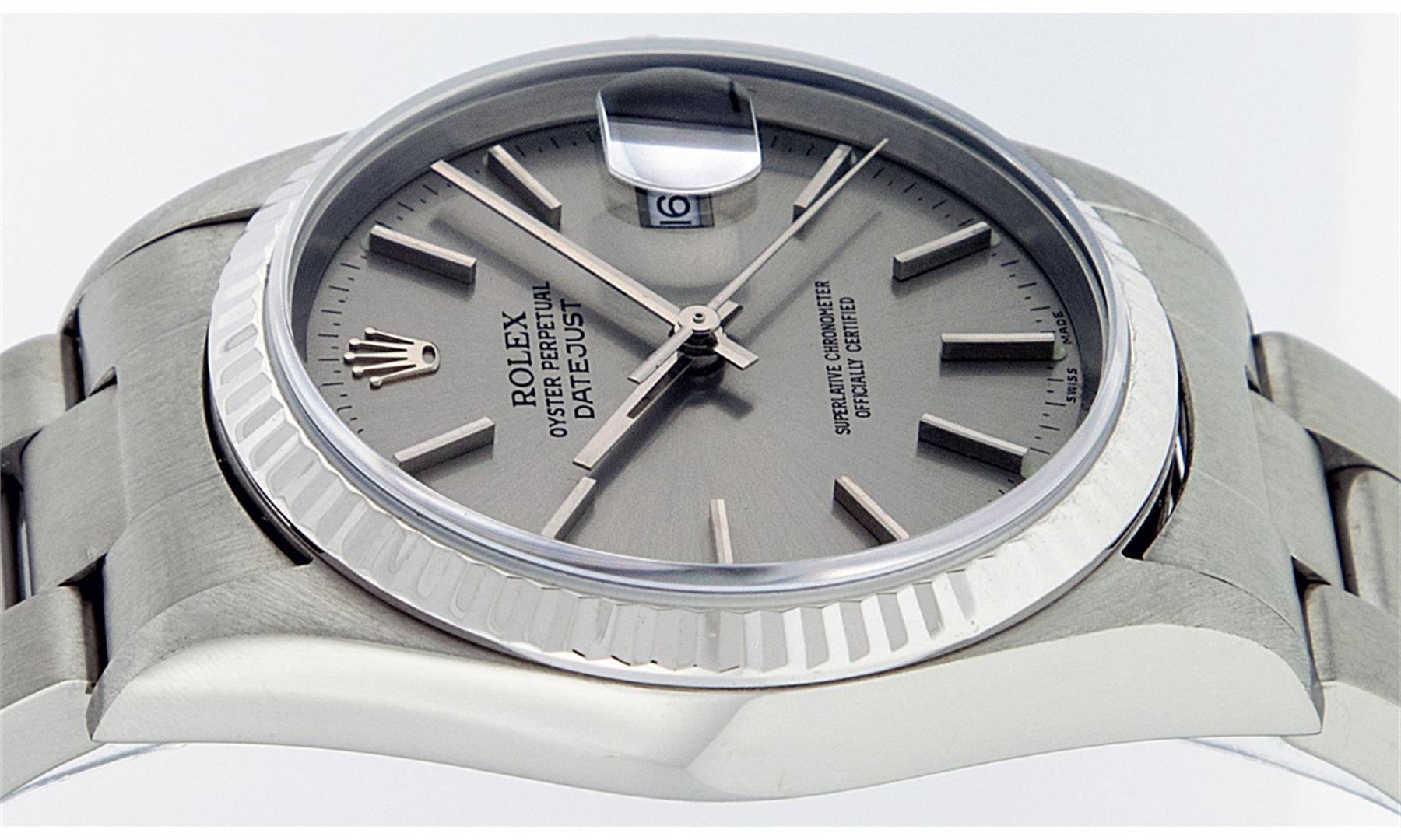 One Gents Rolex Stainless Steel Datejust Polished Bright with Satin Finish, Serviced & Electronically Tested, Stainless Steel Case: 36mm, Stainless Steel Crown, Bezel: 18K White Gold Fluted Bezel. Crystal: Synthetic Sapphire Cyclops Lens. Movement: Automatic Winding Movement Caliber 3135. Custom Dial: Slate Grey Index With Line Track And Lumi Dot. Date Window: 3 O'Clock Position Date Display, Quickset, Model: 16234 Quickset Sapphire Datejust. Condition: G-6 Extra Fine. Bracelet: Stainless Steel Oyster Band. Bright Polish & Satin Finish. 7.0 Inch Length, Adjustable. Standard Clasp, With Rolex Logo.