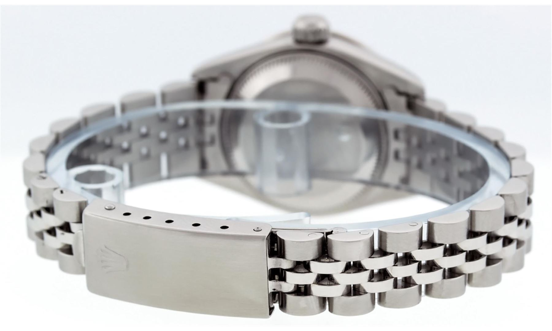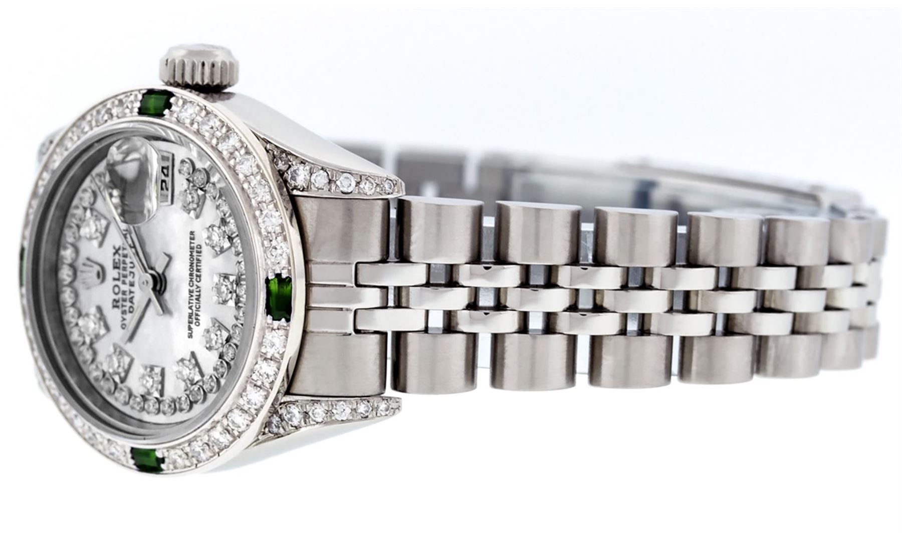 One Ladies Rolex Datejust Polished Bright with Satin Finish, Serviced & Electronically Tested, Stainless Steel Case:26mm, Stainless Steel Crown, Diamond Lugs: 16 Diamonds On Lugs, Clarity: SI-VS, Color: G to H. Custom Bezel: 18K White Gold Beadset Emerald Bezel, Diamond Count: 28 Diamonds + 4 Emeralds, Total Weight 1.00 Carat, Clarity: SI-VS, Color: G to H. Custom Crystal: Synthetic Sapphire Cyclops Lens. Movement: Automatic Winding Movement Caliber 2235. Custom Dial: Refinished Mother Of Pearl String Diamond Dial VS, 43 Diamonds in Dial G To H In Color, Clarity: VS. Date Window: 3 O'Clock Position Date Display, Model: No Hole Datejust Quickset. Condition: G-6 Extra Fine. Bracelet: Stainless Steel Jubilee Band. Bright Polish & Satin Finish. 6.0 Inch Length, Adjustable. Standard Clasp, With Rolex Logo.