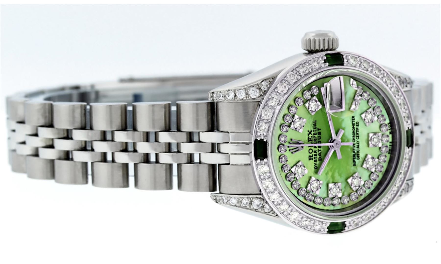 One Ladies Rolex Datejust Polished Bright with Satin Finish, Serviced & Electronically Tested, Stainless Steel Case:26mm, Stainless Steel Crown, Diamond Lugs: 16 Diamonds On Lugs, Clarity: SI-VS, Color: G to H. Custom Bezel: 18K White Gold Beadset Emerald Bezel, Diamond Count: 28 Diamonds + 4 Emeralds, Total Weight 1.00 Carat, Clarity: SI-VS, Color: G to H. Custom Crystal: Synthetic Sapphire Cyclops Lens. Movement: Automatic Winding Movement Caliber 2235. Custom Dial: Refinished Green Mother Of Pearl String Diamond Dial VS, 43 Diamonds in Dial G To H In Color, Clarity: VS. Date Window: 3 O'Clock Position Date Display, Model: No Hole Datejust Quickset. Condition: G-6 Extra Fine. Bracelet: Stainless Steel Jubilee Band. Bright Polish & Satin Finish. 6.0 Inch Length, Adjustable. Standard Clasp, With Rolex Logo.\