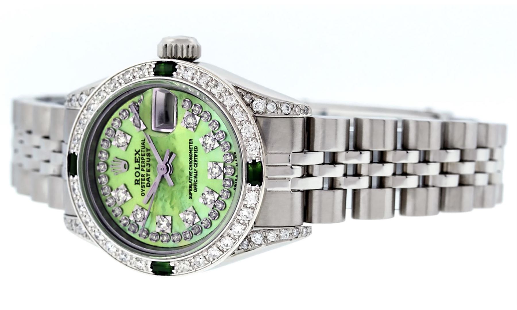 One Ladies Rolex Datejust Polished Bright with Satin Finish, Serviced & Electronically Tested, Stainless Steel Case:26mm, Stainless Steel Crown, Diamond Lugs: 16 Diamonds On Lugs, Clarity: SI-VS, Color: G to H. Custom Bezel: 18K White Gold Beadset Emerald Bezel, Diamond Count: 28 Diamonds + 4 Emeralds, Total Weight 1.00 Carat, Clarity: SI-VS, Color: G to H. Custom Crystal: Synthetic Sapphire Cyclops Lens. Movement: Automatic Winding Movement Caliber 2235. Custom Dial: Refinished Green Mother Of Pearl String Diamond Dial VS, 43 Diamonds in Dial G To H In Color, Clarity: VS. Date Window: 3 O'Clock Position Date Display, Model: No Hole Datejust Quickset. Condition: G-6 Extra Fine. Bracelet: Stainless Steel Jubilee Band. Bright Polish & Satin Finish. 6.0 Inch Length, Adjustable. Standard Clasp, With Rolex Logo.\