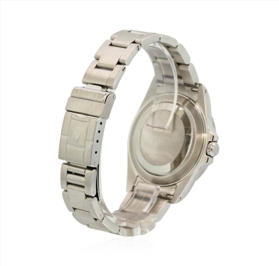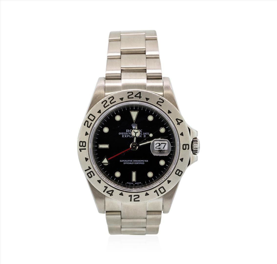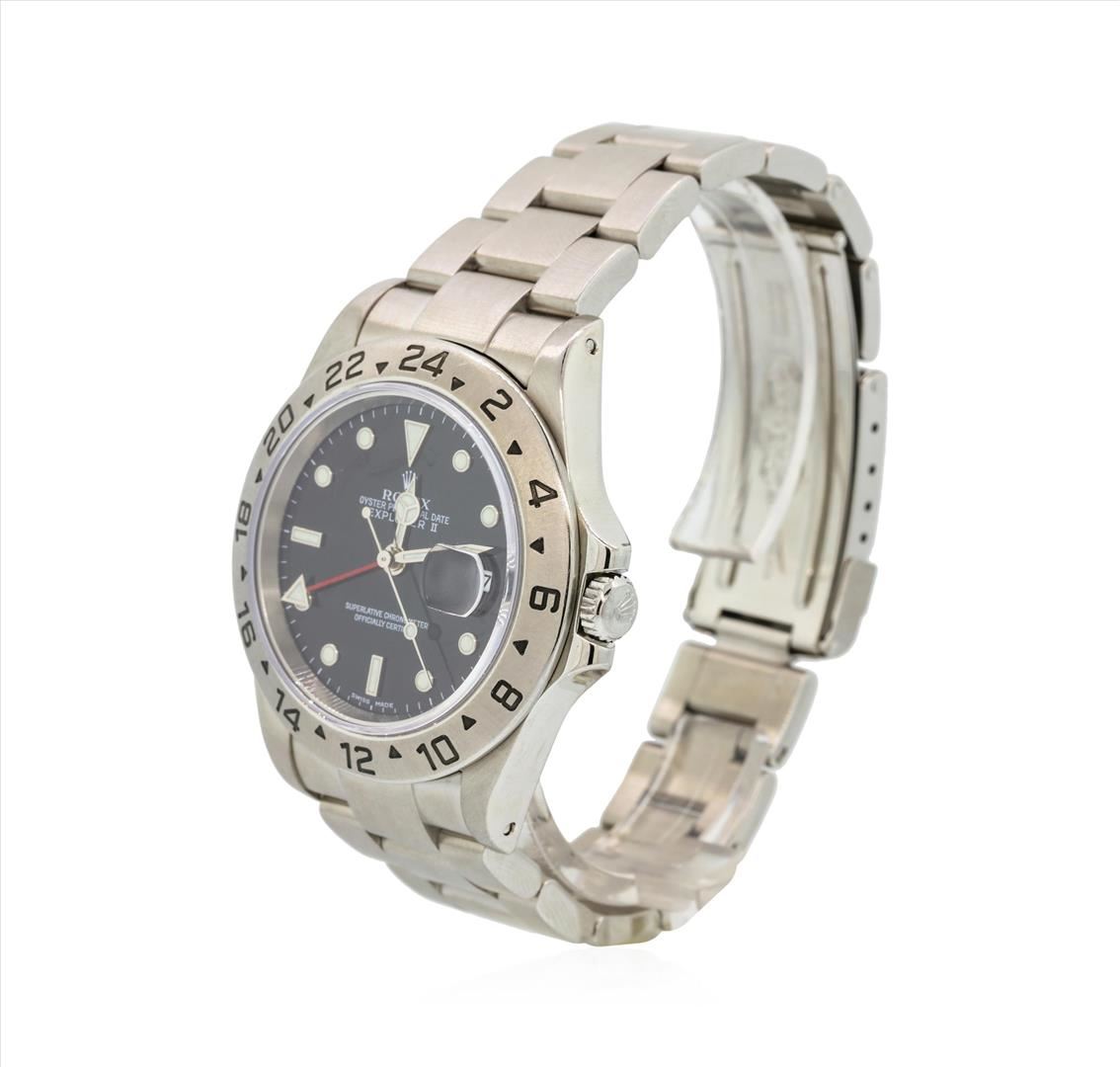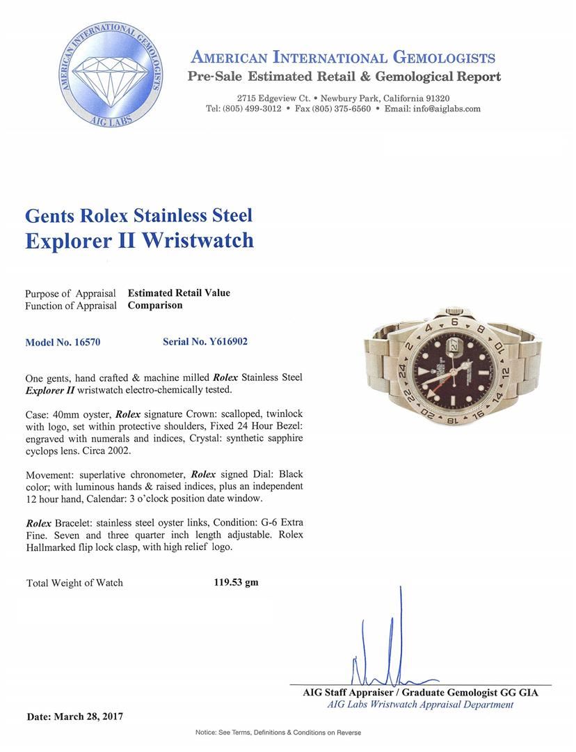 One gents, hand crafted & machine milled Rolex Stainless Steel Explorer II wristwatch electro-chemically tested. Case: 40mm oyster, Rolex signature Crown: scalloped, twin lock with logo, set within protective shoulders, Fixed 24 Hour Bezel: engraved with numerals and indices, Crystal: synthetic sapphire cyclops lens. Circa 2002.Movement: superlative chronometer, Rolex signed Dial: Black color; with luminous hands & raised indices, plus an independent 12 hour hand, Calendar: 3 o'clock position date window. Rolex Bracelet: stainless steel oyster links, Condition: G-6 Extra Fine. Seven and three quarter inch length adjustable. Rolex Hallmarked flip lock clasp, with high relief logo. Total Weight of Watch 119.53gm. AIG Appraised.