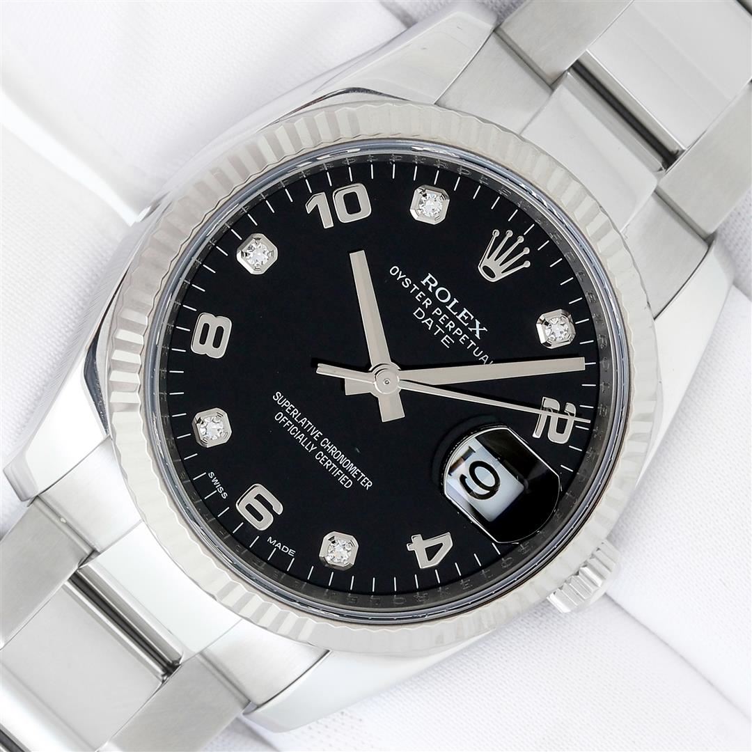 One Pre Owned Stainless Steel Date Polished, Serviced & Electronically Tested, Rolex Stainless Steel Case: 34mm, Rolex Stainless Steel Crown, Rolex Bezel: 18K White Gold Fluted Bezel. Rolex Crystal: Sapphire With Cyclops Lens. Rolex Movement: Automatic Winding Movement. Rolex Dial: Rolex Black Factory Diamond Dial With Arabic Numbers. Date Window: 3 O'Clock Position Date Display, Model: Ceramic Submariner, Quickset, Condition: G-6 Extra Fine. Rolex Bracelet: Stainless Steel Oyster Band. Bright Polish & Satin Finish. 7.0 Inch Length, Adjustable. Standard Clasp, With Rolex Logo.