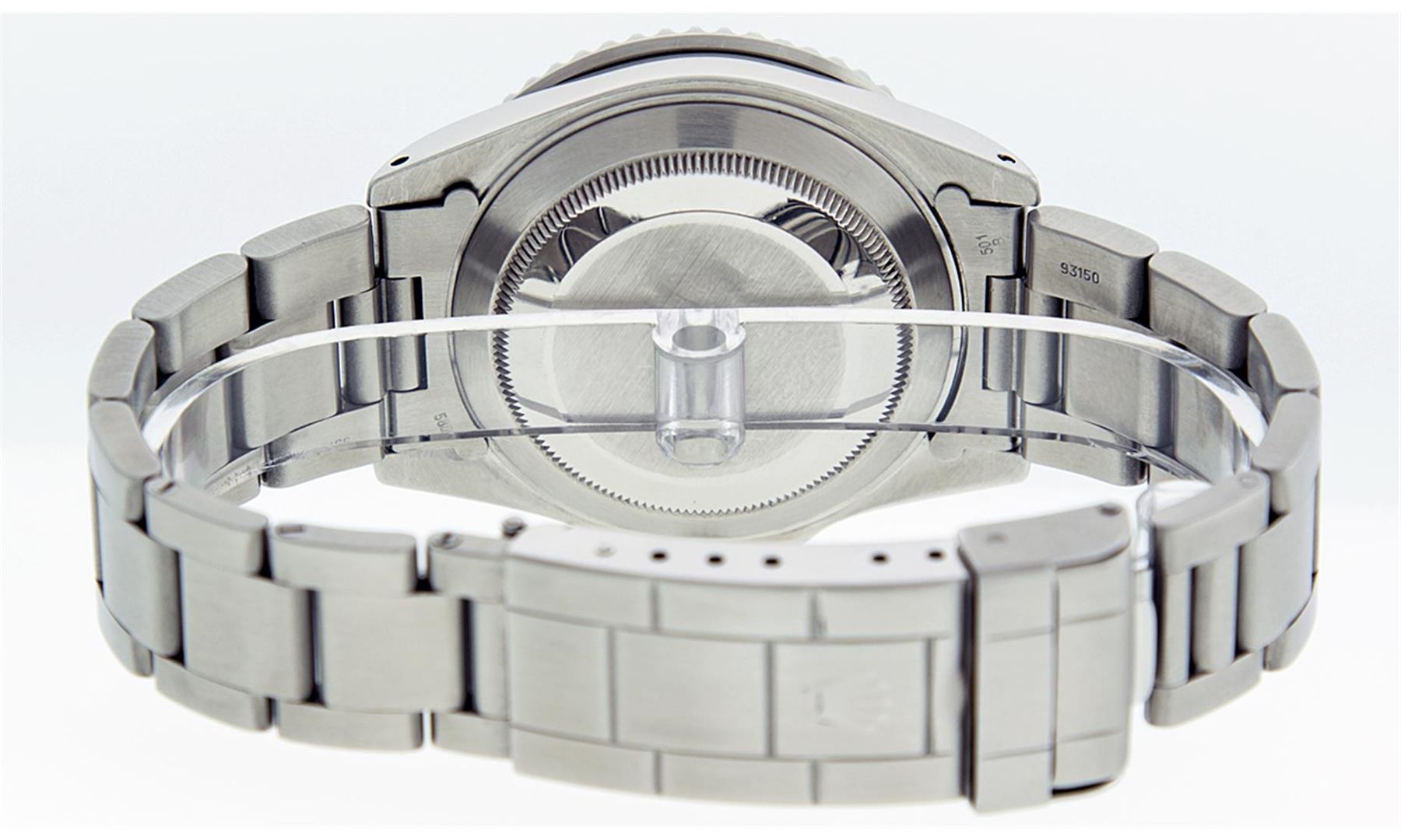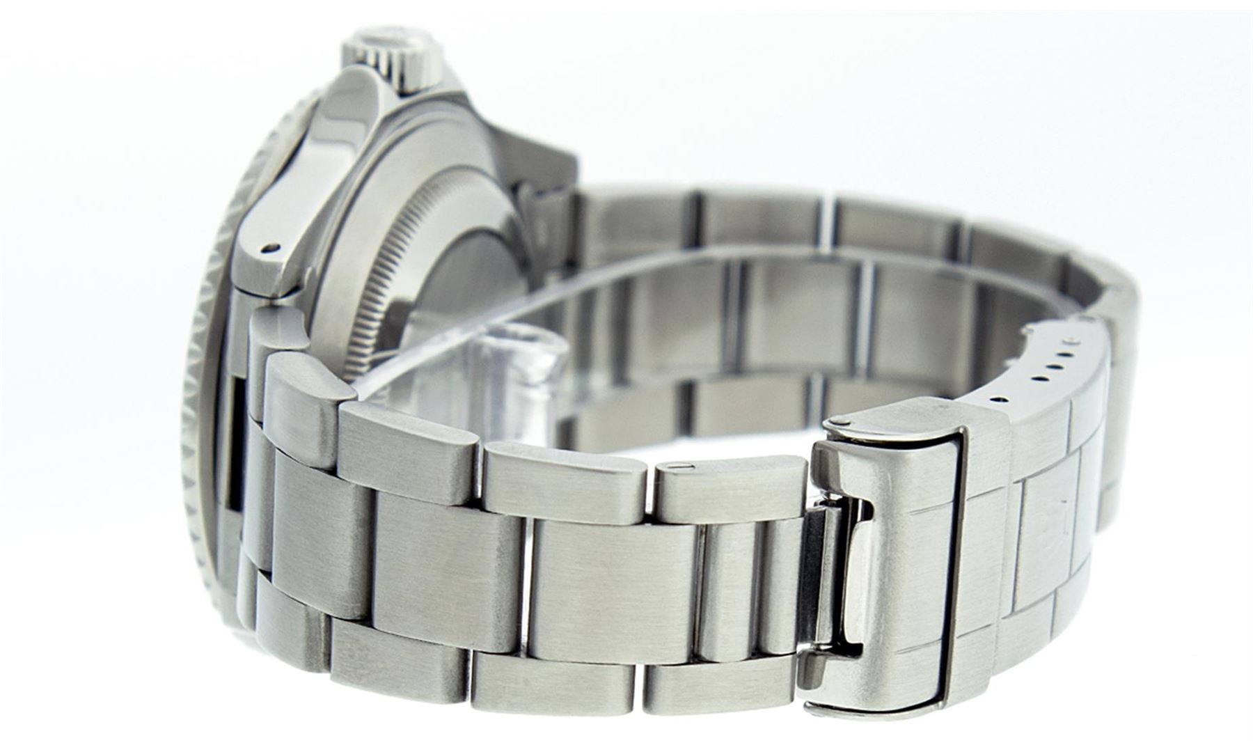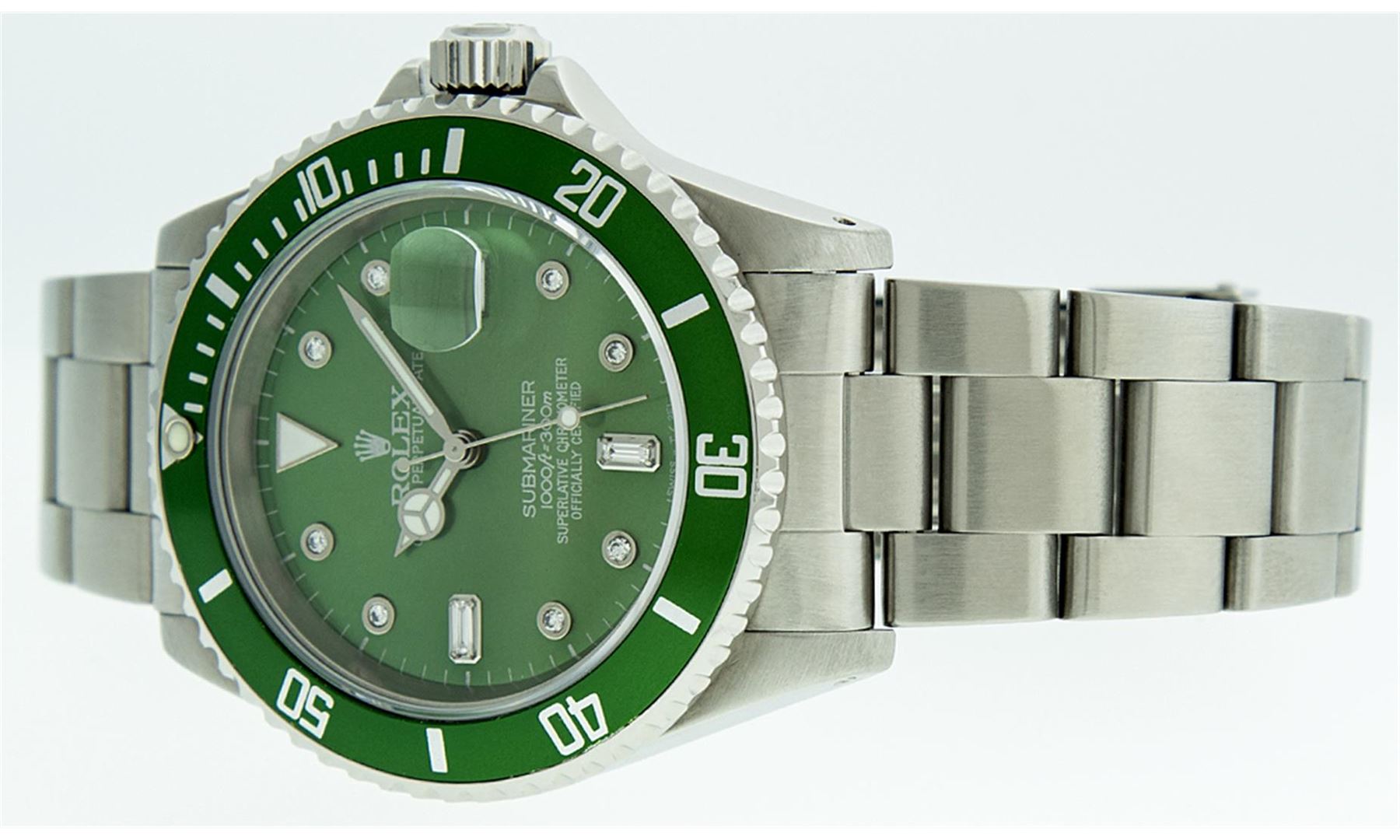 One Mens Rolex Submariner With Date Polished, Serviced & Electronically Tested, Stainless Steel Case:41mm, Stainless Steel Crown, Custom Bezel: Stainless Steel Rotatable Bezel With Custom Green Insert. Crystal: Synthetic Sapphire Cyclops Lens. Movement: Automatic Winding Movement Caliber 3135. Custom Dial: Green Diamond 8 + 2, Diamond Count: 8 Diamonds + 2 Baguettes In Dial, Color: G To H, Clarity: SI-VS. Date Window: 3 O'Clock Position Date Display, Model: Submariner 16610, Quickset, Condition: G-6 Extra Fine. Bracelet: Stainless Steel Oyster. Bright Polish & Satin Finish. 7.0 Inch Length, Adjustable. Standard Clasp, With Rolex Logo.