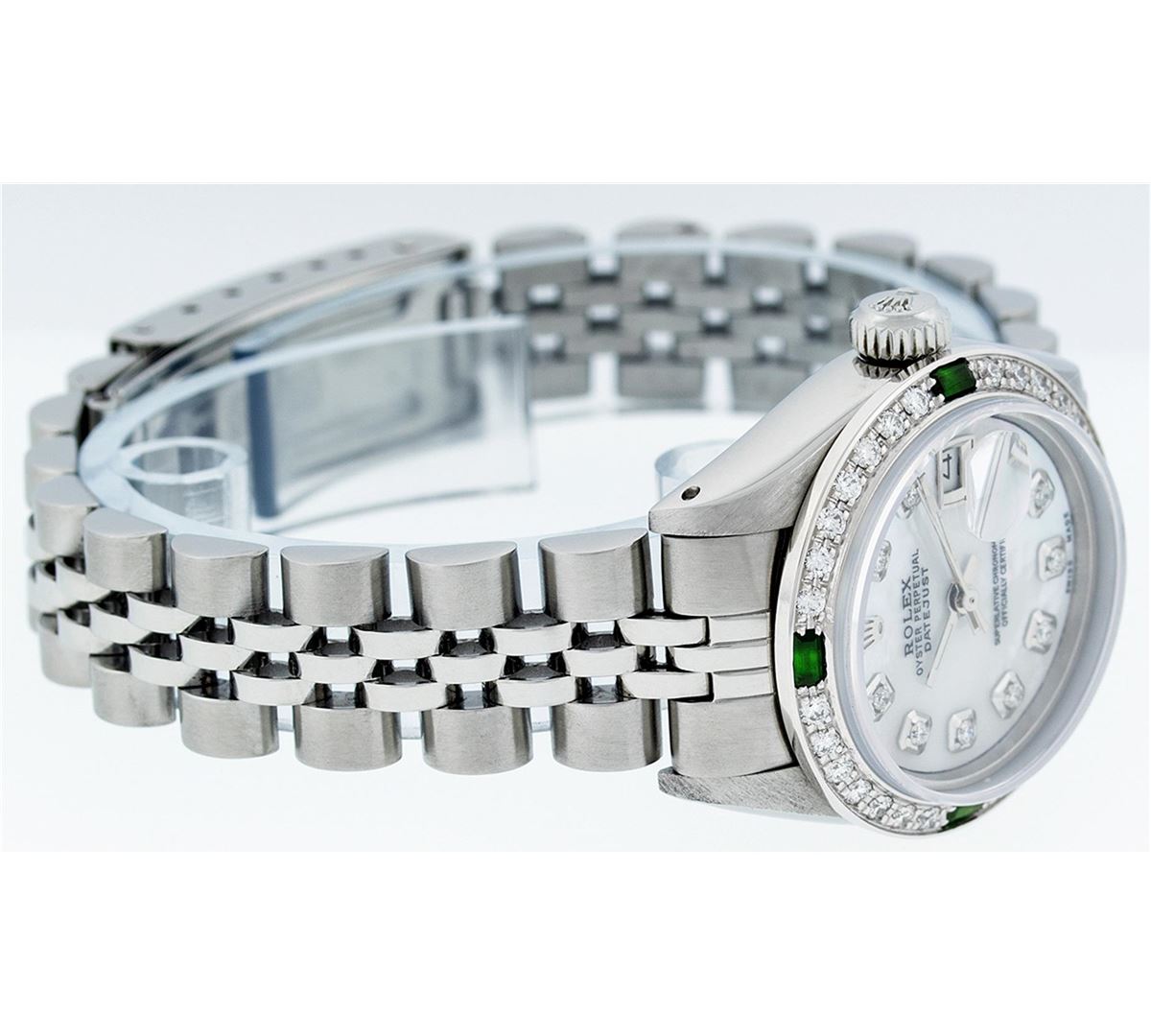 One Ladies Rolex Datejust Polished Bright with Satin Finish, Serviced & Electronically Tested, Stainless Steel Case:26mm, Stainless Steel Crown, Custom Bezel: 18K White Gold Emerald Beadset Diamond Bezel, Diamond + Gem Count: 28 Diamonds + 4 Emeralds. Total Weight .70 Carat, Clarity: SI-VS, Color: G to H. Custom Crystal: Synthetic Sapphire Cyclops Lens. Movement: Automatic Winding Movement Caliber 2030. Custom Dial: Refinished Mother Of Pearl With Diamond Hour Markers, 10 Diamond in Dial G To H In Color, Clarity: SI-VS. Date Window: 3 O'Clock Position Date Display, Model: Datejust. Condition: G-6 Extra Fine. Bracelet: Stainless Steel Jubilee. Bright Polish & Satin Finish. 6.0 Inch Length, Adjustable. Standard Clasp, With Rolex Logo.